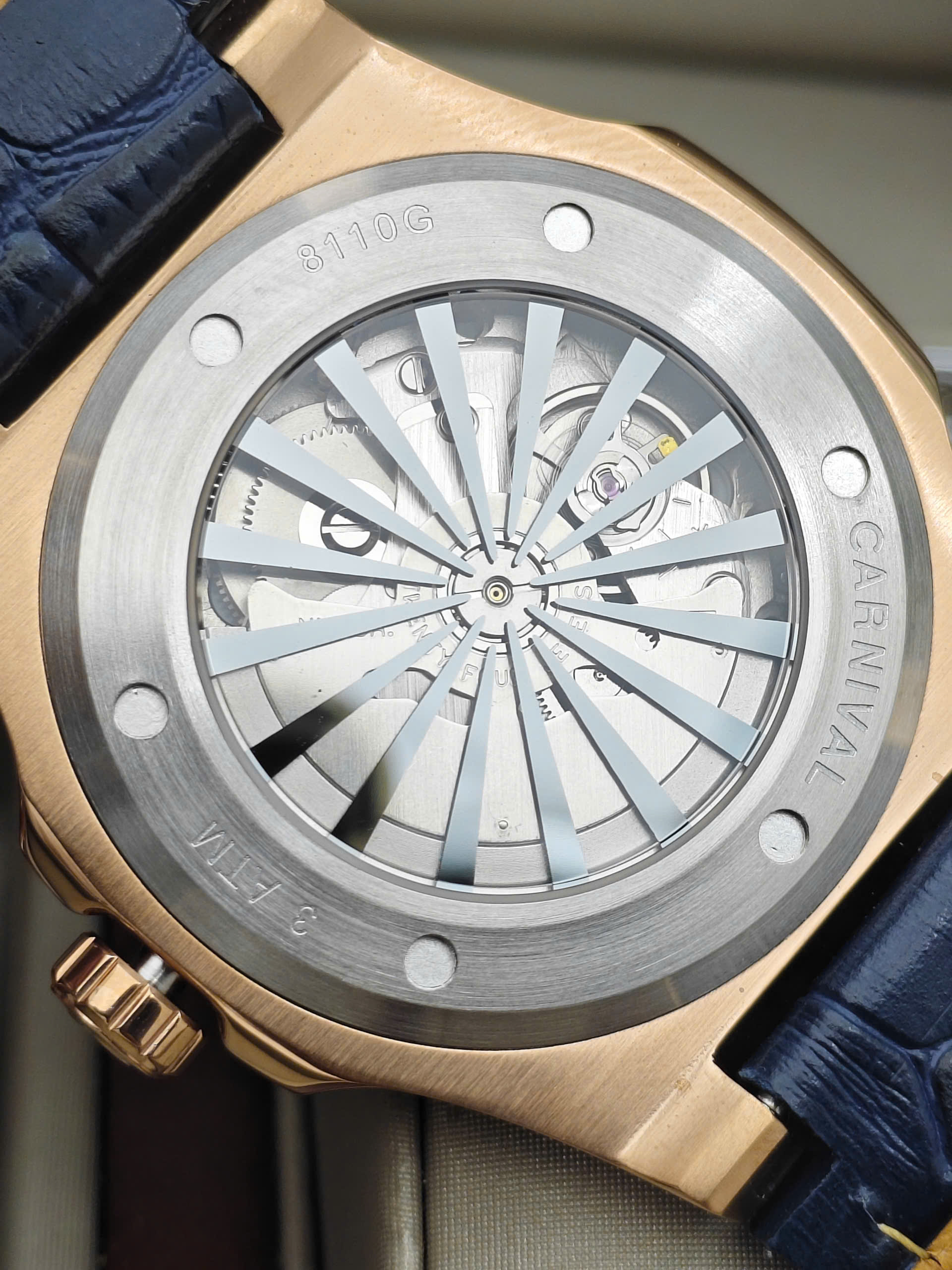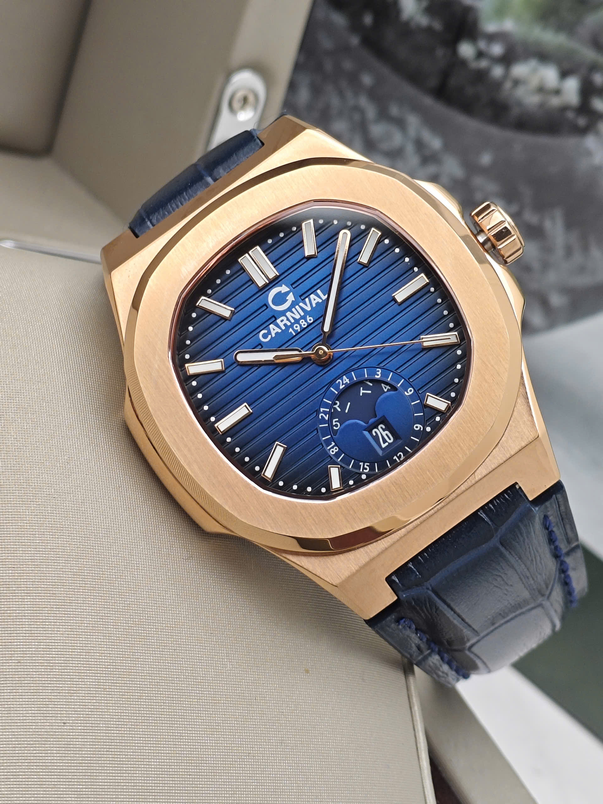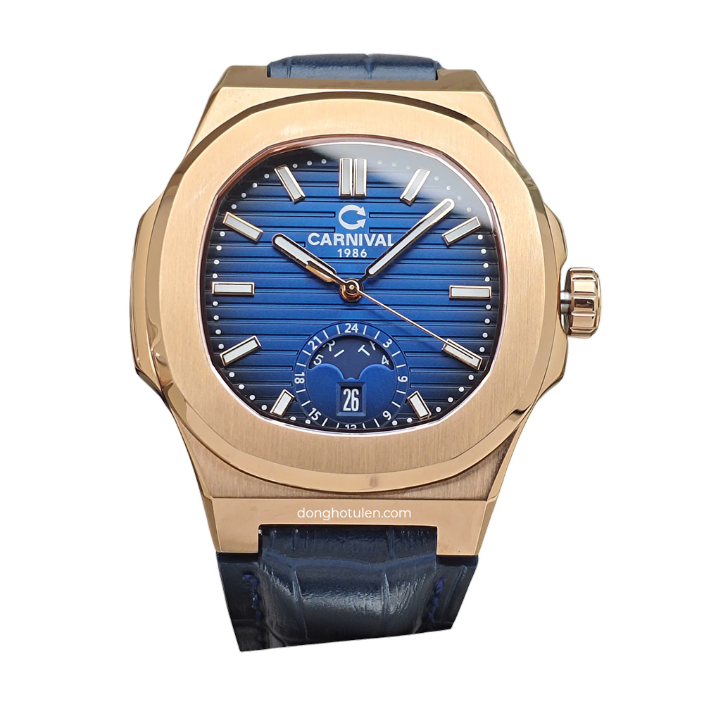 Carnival 8110G1-VH-DD-X được trang bị bộ máy cơ Automatic (tự động) tinh xảo với khả năng trữ cót lên đến 42 tiếng, cho phép đồng hồ hoạt động chính xác và bền bỉ theo thời gian mà không cần dùng pin. Để bảo vệ tối đa cho bộ máy bên trong, hãng đã sử dụng mặt kính Sapphire nguyên khối chống trầy xước vượt trội cùng vỏ thép không gỉ chắc chắn. Sự kết hợp giữa dây da cao cấp mềm mại và các chi tiết dạ quang trên kim số giúp người đeo không chỉ cảm thấy thoải mái mà còn dễ dàng theo dõi thời gian ngay cả trong điều kiện thiếu sáng.