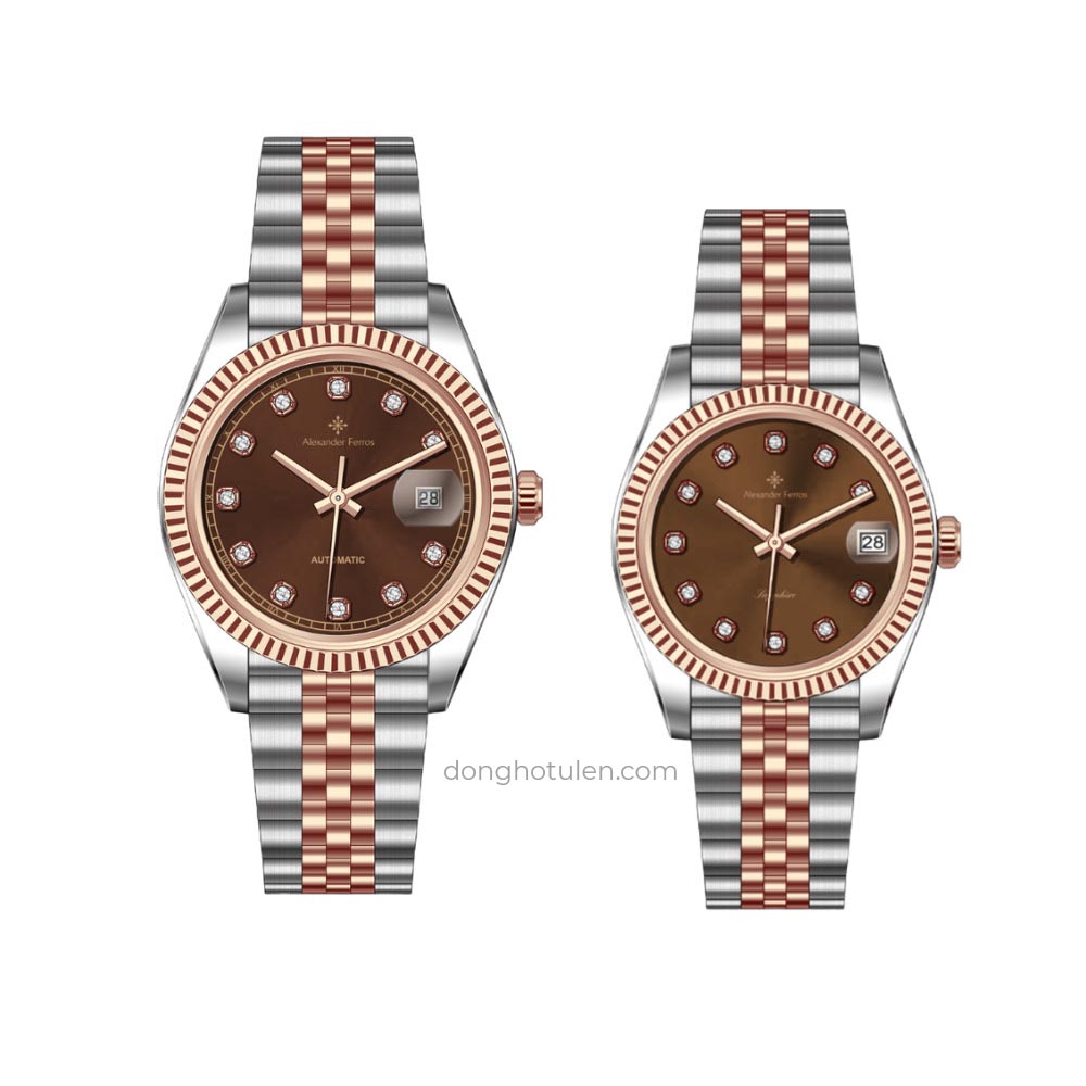 Cặp đôi Alexander Ferros 8132D/08-8222D/08 mang đến một sự giao thoa hoàn hảo giữa nét mạnh mẽ của phái mạnh và sự thanh tú của phái đẹp. Cả hai đều sở hữu tông màu vàng hồng chủ đạo (Rose Gold) cực kỳ thời thượng, kết hợp cùng mặt số màu trắng bạc sang trọng. Điểm nhấn đặc biệt nằm ở các cọc số đính đá lấp lánh, tạo nên một “dải ngân hà” thu nhỏ trên cổ tay, biểu trưng cho sự gắn kết bền chặt và tỏa sáng cùng nhau qua thời gian.