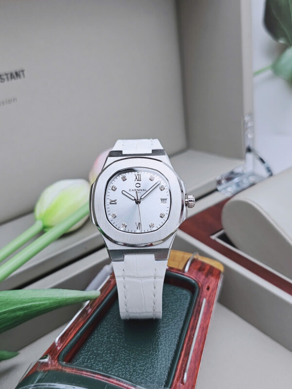 Đồng hồ nữ Carnival 8160L-VT-DD-T1 là sự kết hợp hoàn hảo giữa tinh tế Thụy Sỹ và phong cách thanh lịch hiện đại. Thiết kế mặt số 34mm nhỏ gọn cùng tông trắng trang nhã giúp tôn lên vẻ đẹp nữ tính, phù hợp cho cả đi làm lẫn dự tiệc. Vỏ thép không gỉ màu bạc sáng bóng kết hợp dây da trắng mềm mại mang lại cảm giác đeo thoải mái. Đây là lựa chọn lý tưởng cho những quý cô yêu thích sự tối giản nhưng vẫn nổi bật.