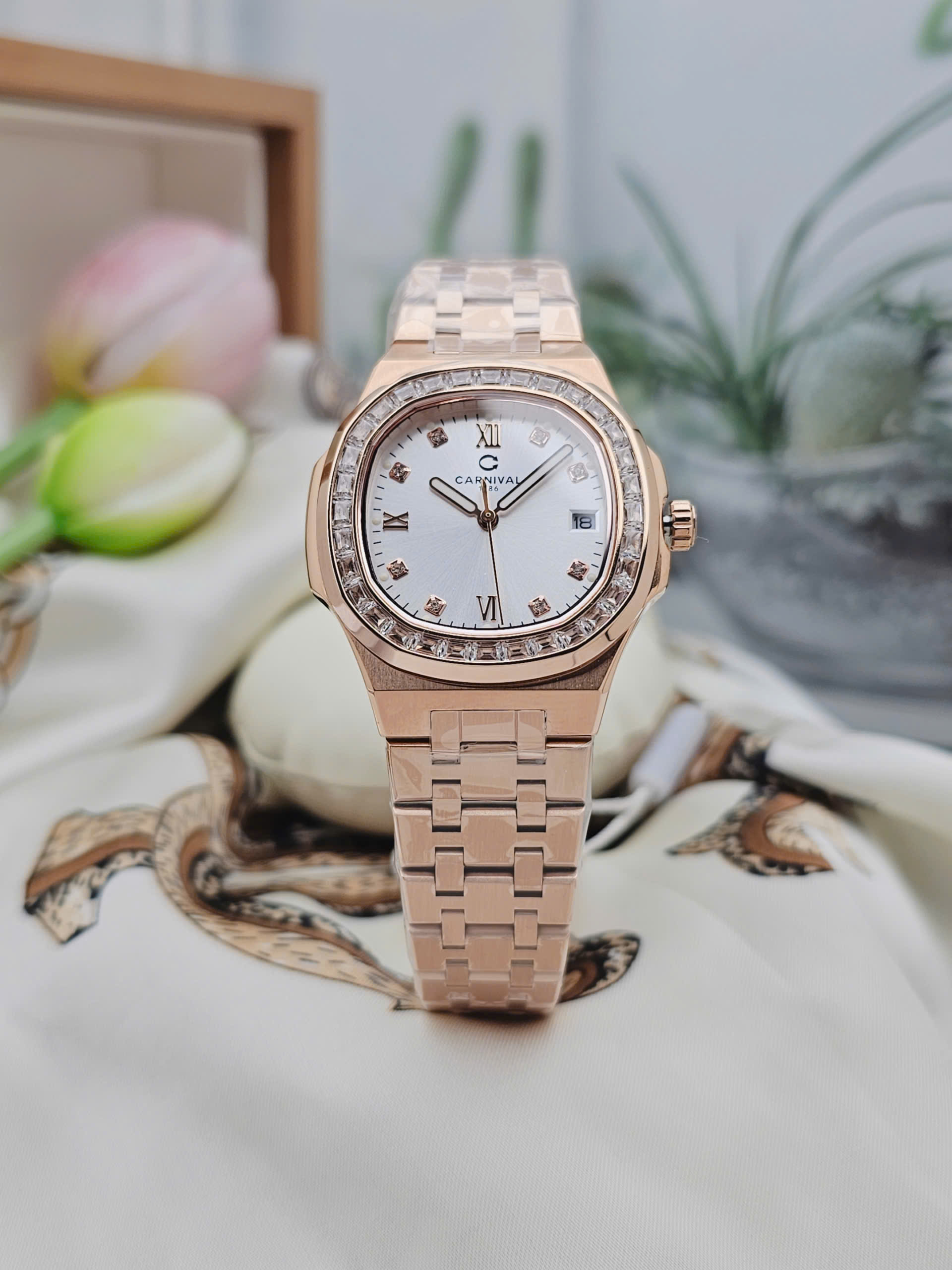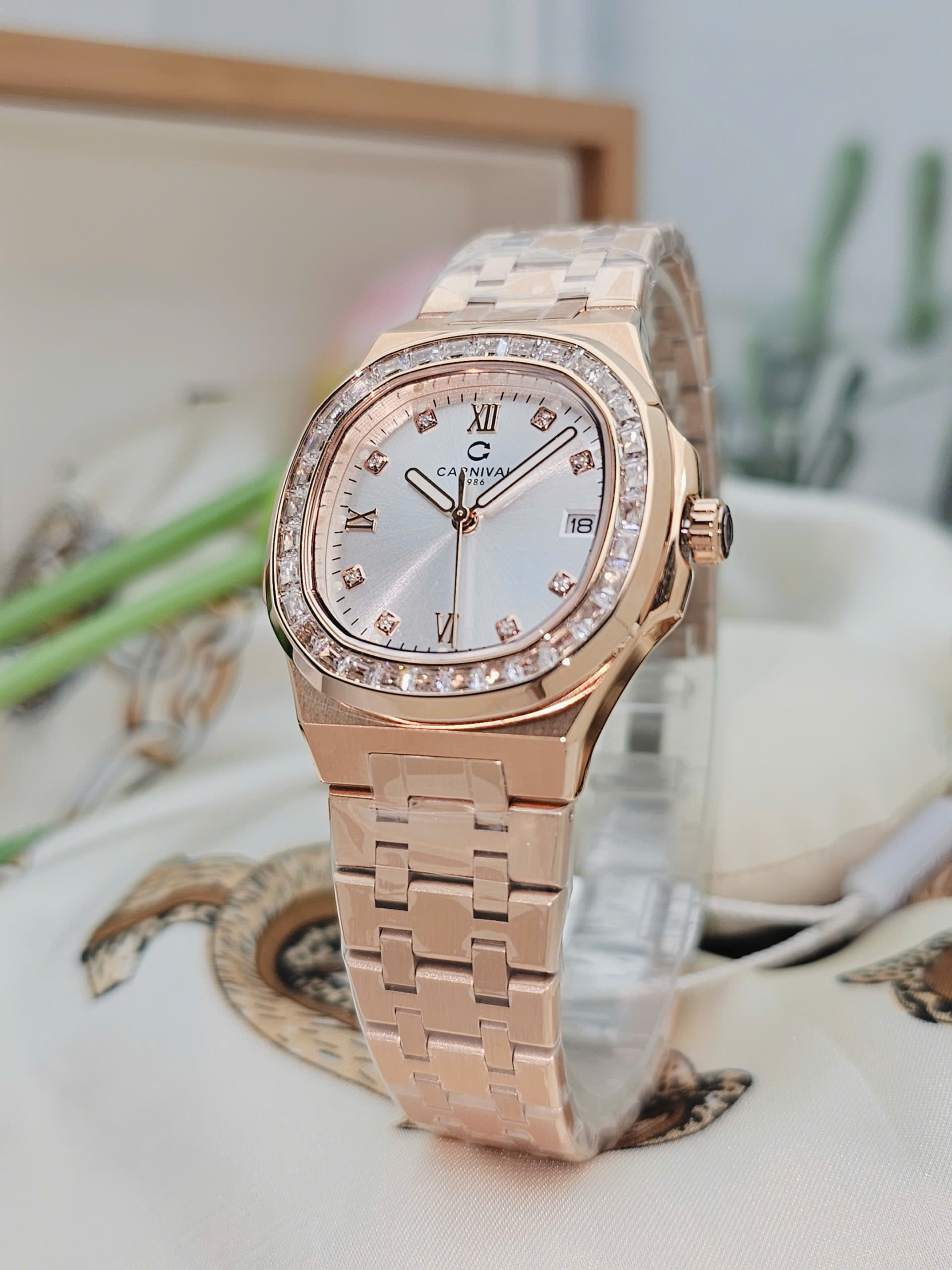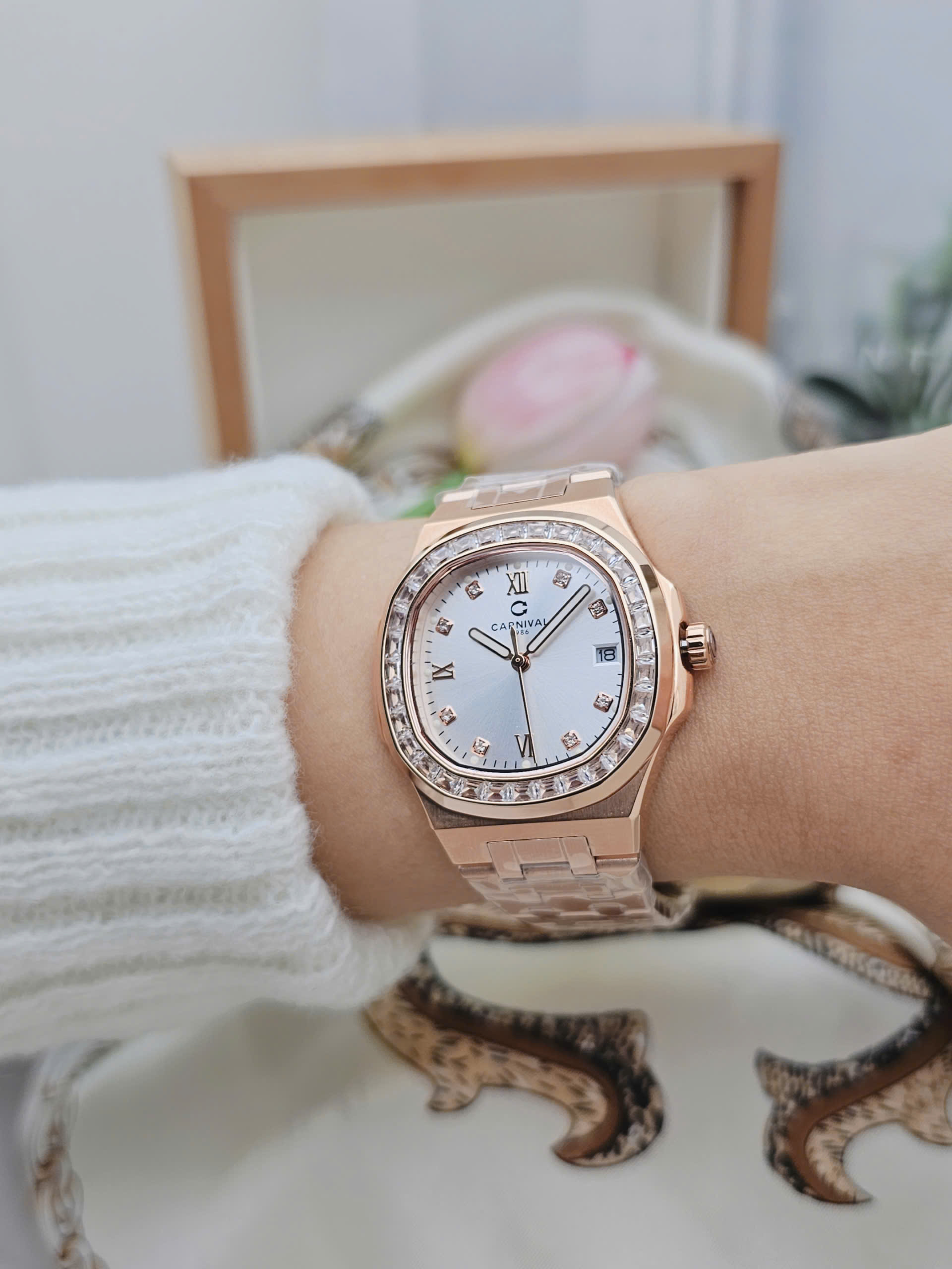 Đồng hồ nữ Carnival 8160L2-VH-T thuộc dòng sản phẩm 8160L đến từ thương hiệu Thụy Sỹ, nổi bật với thiết kế thanh lịch và tông màu vàng hồng (Rosegold) thời thượng. Sở hữu đường kính mặt số 34mm cùng độ dày chỉ 7.8mm, mẫu đồng hồ nữ Carnival mang đến vẻ đẹp mỏng nhẹ, tinh tế và cực kỳ tôn cổ tay phái đẹp. Đây là lựa chọn lý tưởng cho những ai đang tìm kiếm đồng hồ nữ Carnival chính hãng phong cách sang trọng, nữ tính.
