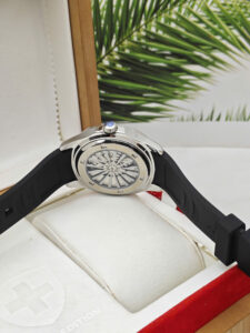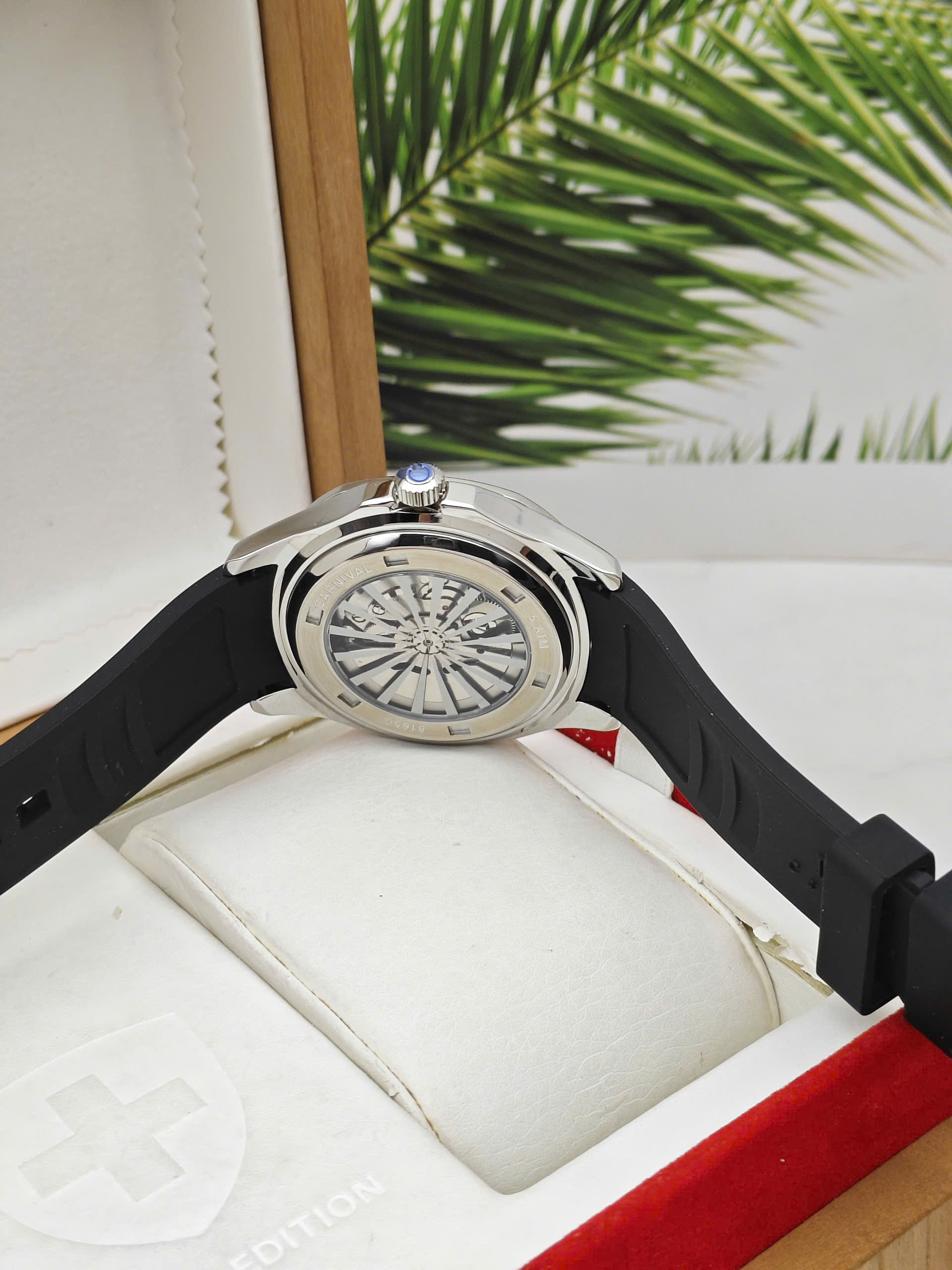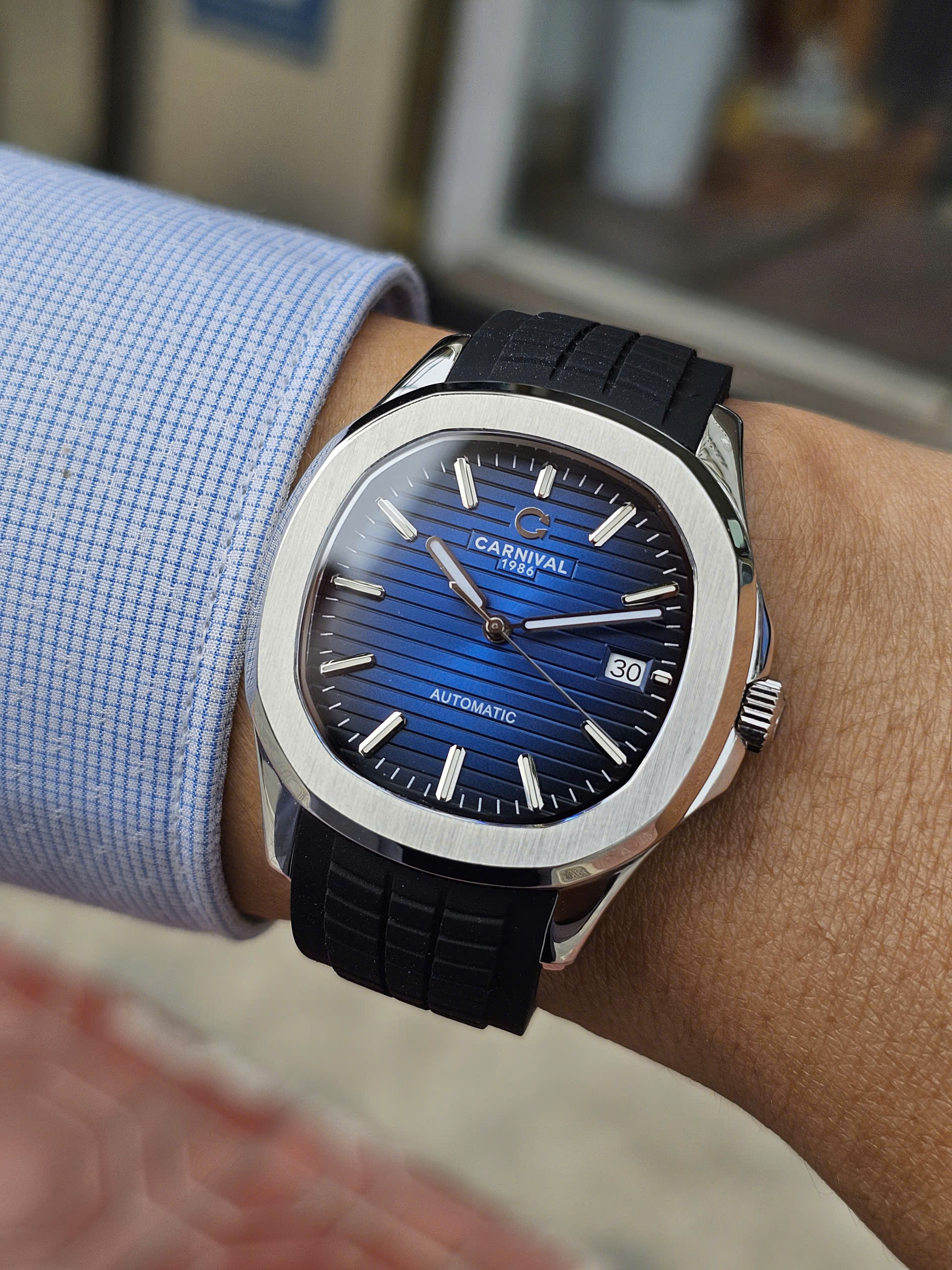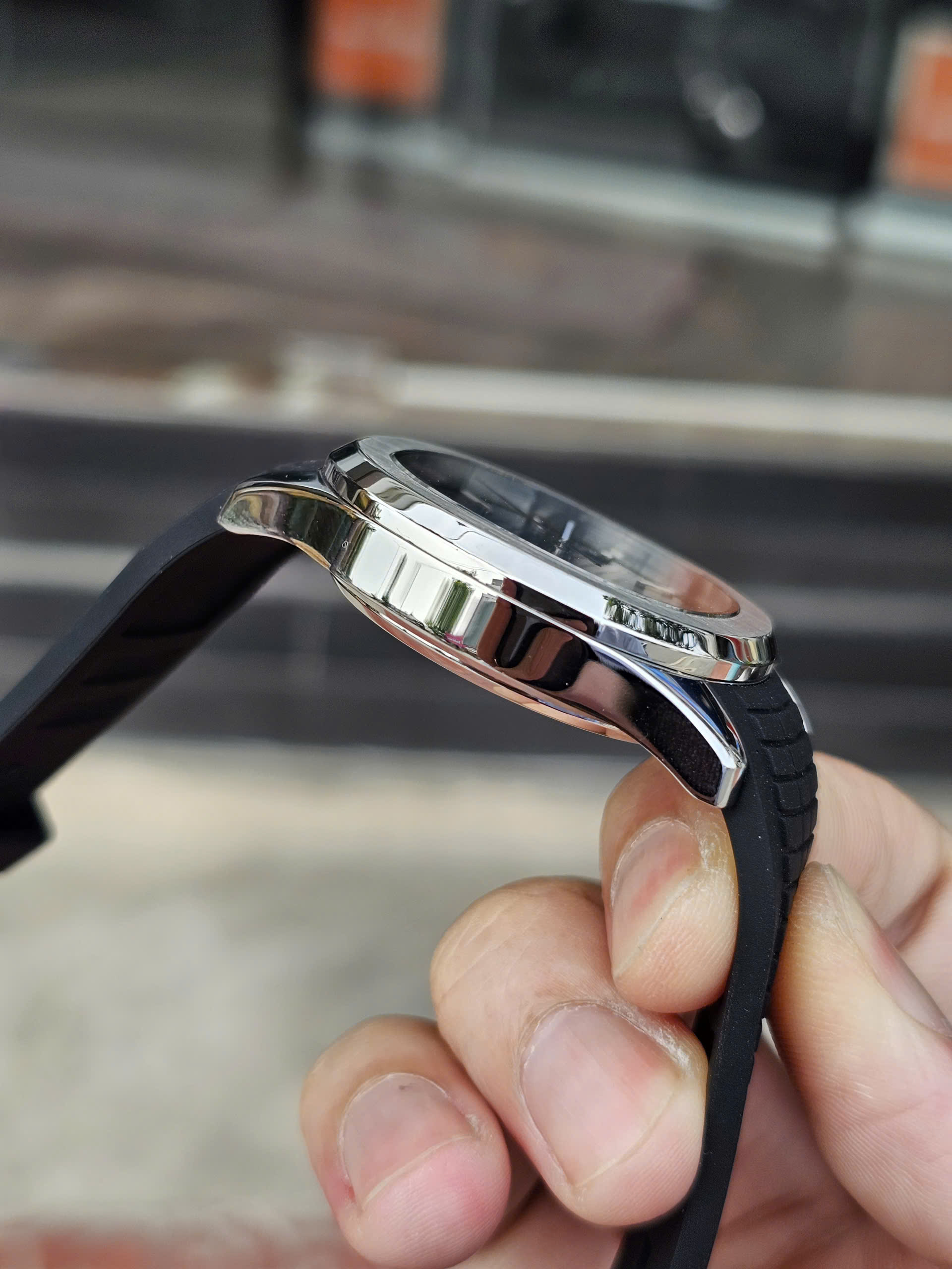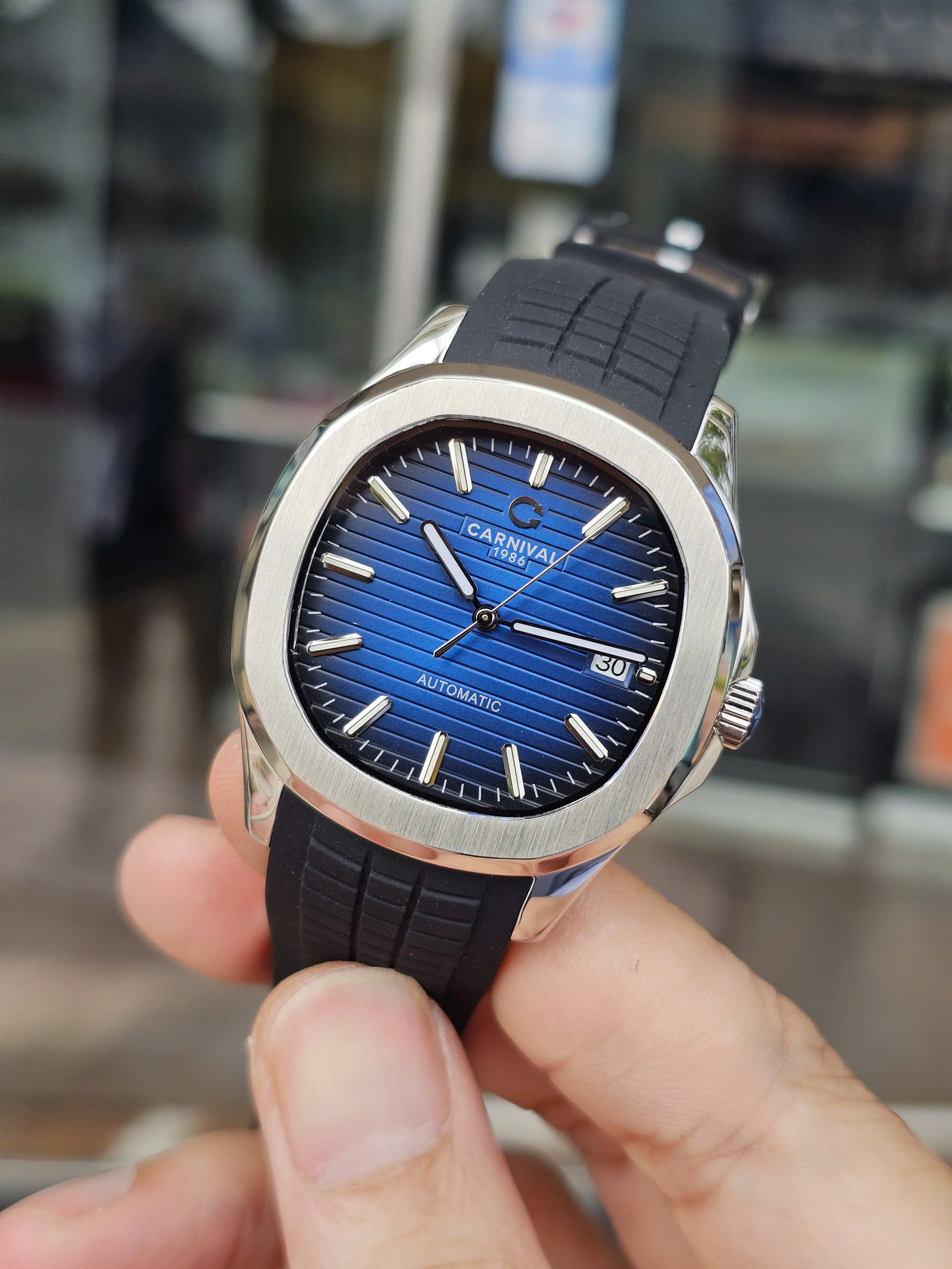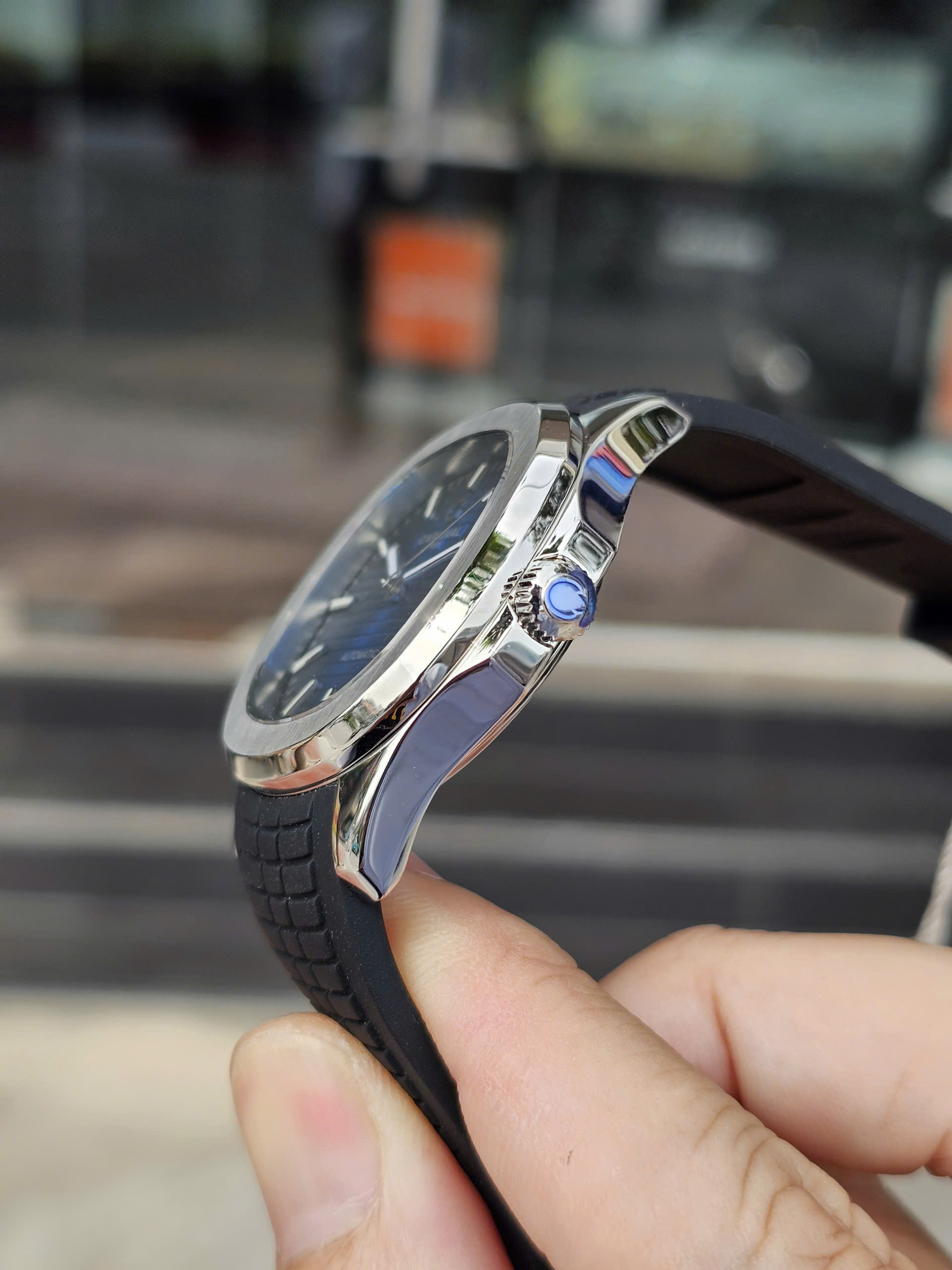 Đồng hồ sử dụng bộ máy cơ tự động Nhật Bản bền bỉ. Mặt kính Sapphire chống trầy xước tốt, đường kính 40 mm phù hợp phần lớn cổ tay nam giới. Vỏ thép không gỉ 316L sáng bóng, dây cao su ôm tay và chịu nước tốt, mang lại phong cách thể thao. Khả năng chống nước 5 ATM cho phép đeo khi rửa tay, đi mưa nhẹ hoặc tắm vòi sen, nhưng không phù hợp bơi lặn sâu.