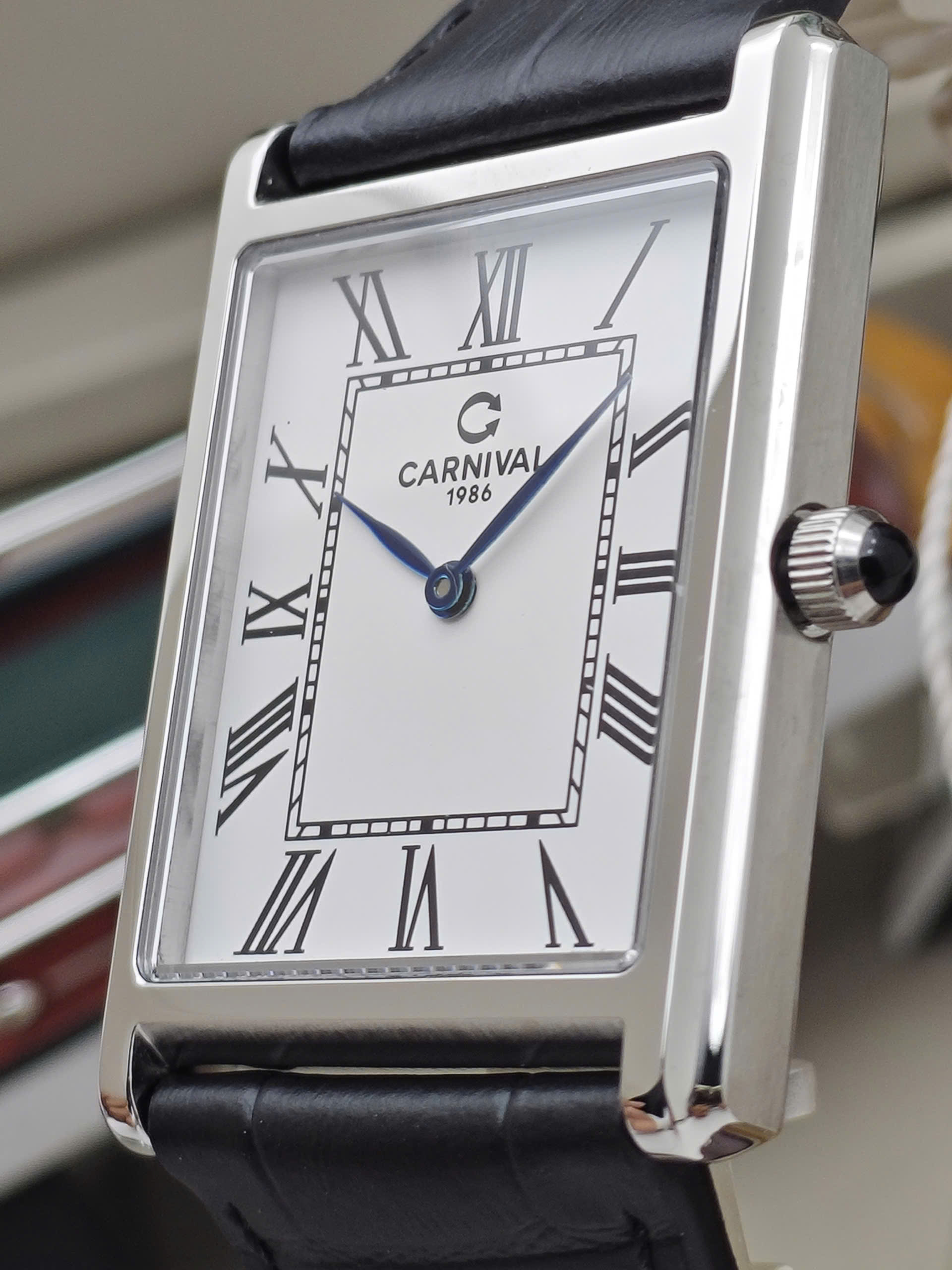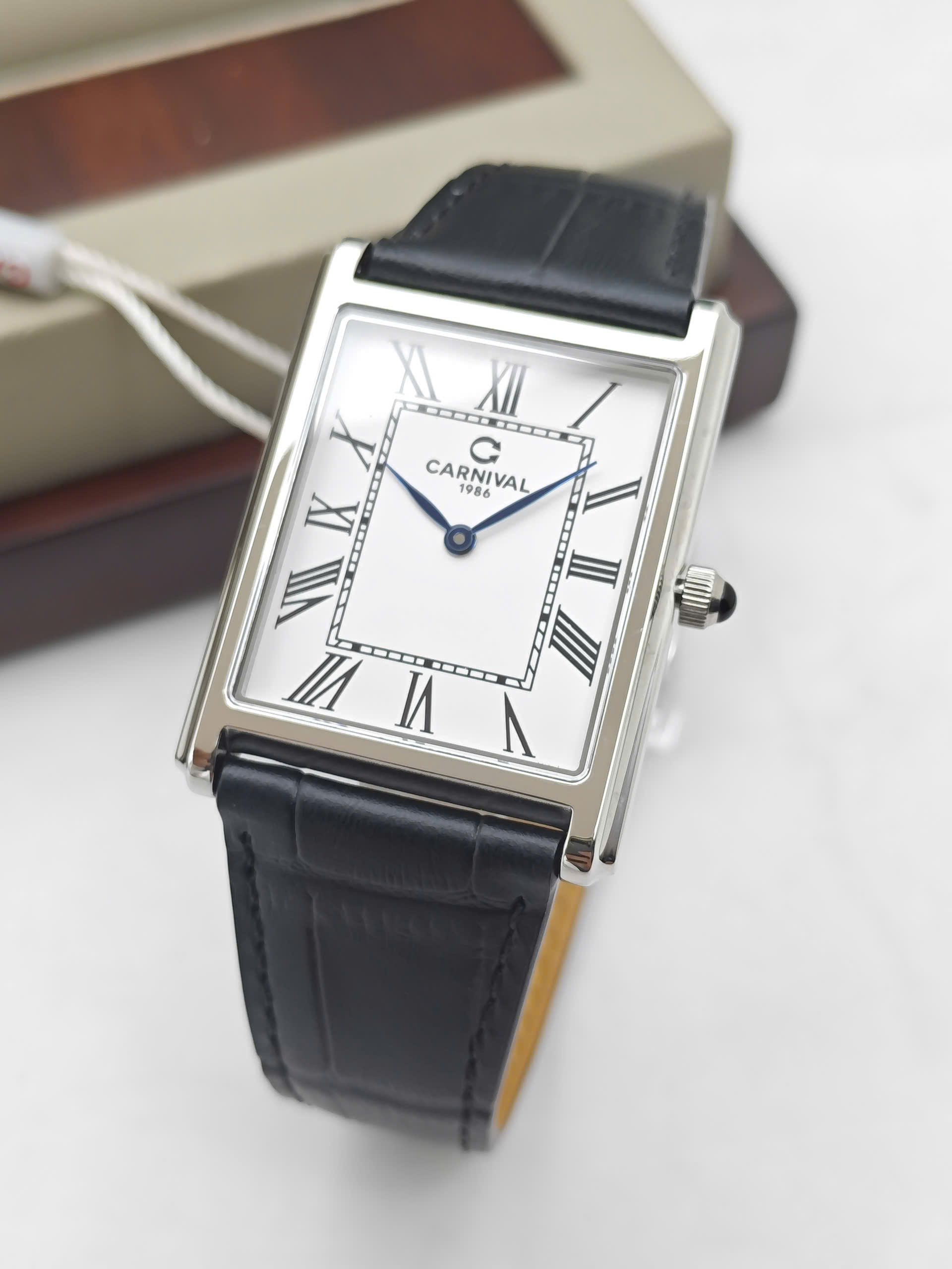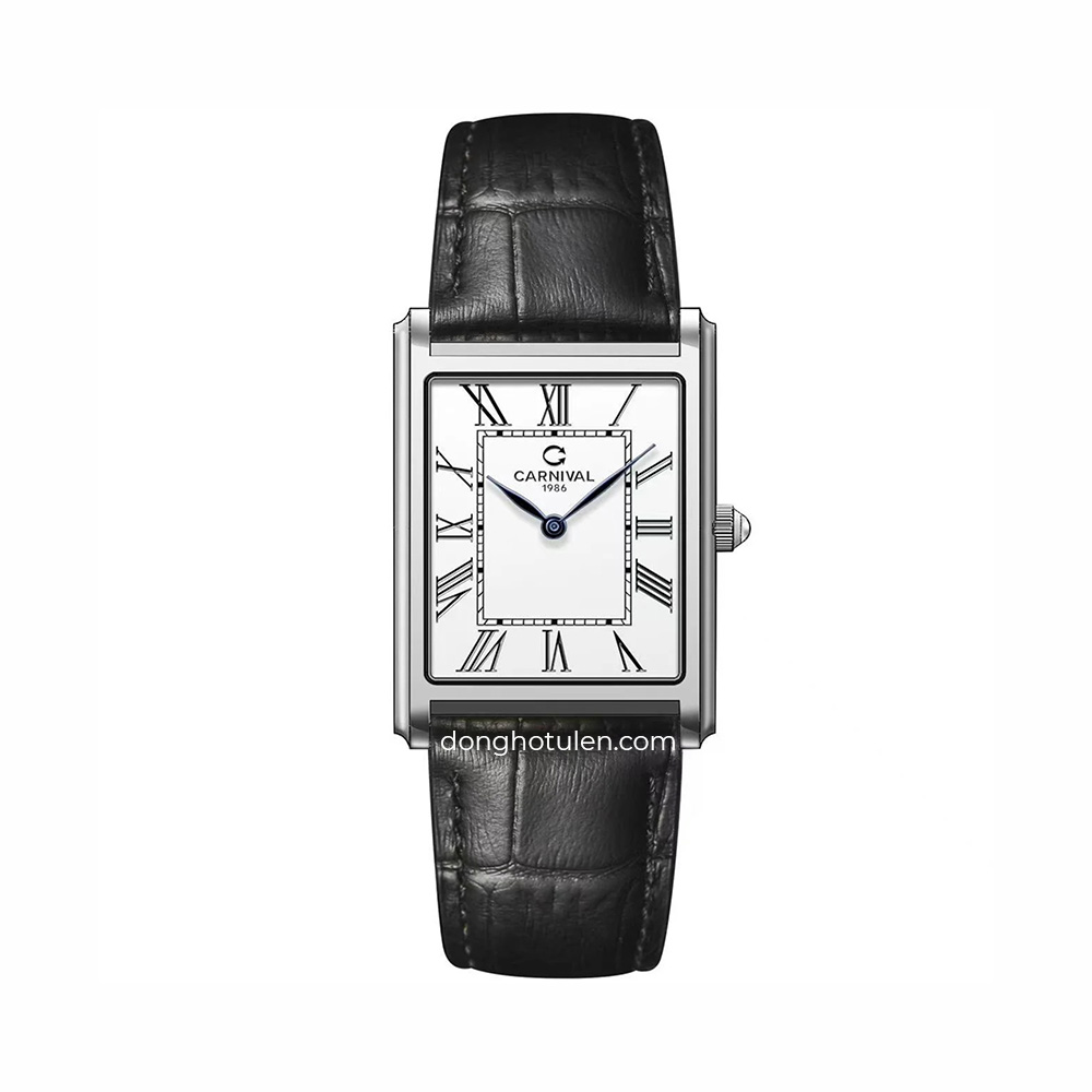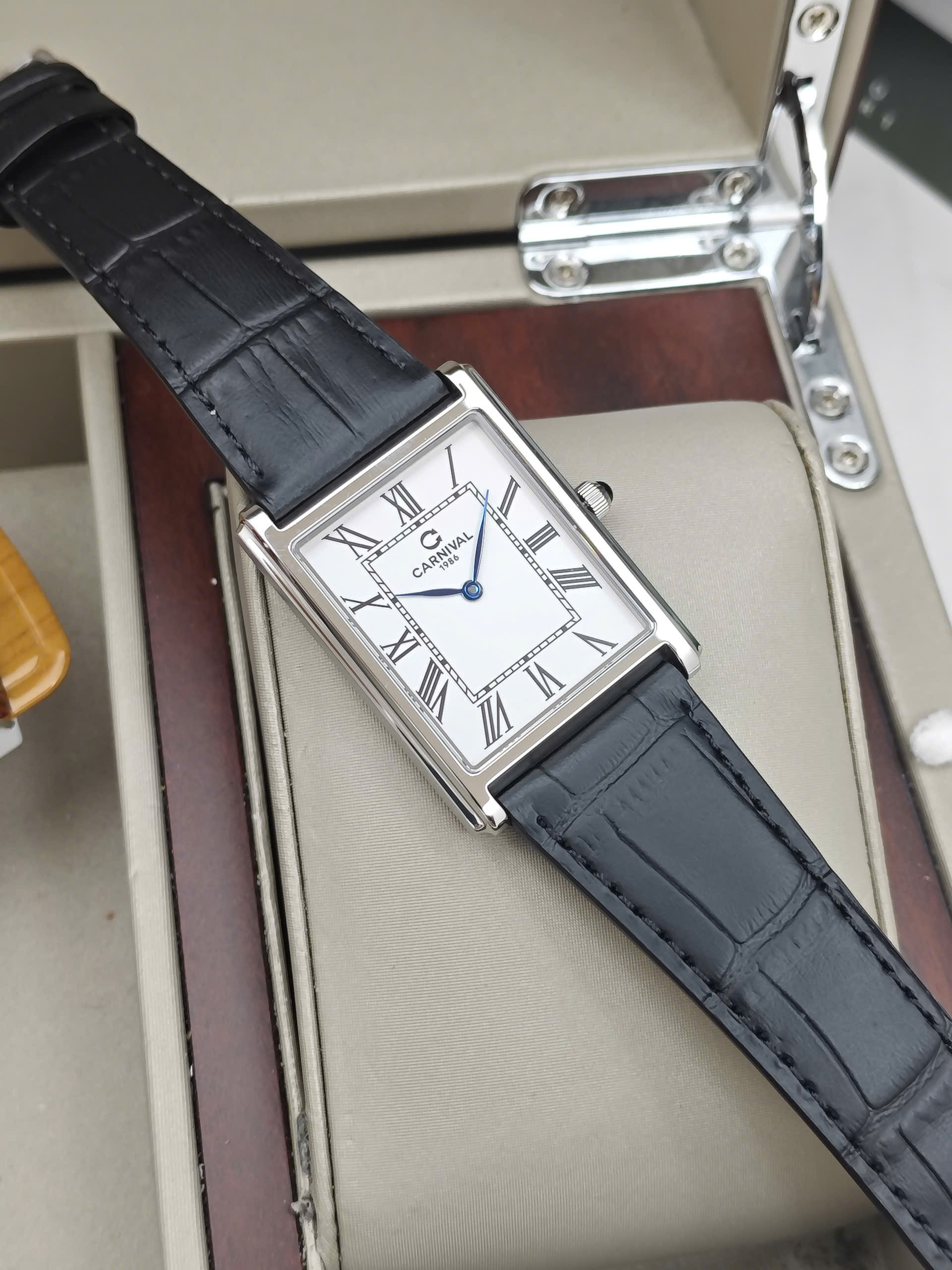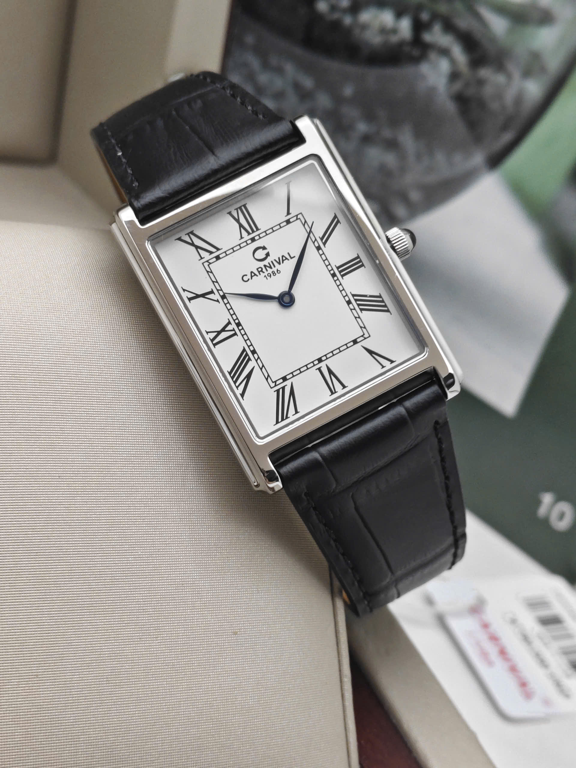 Đồng hồ Carnival 8231G-VT-DD-T tái hiện hoàn hảo phong cách Tank kinh điển với thiết kế mặt hình chữ nhật đầy nam tính và khác biệt. Sự phối hợp giữa bộ vỏ tông trắng sang trọng cùng mặt số trắng trang nhã tạo nên một vẻ đẹp đậm chất quý tộc châu Âu. Điểm nhấn đắt giá của mẫu đồng hồ này chính là bộ kim xanh thanh mảnh nổi bật và núm chỉnh giờ được đính đá cabochon xanh tinh xảo, mang lại sự cuốn hút khó cưỡng ngay từ cái nhìn đầu tiên. Với thiết kế mỏng nhẹ chỉ 6.5mm, sản phẩm không chỉ là công cụ xem giờ mà còn là món phụ kiện khẳng định gu thẩm mỹ riêng biệt, không hòa lẫn với số đông.