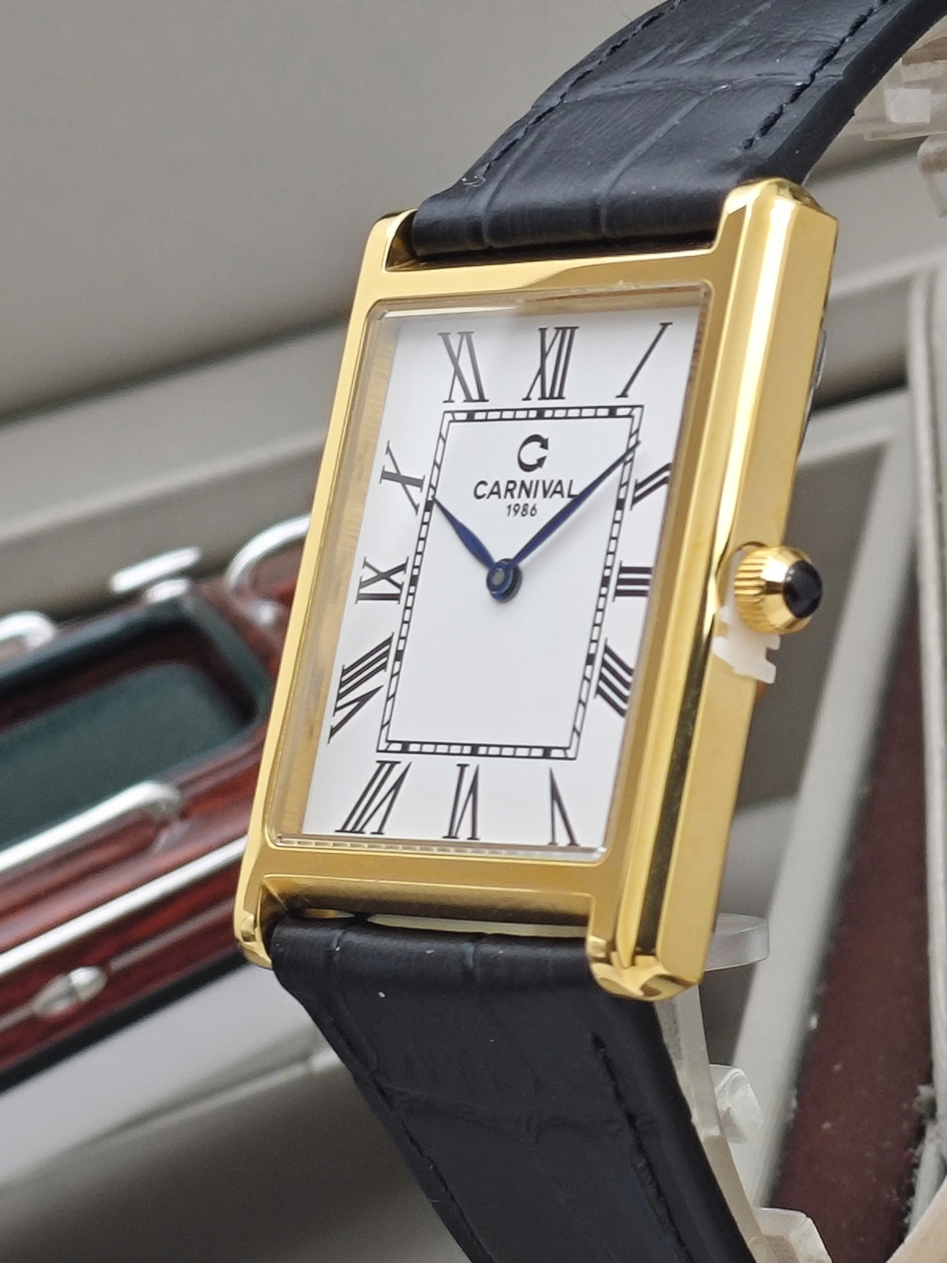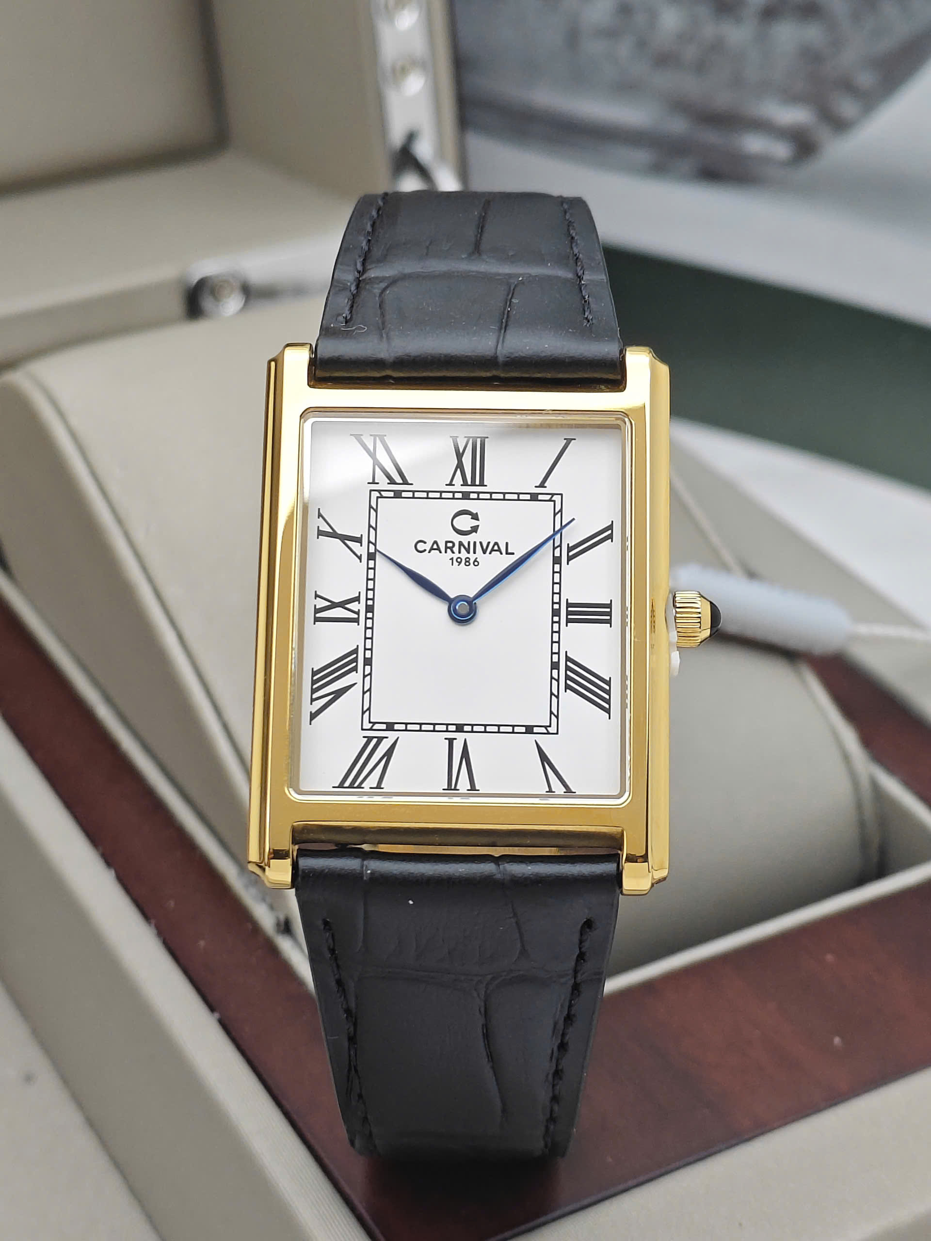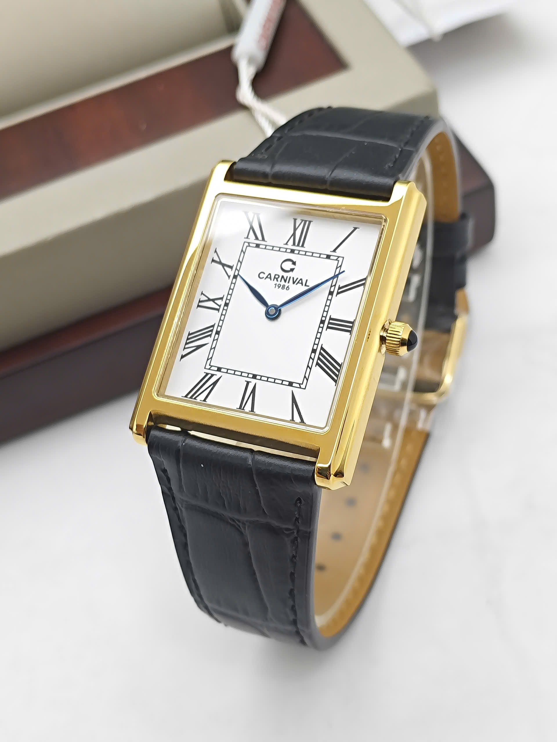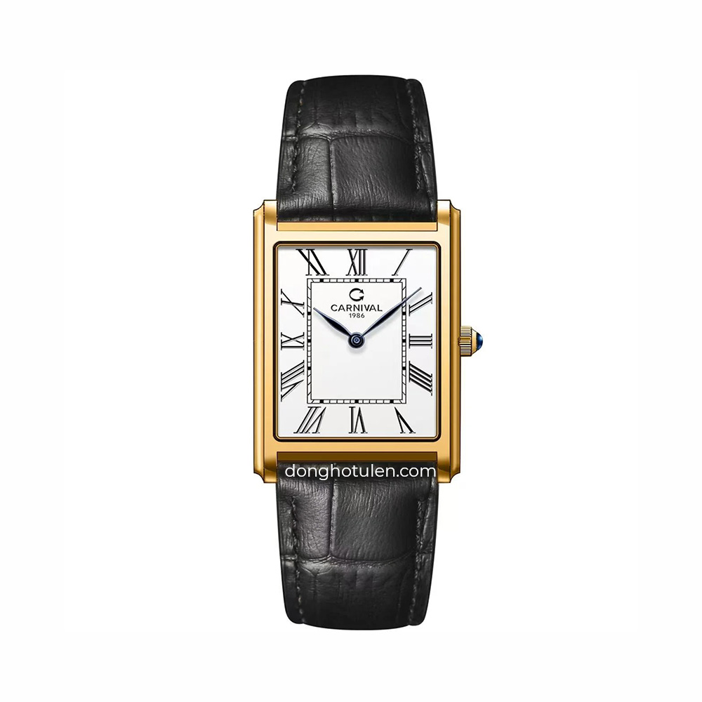 Đồng hồ Carnival 8231G-VV-DD-T tái hiện hoàn hảo phong cách Tank kinh điển với thiết kế mặt hình chữ nhật đầy nam tính và khác biệt. Sự phối hợp giữa bộ vỏ tông vàng sang trọng cùng mặt số trắng trang nhã tạo nên một vẻ đẹp đậm chất quý tộc châu Âu. Điểm nhấn đắt giá của mẫu đồng hồ này chính là bộ kim xanh thanh mảnh nổi bật và núm chỉnh giờ được đính đá cabochon xanh tinh xảo, mang lại sự cuốn hút khó cưỡng ngay từ cái nhìn đầu tiên. Với thiết kế mỏng nhẹ chỉ 6.5mm, sản phẩm không chỉ là công cụ xem giờ mà còn là món phụ kiện khẳng định gu thẩm mỹ riêng biệt, không hòa lẫn với số đông.