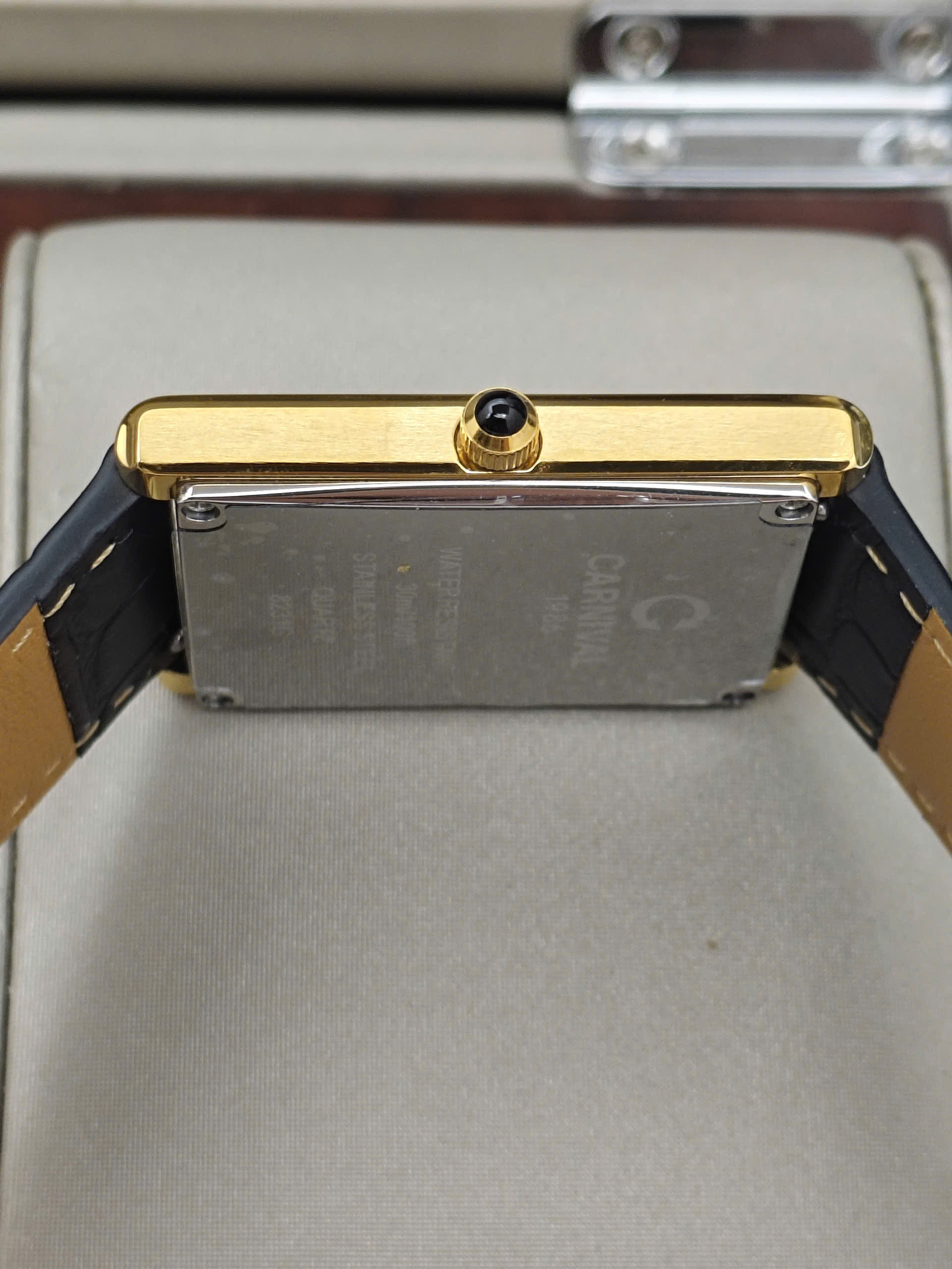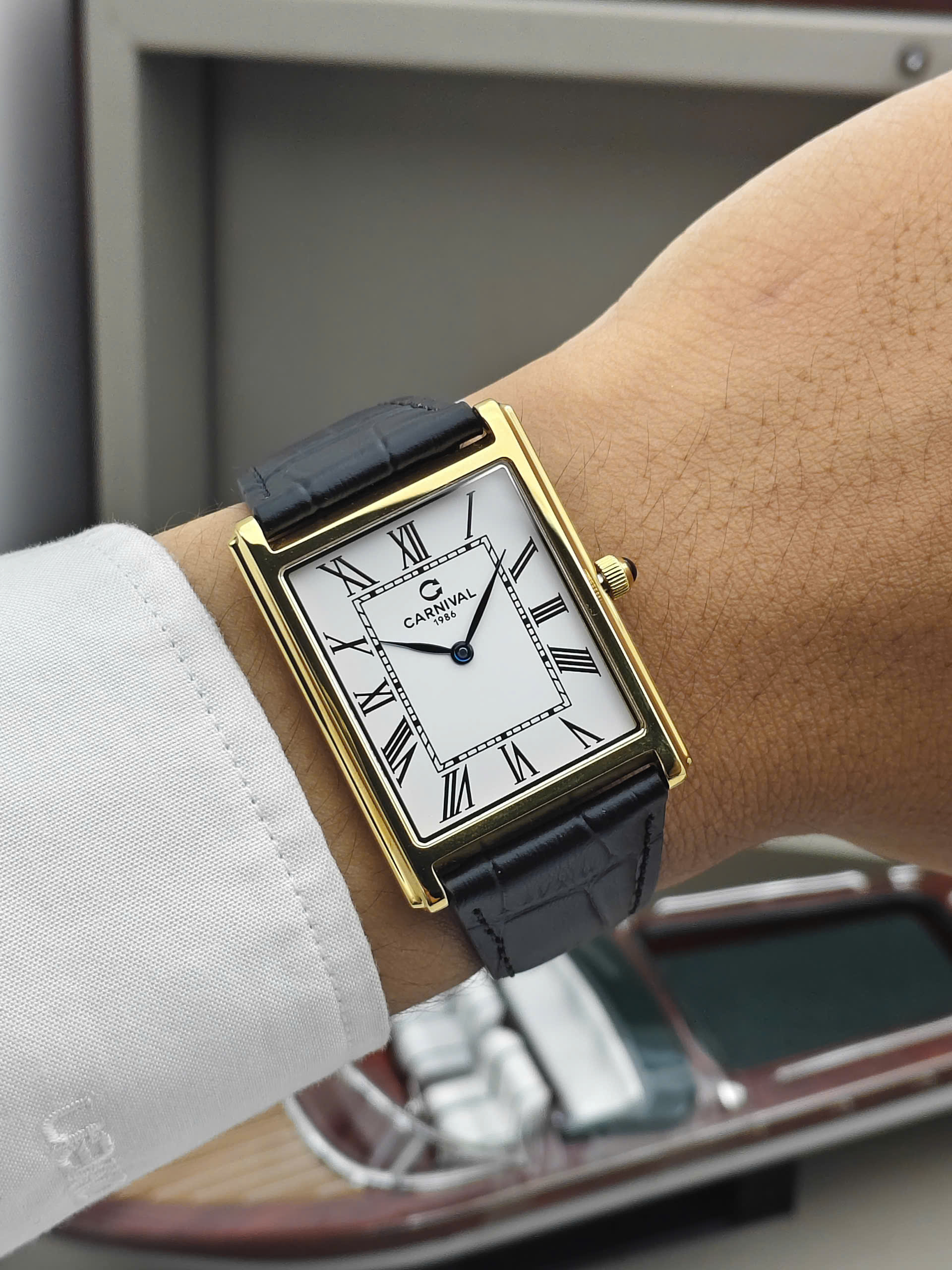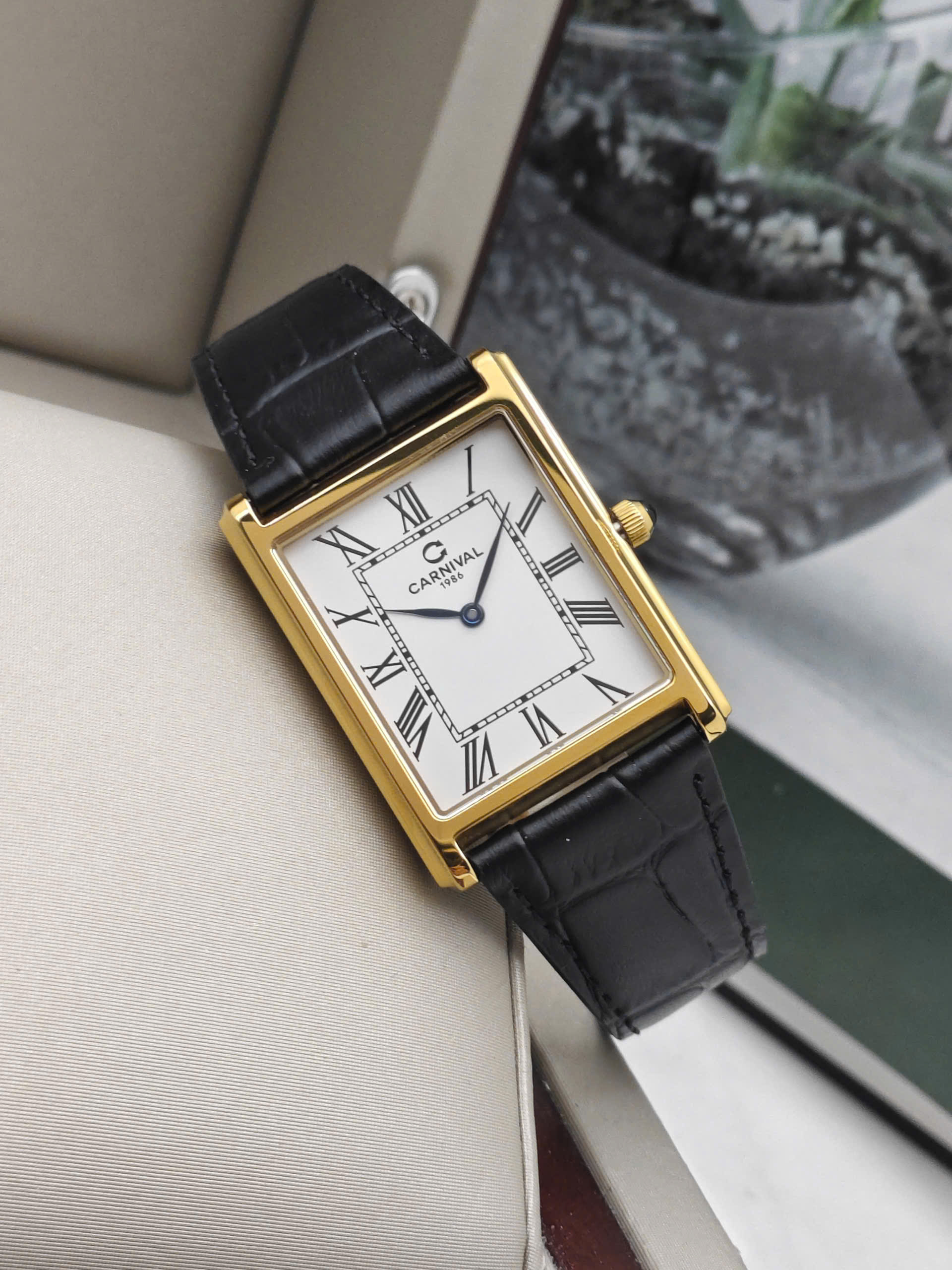 Đồng hồ Carnival 8231G-VV-DD-T tái hiện hoàn hảo phong cách Tank kinh điển với thiết kế mặt hình chữ nhật đầy nam tính và khác biệt. Sự phối hợp giữa bộ vỏ tông vàng sang trọng cùng mặt số trắng trang nhã tạo nên một vẻ đẹp đậm chất quý tộc châu Âu. Điểm nhấn đắt giá của mẫu đồng hồ này chính là bộ kim xanh thanh mảnh nổi bật và núm chỉnh giờ được đính đá cabochon xanh tinh xảo, mang lại sự cuốn hút khó cưỡng ngay từ cái nhìn đầu tiên. Với thiết kế mỏng nhẹ chỉ 6.5mm, sản phẩm không chỉ là công cụ xem giờ mà còn là món phụ kiện khẳng định gu thẩm mỹ riêng biệt, không hòa lẫn với số đông.