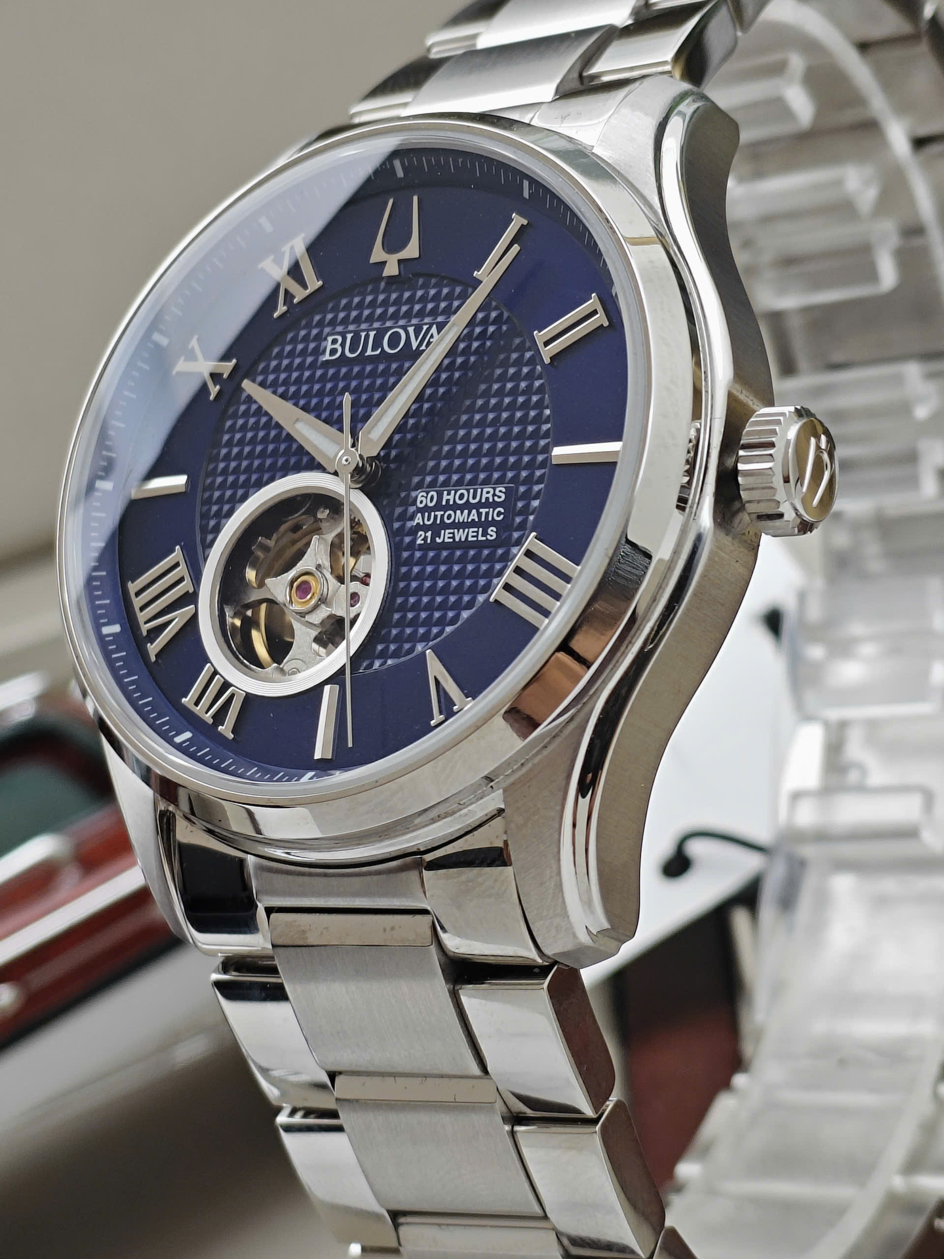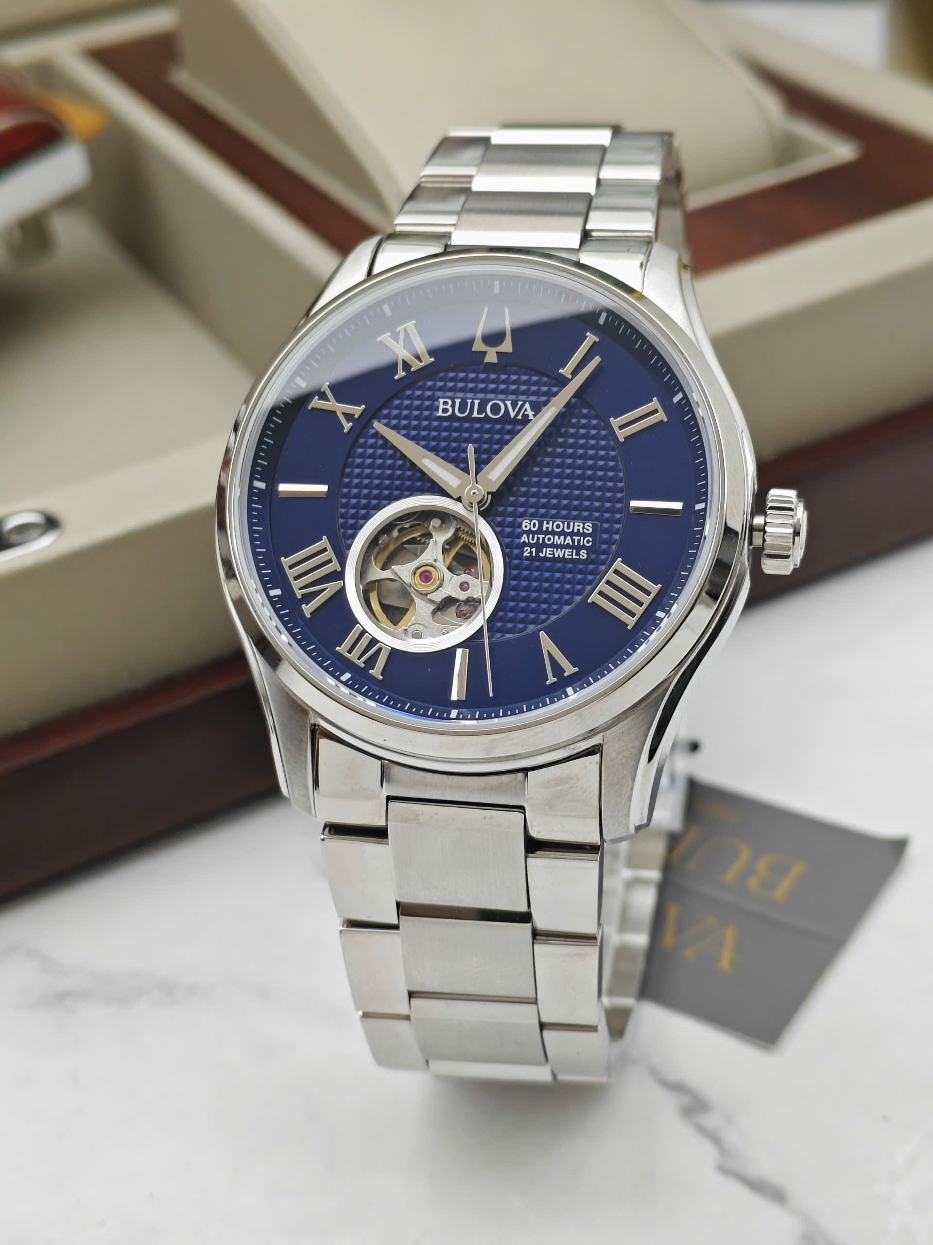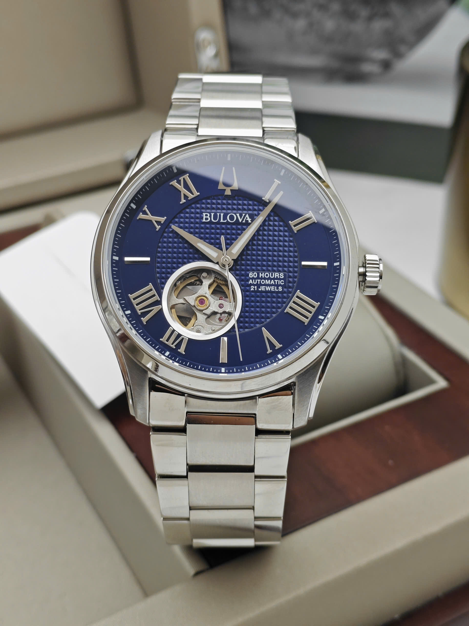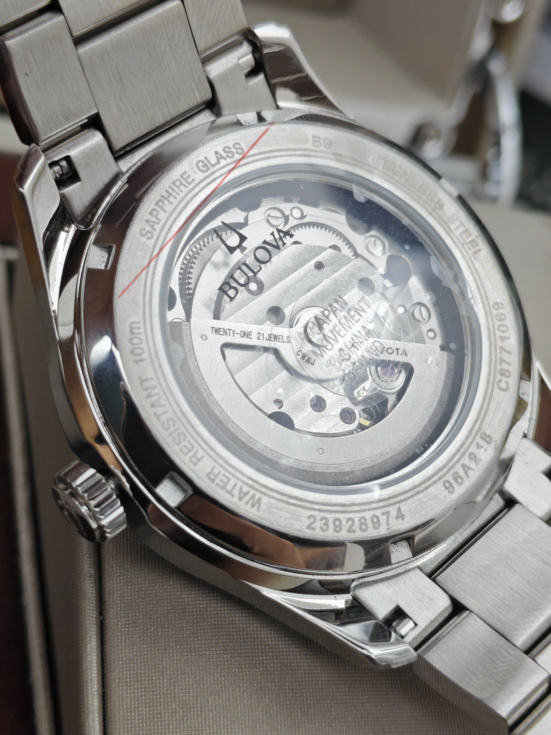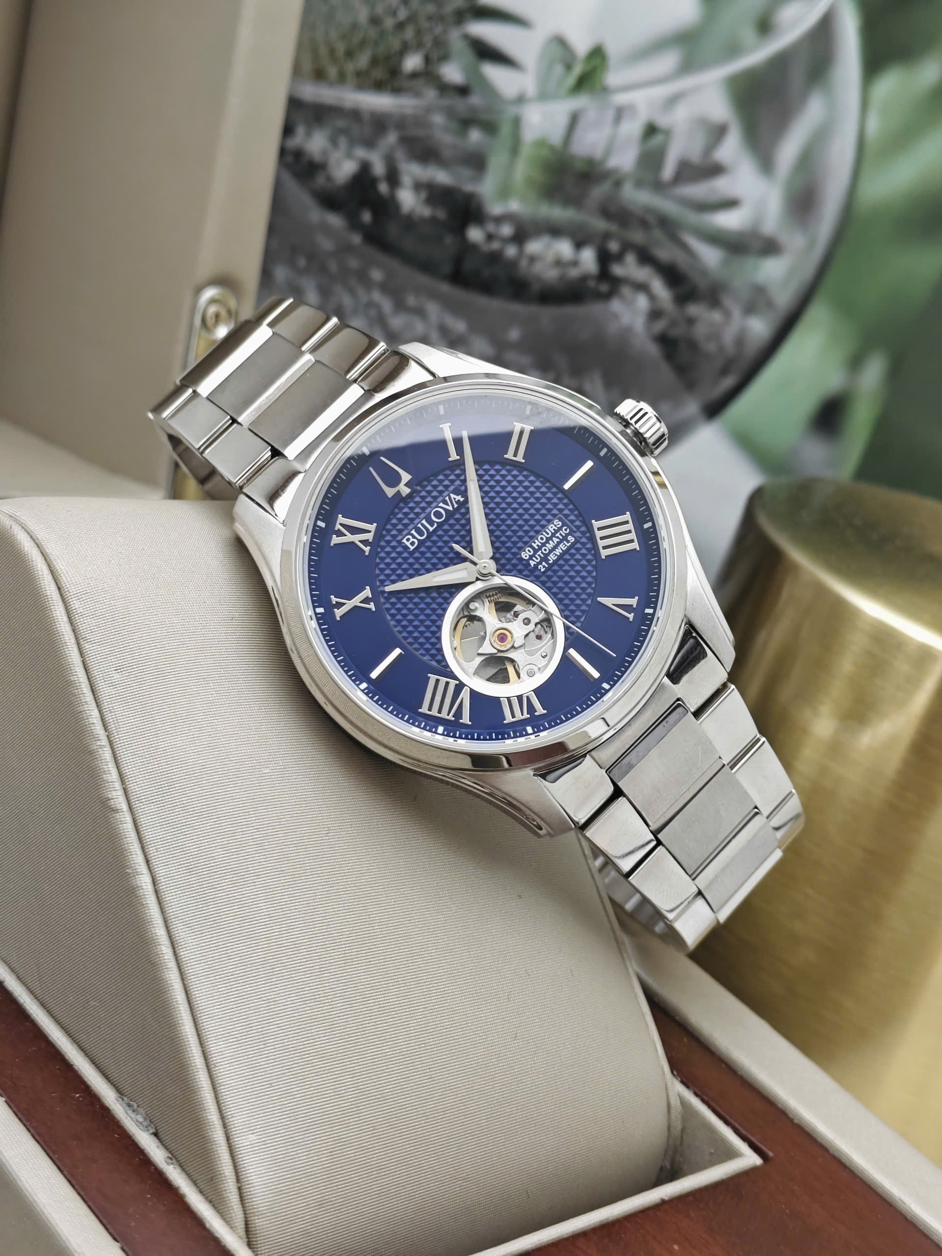 Bulova 96A218 được chế tác với vỏ và dây đeo bằng thép không gỉ cao cấp, mang lại độ bền vượt trội và khả năng chống oxy hóa tốt. Tông màu bạc sáng kết hợp cùng mặt xanh tạo nên tổng thể hài hòa và sang trọng. Mặt kính sapphire chống trầy xước hiệu quả, giúp bảo vệ đồng hồ luôn sáng đẹp theo thời gian. Đồng hồ sử dụng bộ máy cơ tự động (Automatic), vận hành mượt mà dựa trên chuyển động cổ tay, không cần pin, thể hiện trọn vẹn giá trị cơ khí truyền thống.