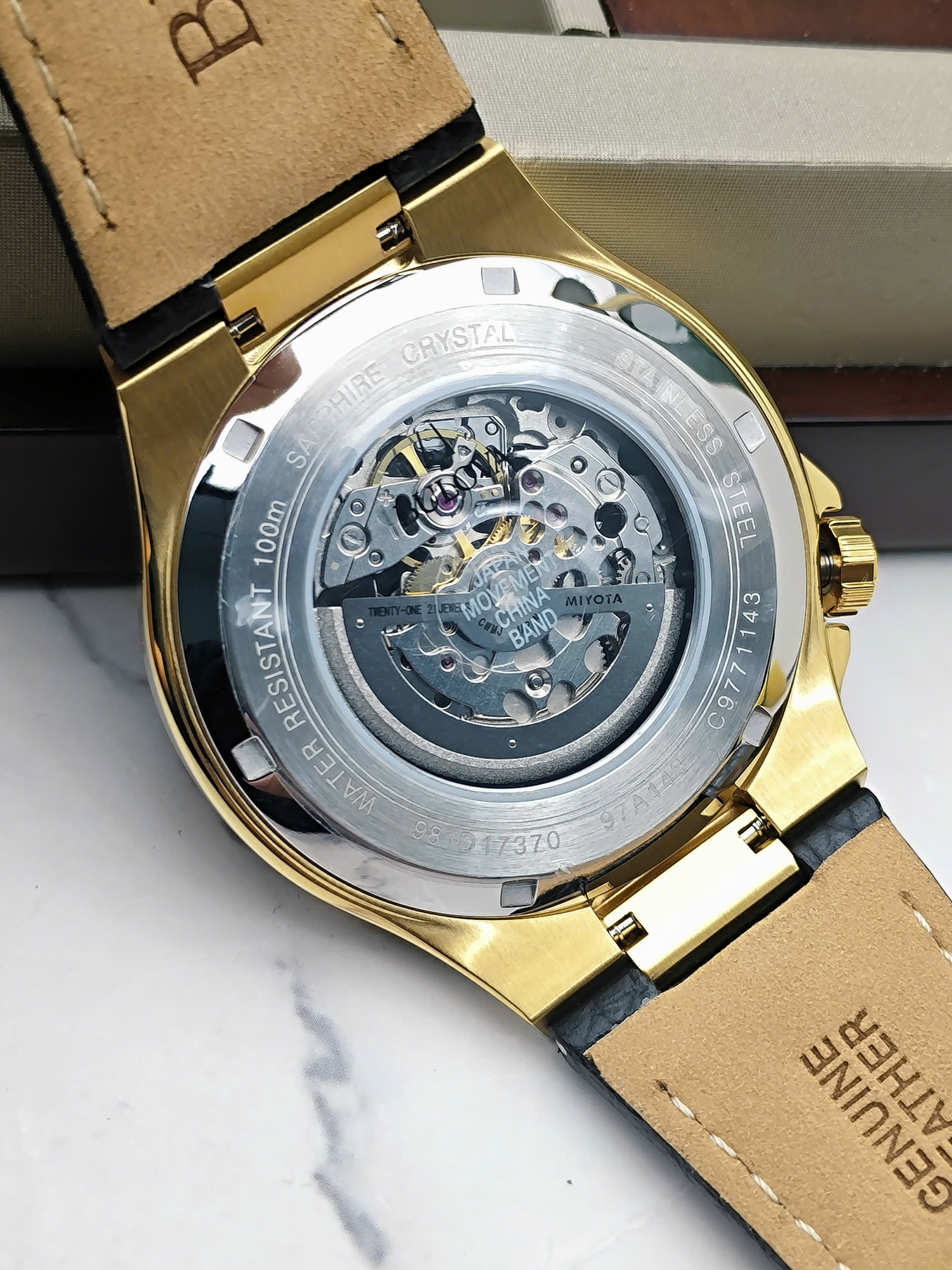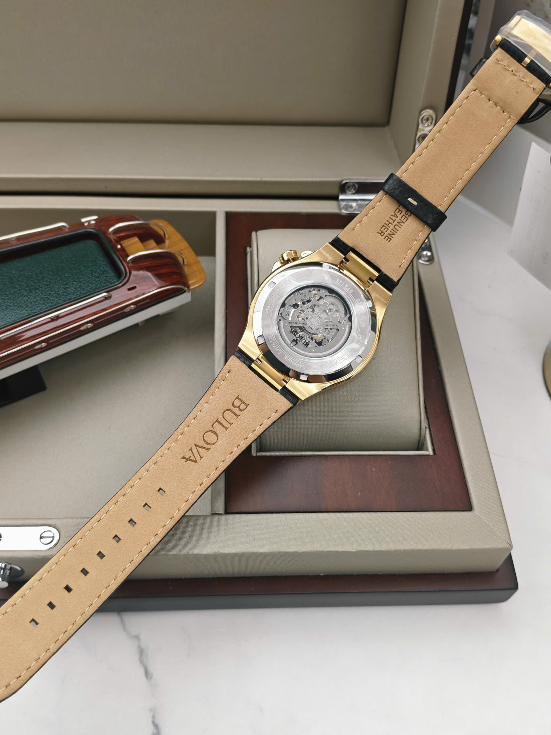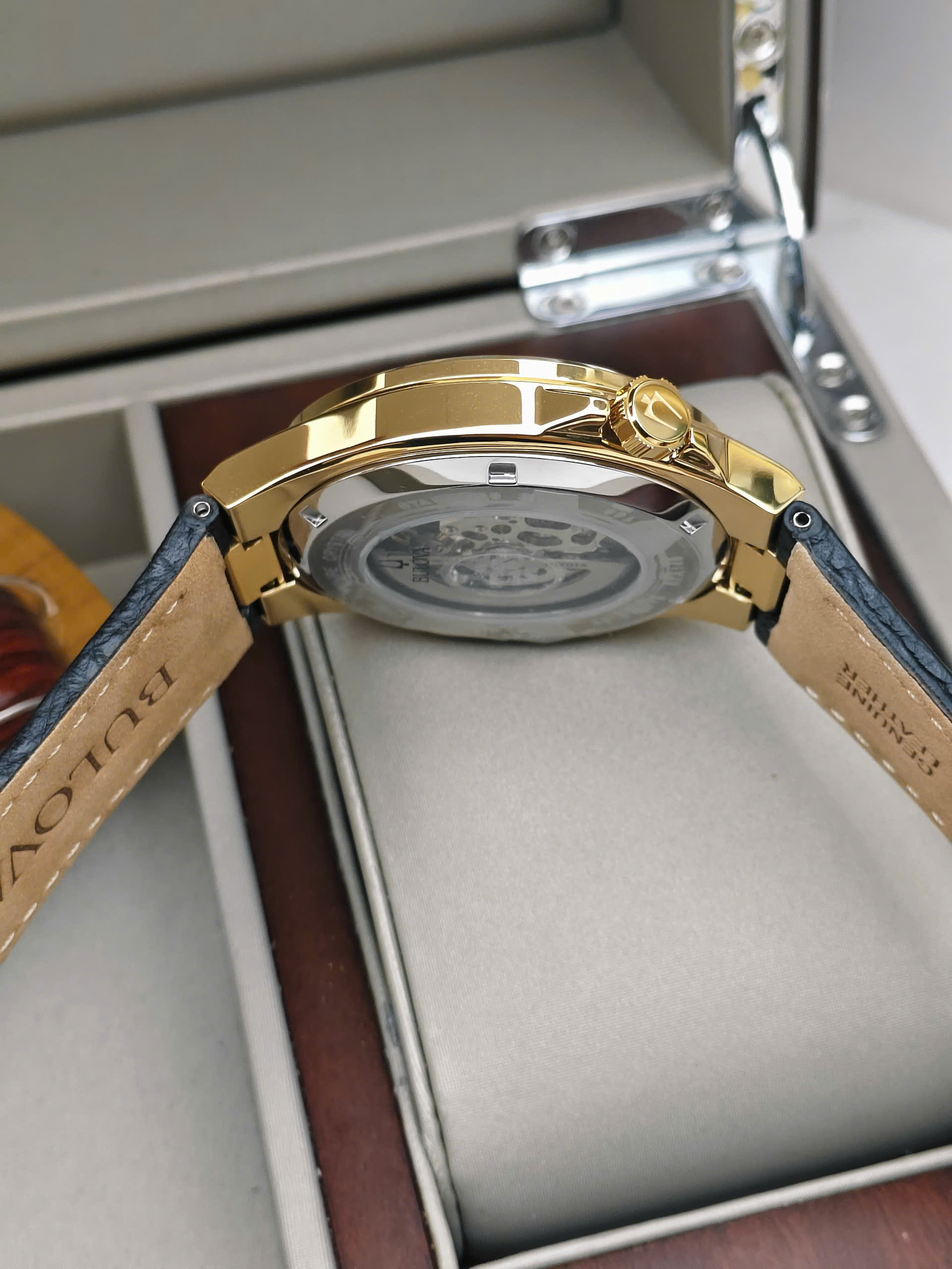 Đồng hồ Bulova 97A138 được trang bị bộ máy cơ automatic vận hành ổn định với các chức năng cơ bản như giờ, phút và giây, mang đến trải nghiệm cơ học mượt mà. Vỏ thép không gỉ mạ vàng giúp tăng độ bền và tính thẩm mỹ theo thời gian. Dây da màu nâu cổ điển mềm mại, ôm tay và tạo cảm giác thoải mái khi đeo lâu. Mặt kính cứng Mineral có khả năng chịu lực tốt, phù hợp với nhu cầu sử dụng hằng ngày.