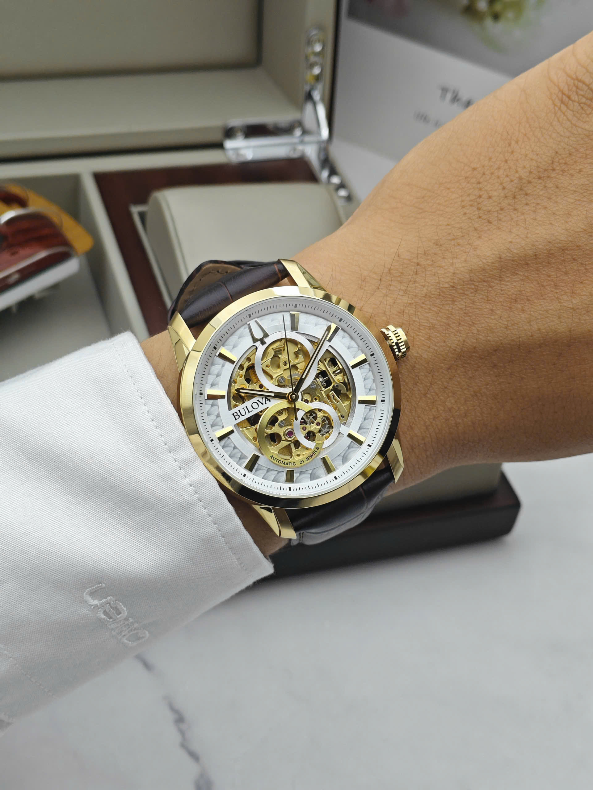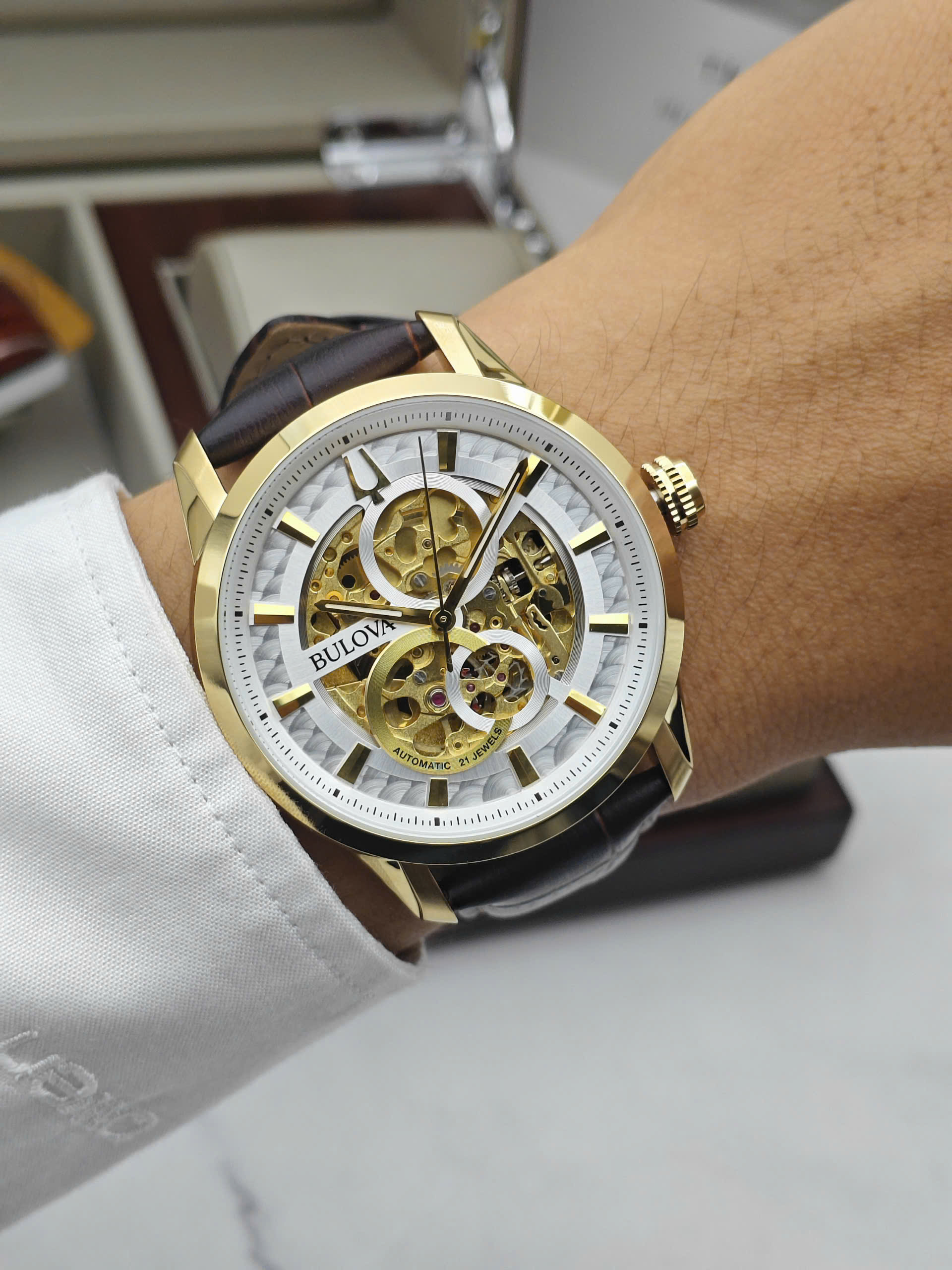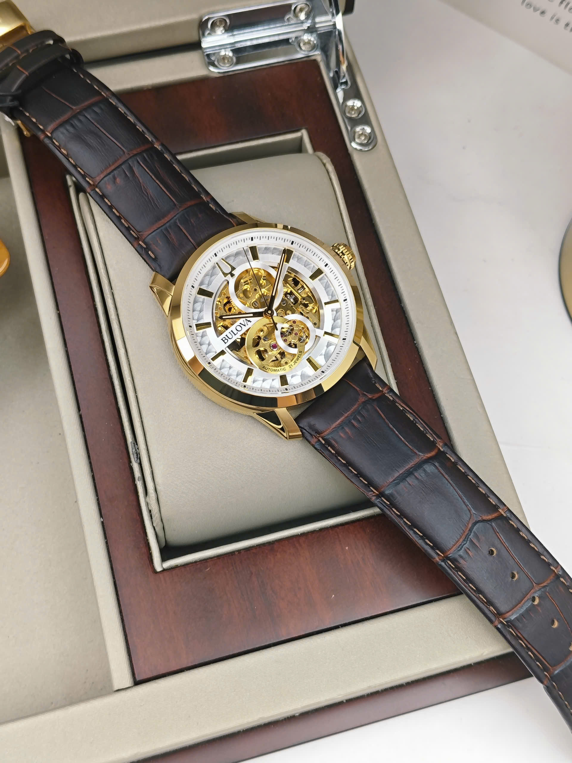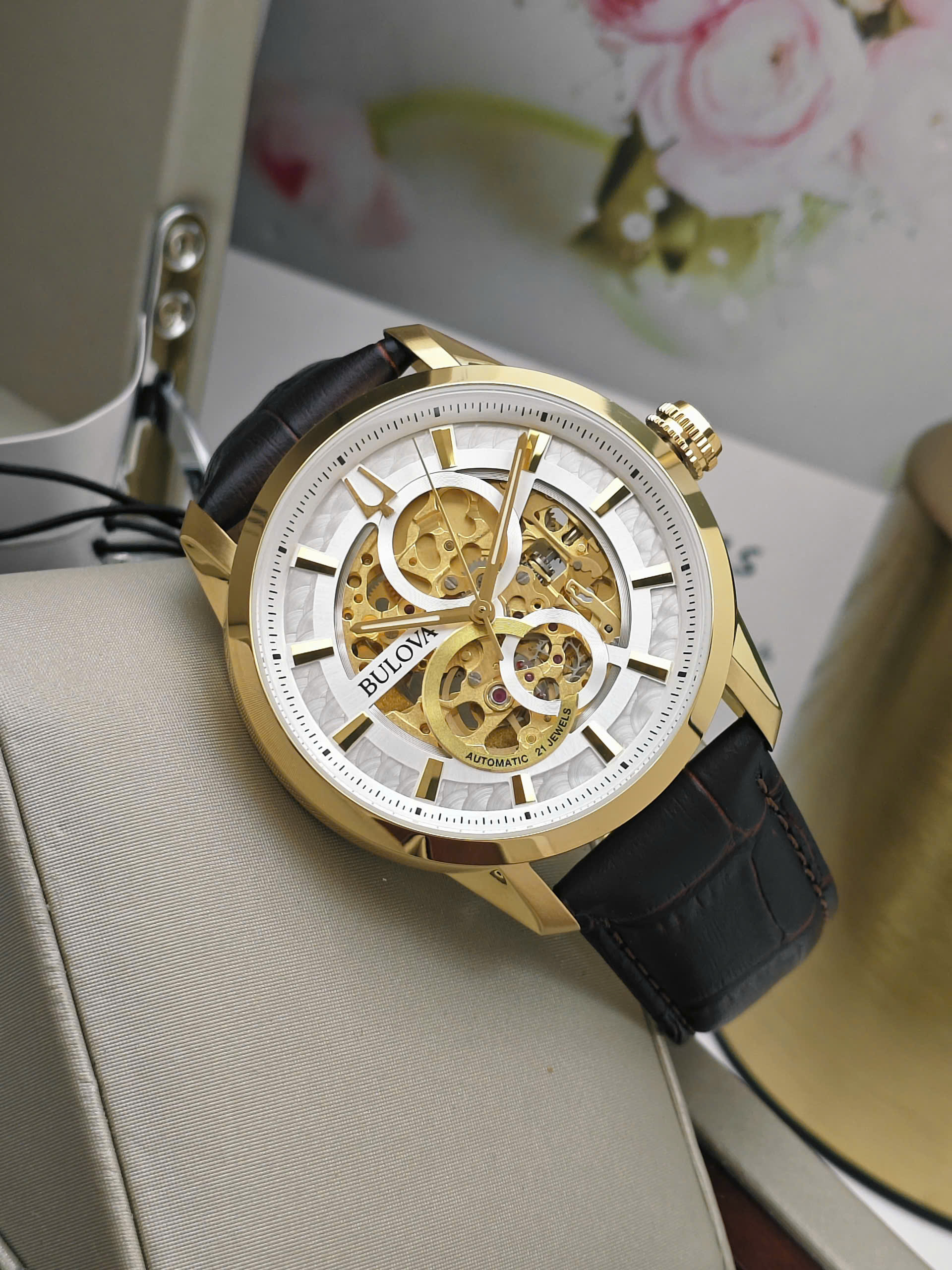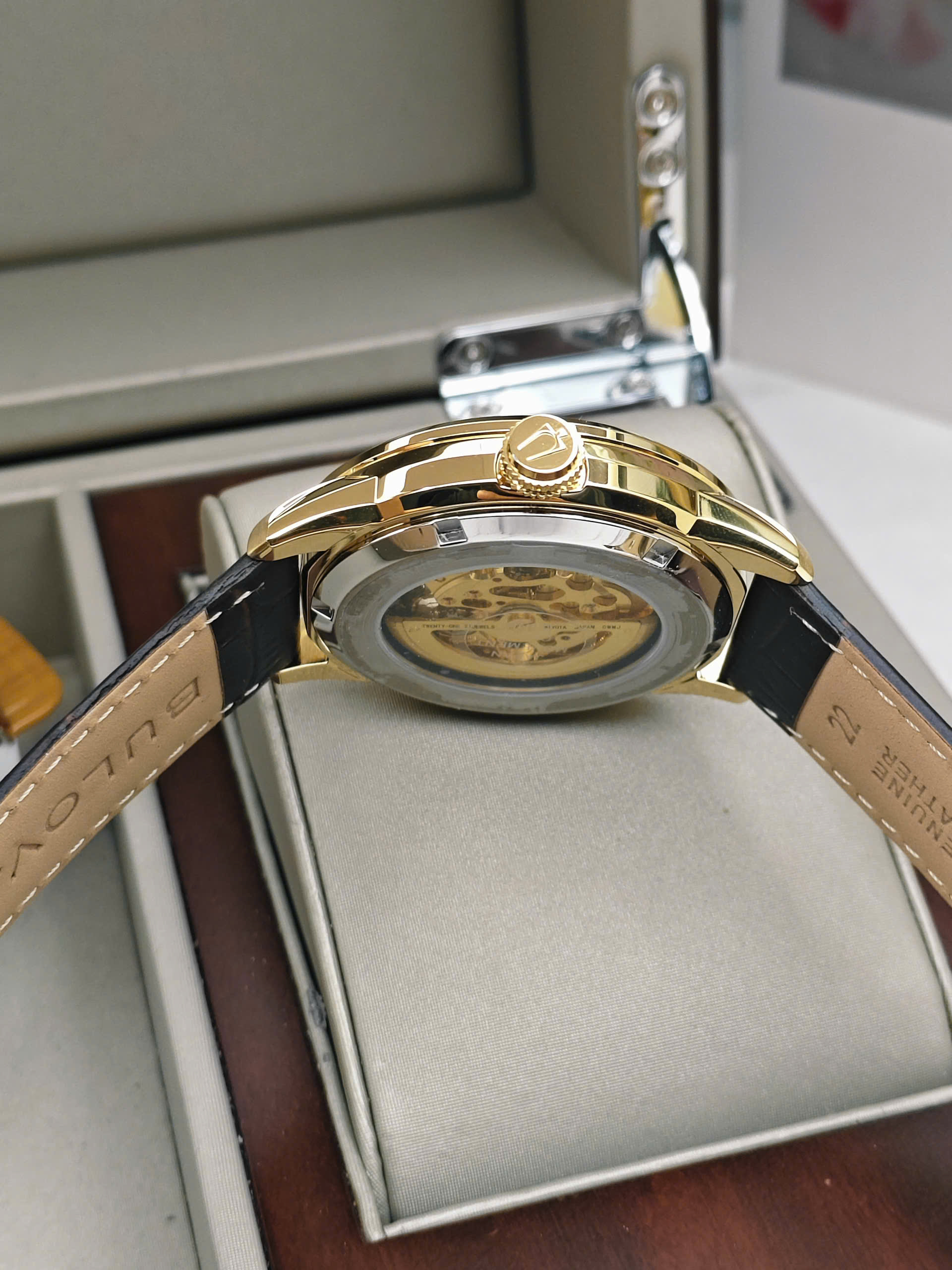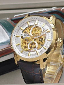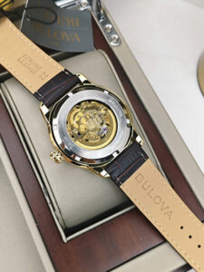 Đồng hồ Bulova 97A138 được trang bị bộ máy cơ automatic vận hành ổn định với các chức năng cơ bản như giờ, phút và giây, mang đến trải nghiệm cơ học mượt mà. Vỏ thép không gỉ mạ vàng giúp tăng độ bền và tính thẩm mỹ theo thời gian. Dây da màu nâu cổ điển mềm mại, ôm tay và tạo cảm giác thoải mái khi đeo lâu. Mặt kính cứng Mineral có khả năng chịu lực tốt, phù hợp với nhu cầu sử dụng hằng ngày.