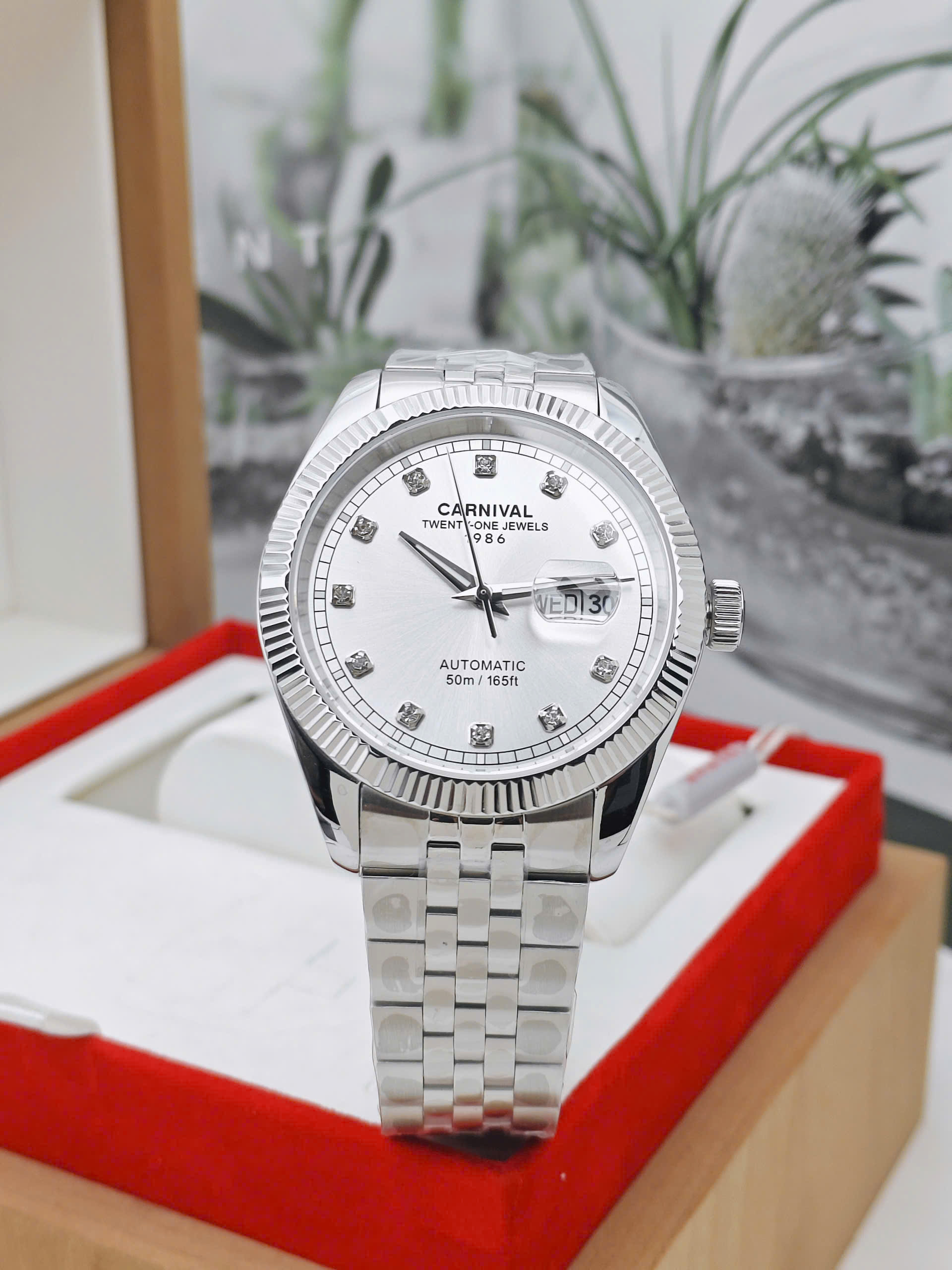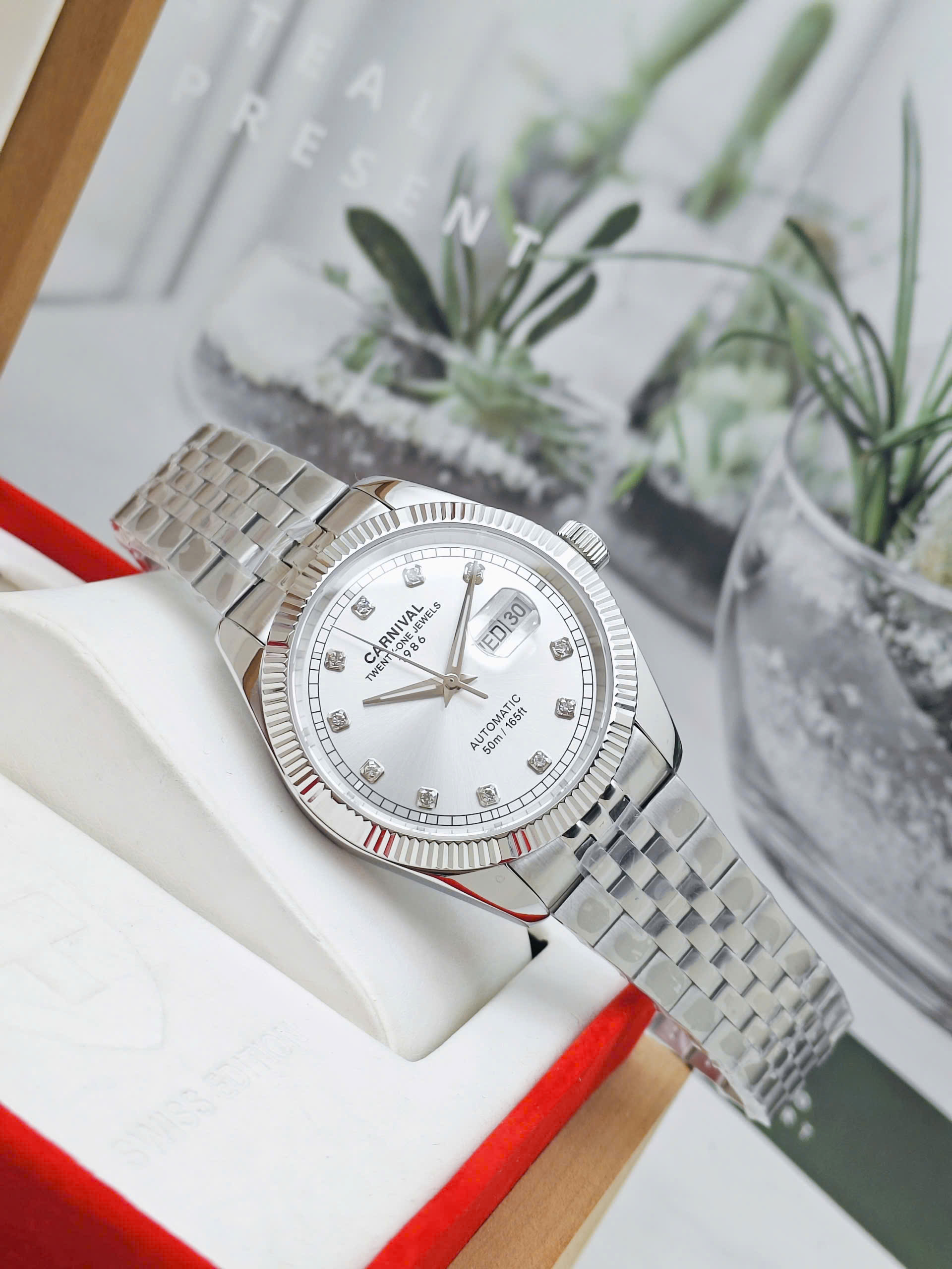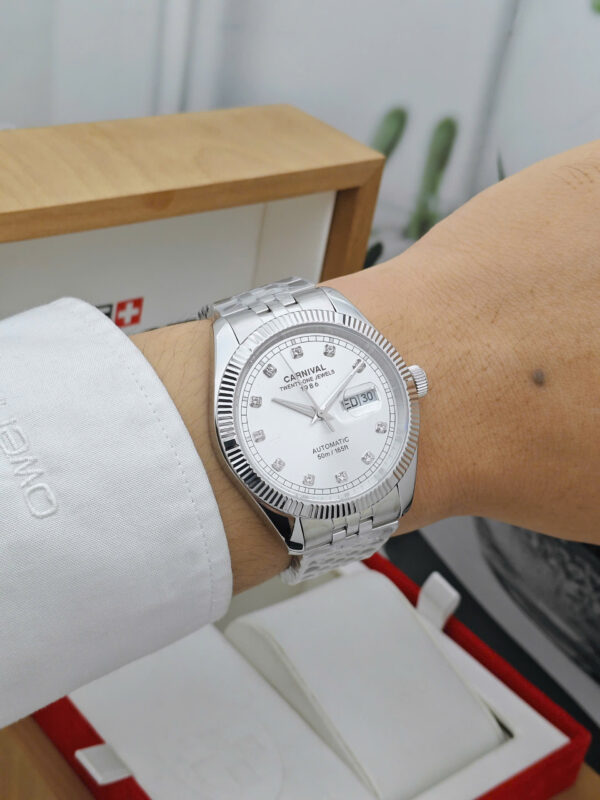 Mặt số màu trắng điểm xuyết bằng các cọc số đính đá cao cấp, tạo điểm nhấn lấp lánh mỗi khi bắt sáng. Kim giờ, phút được chế tác mảnh mai, tinh xảo, dễ dàng đọc thời gian trong mọi điều kiện ánh sáng. Bên trong là bộ máy cơ automatic Nhật Bản danh tiếng, sử dụng 21 chân kính (jewels). Là lựa chọn tối ưu cho những ai yêu thích trải nghiệm cơ khí.