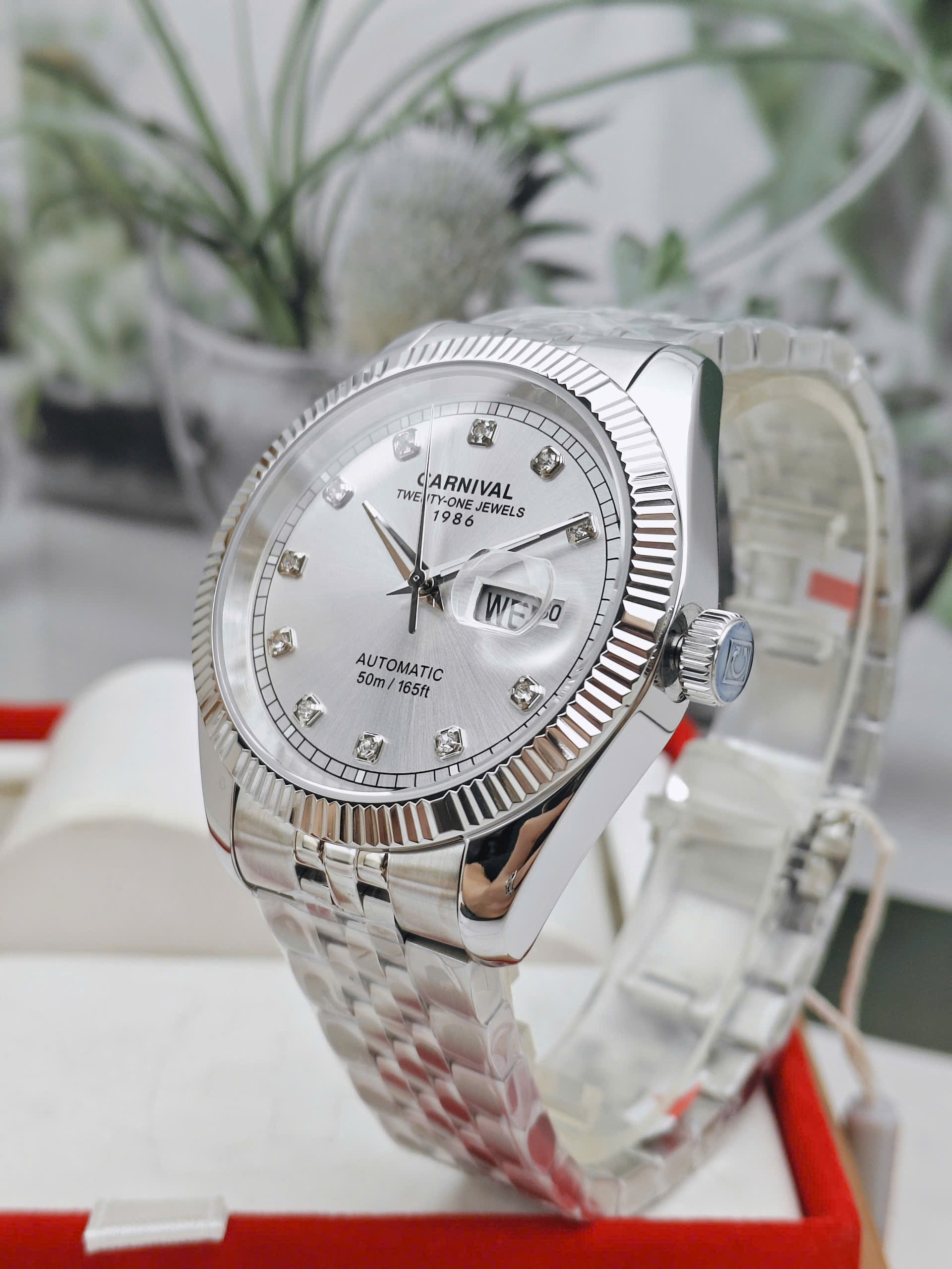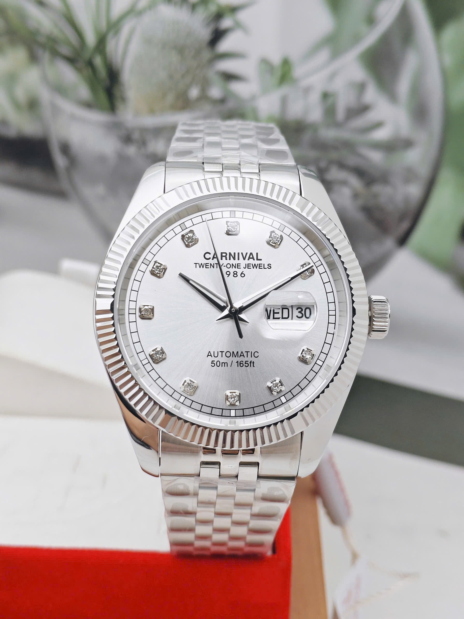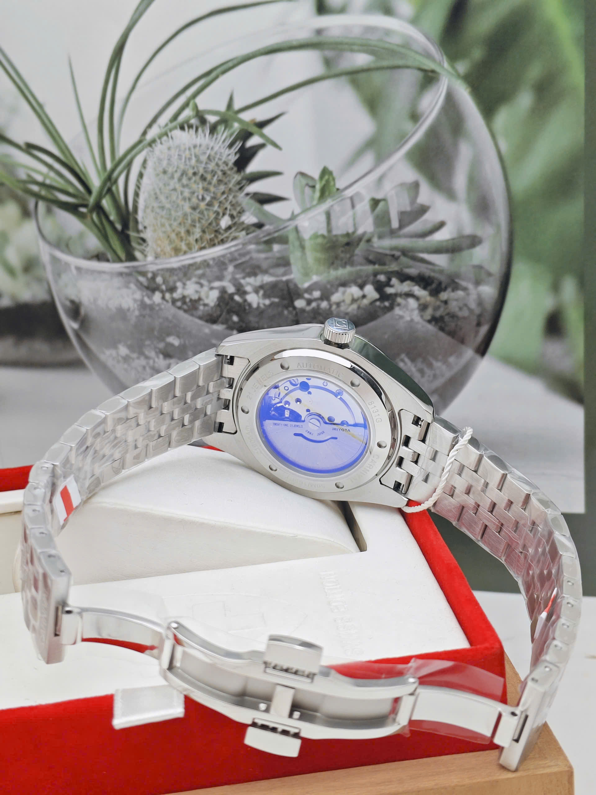 Mặt số màu trắng điểm xuyết bằng các cọc số đính đá cao cấp, tạo điểm nhấn lấp lánh mỗi khi bắt sáng. Kim giờ, phút được chế tác mảnh mai, tinh xảo, dễ dàng đọc thời gian trong mọi điều kiện ánh sáng. Bên trong là bộ máy cơ automatic Nhật Bản danh tiếng, sử dụng 21 chân kính (jewels). Là lựa chọn tối ưu cho những ai yêu thích trải nghiệm cơ khí.