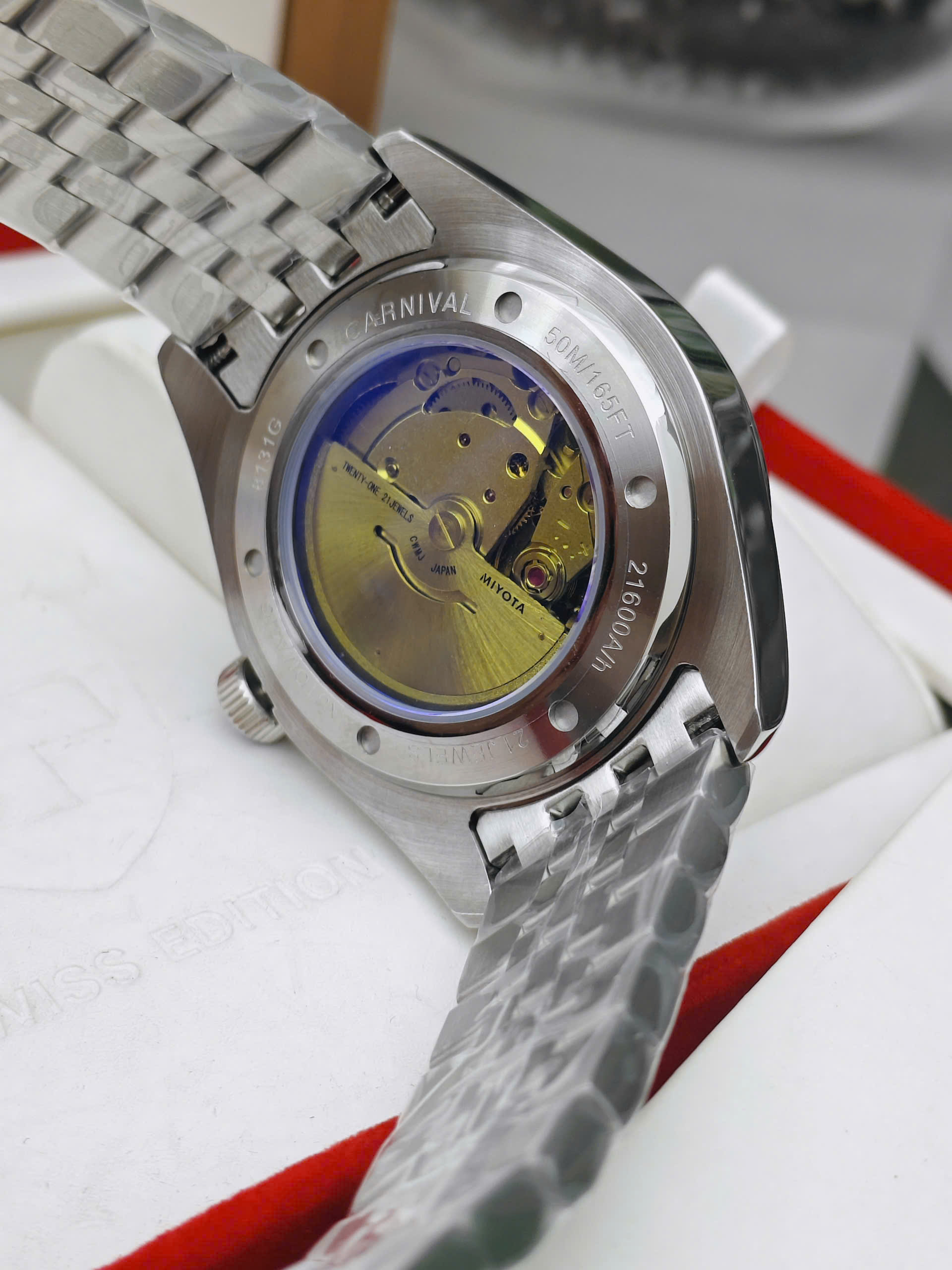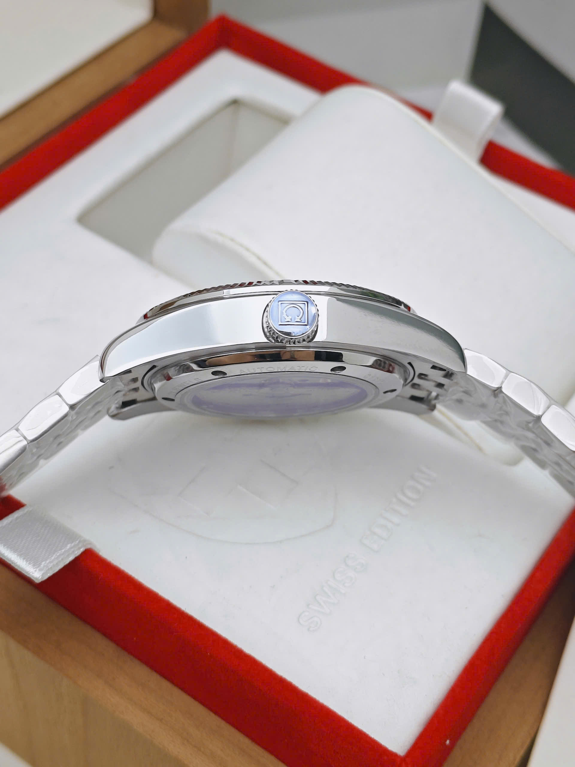 Phần dây đeo bằng thép không gỉ 316L đem lại cảm giác chắc chắn, sáng bóng như vàng thật mà vẫn bền bỉ theo thời gian Mặt kính sapphire nguyên khối là điểm cộng lớn – khả năng chống trầy xước gần như tuyệt đối, giữ cho mặt đồng hồ luôn trong tình trạng trong suốt và sang trọng.