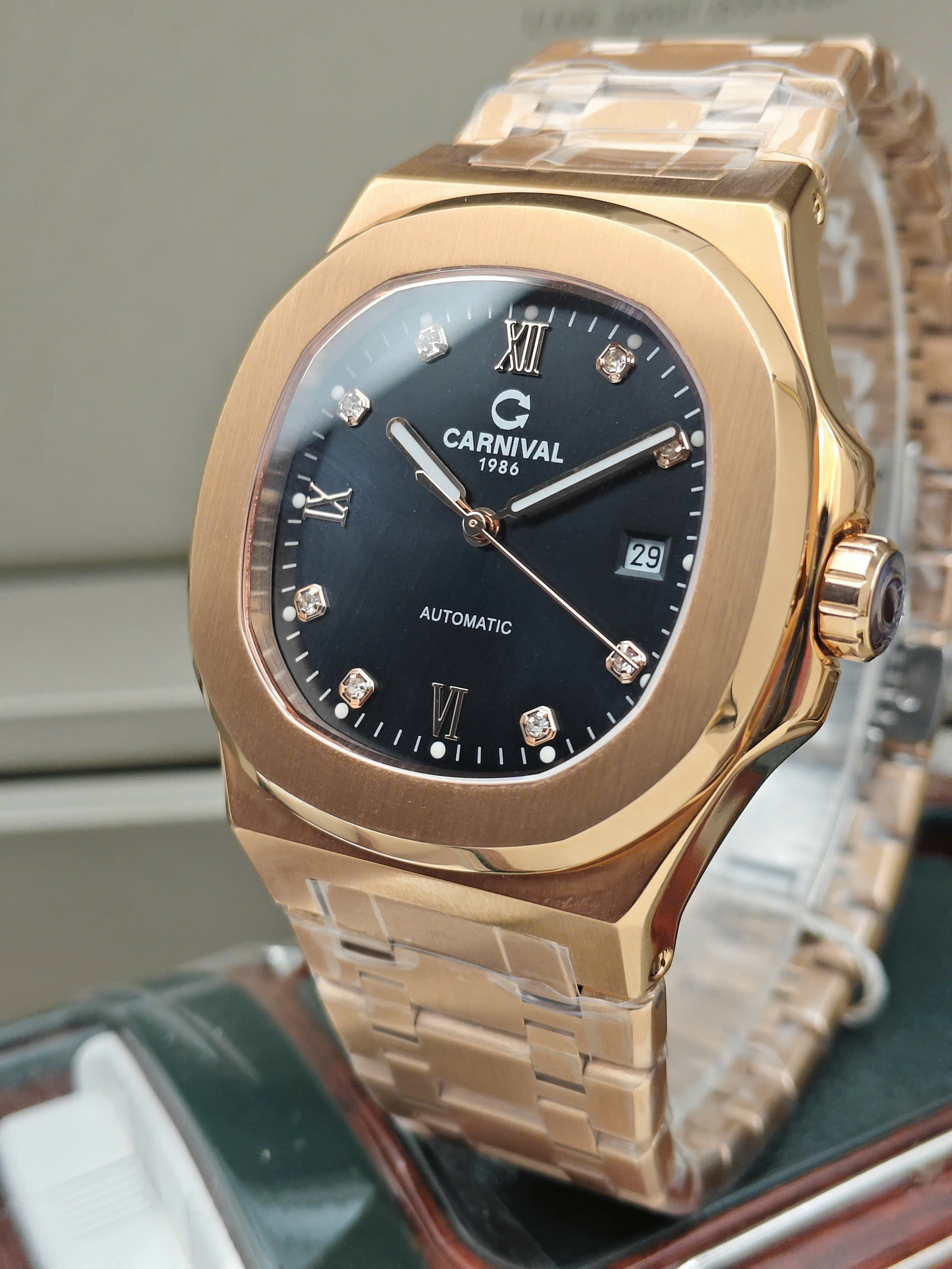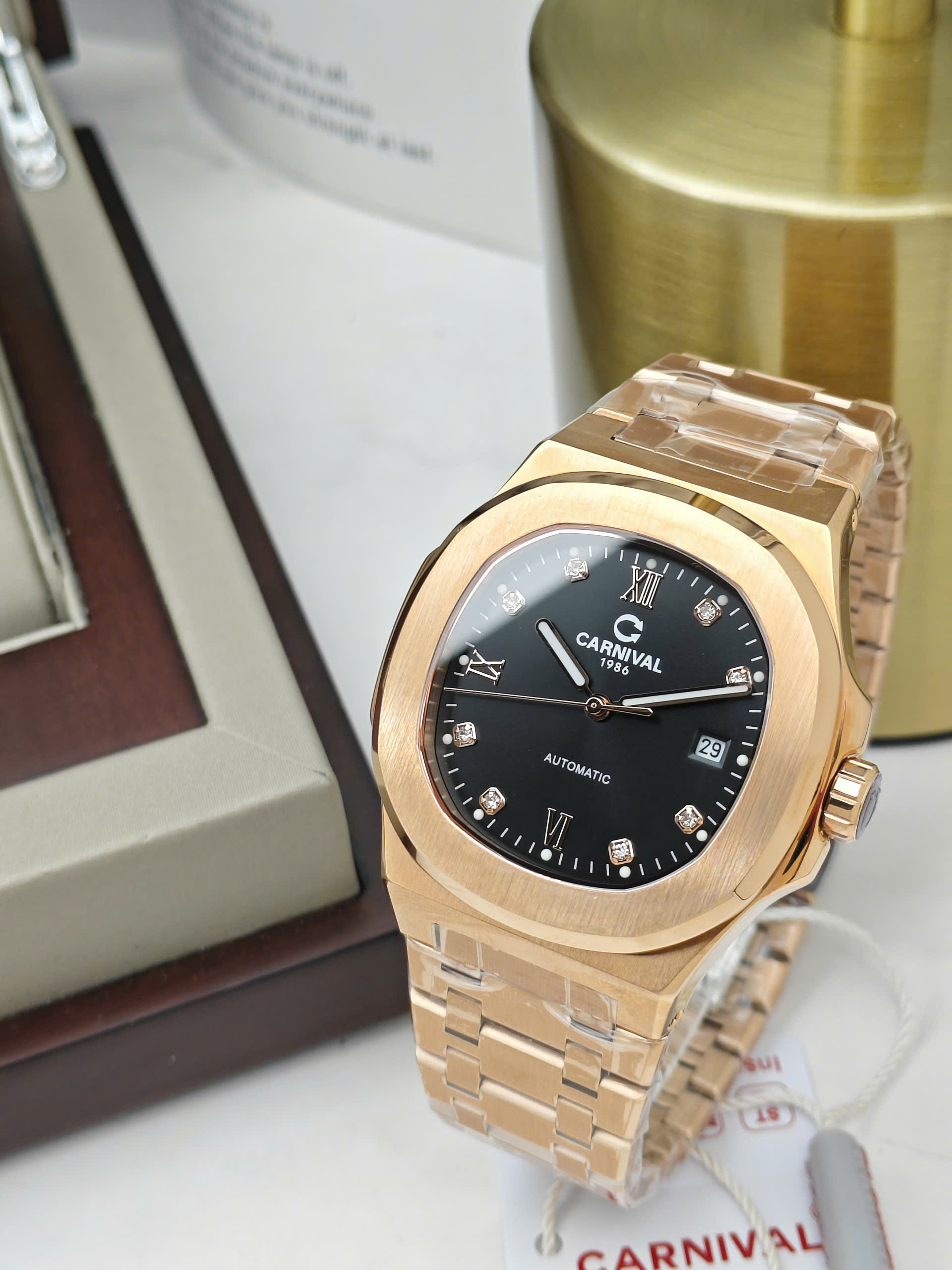 Đồng hồ Carnival 8160G-VH-D được trang bị bộ máy cơ automatic xuất xứ Nhật Bản, nổi tiếng với độ ổn định và bền bỉ theo thời gian. Các chức năng cơ bản như giờ, phút, giây cùng lịch ngày được bố trí khoa học, dễ quan sát và thuận tiện khi sử dụng hằng ngày. Vỏ và dây thép không gỉ mạ vàng hồng mang lại độ bền cao và vẻ ngoài sang trọng. Mặt kính sapphire chống trầy xước hiệu quả, giúp bảo vệ mặt số tối ưu trong quá trình sử dụng.