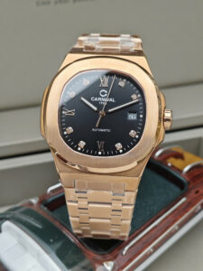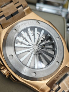 Carnival 8160G mã 8160G-VH-D là mẫu đồng hồ nam mang phong cách sang trọng, hiện đại theo tiêu chuẩn thiết kế Thụy Sỹ. Toàn bộ vỏ và dây thép được phủ màu vàng hồng nổi bật, kết hợp mặt số đen huyền bí tạo nên vẻ ngoài đẳng cấp, mạnh mẽ và rất cuốn hút. Với đường kính mặt số 43mm cùng độ dày chỉ 8.2mm, mẫu đồng hồ này vừa tạo điểm nhấn rõ rệt trên cổ tay vừa đảm bảo cảm giác đeo gọn gàng, thoải mái.