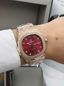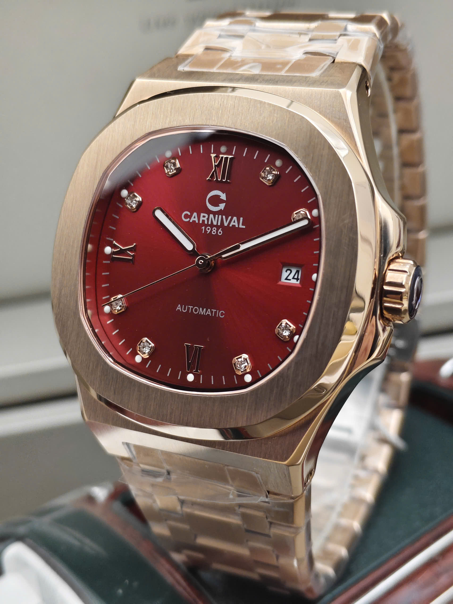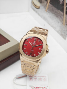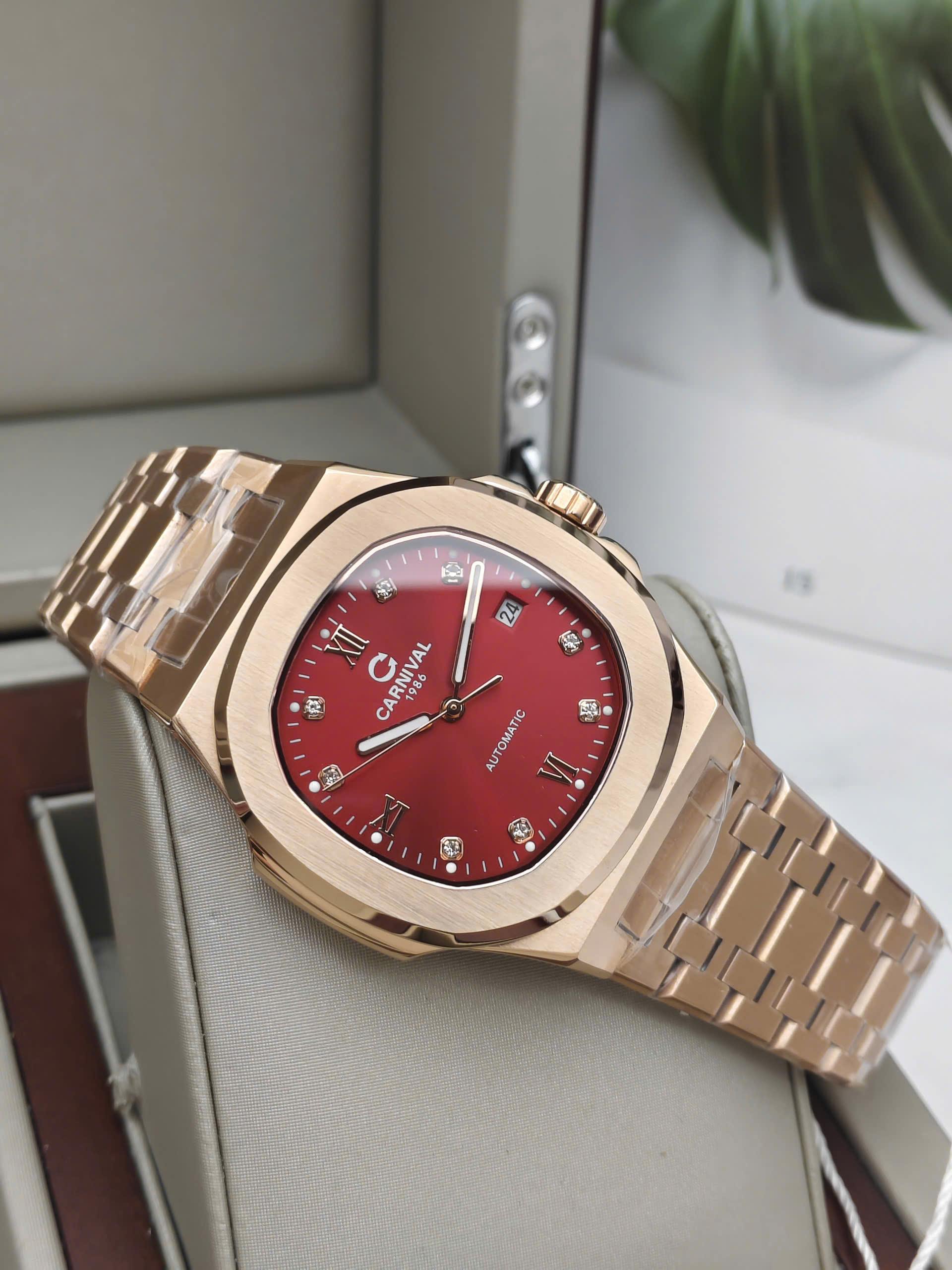 Carnival 8160G-VH-DO là mẫu đồng hồ nam nổi bật với thiết kế táo bạo và đầy khí chất. Mặt số đỏ cuốn hút kết hợp cùng vỏ rosegold tạo nên dấu ấn thị giác mạnh, thể hiện rõ phong thái tự tin và khác biệt của người đeo. Đường kính mặt 43mm mang đến vẻ ngoài nam tính, trong khi độ dày 8.2mm giúp đồng hồ giữ được sự gọn gàng, phù hợp cả khi đeo cùng trang phục công sở lẫn trang phục dạo phố.