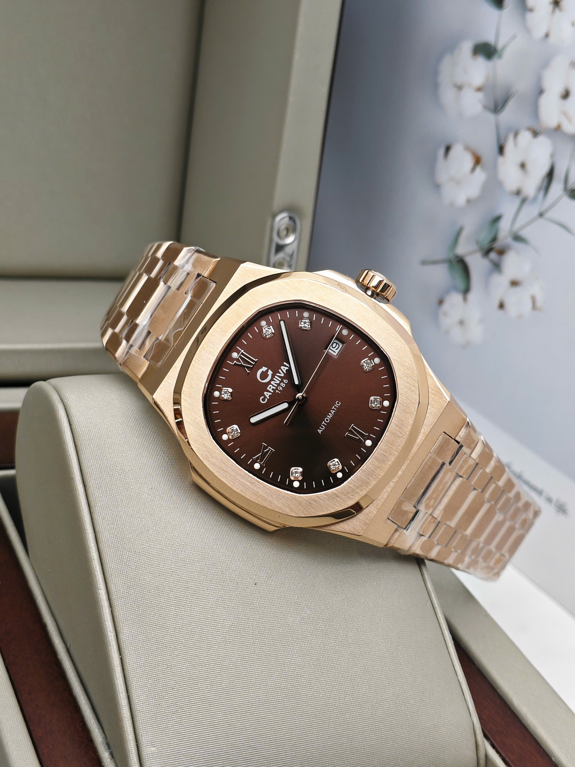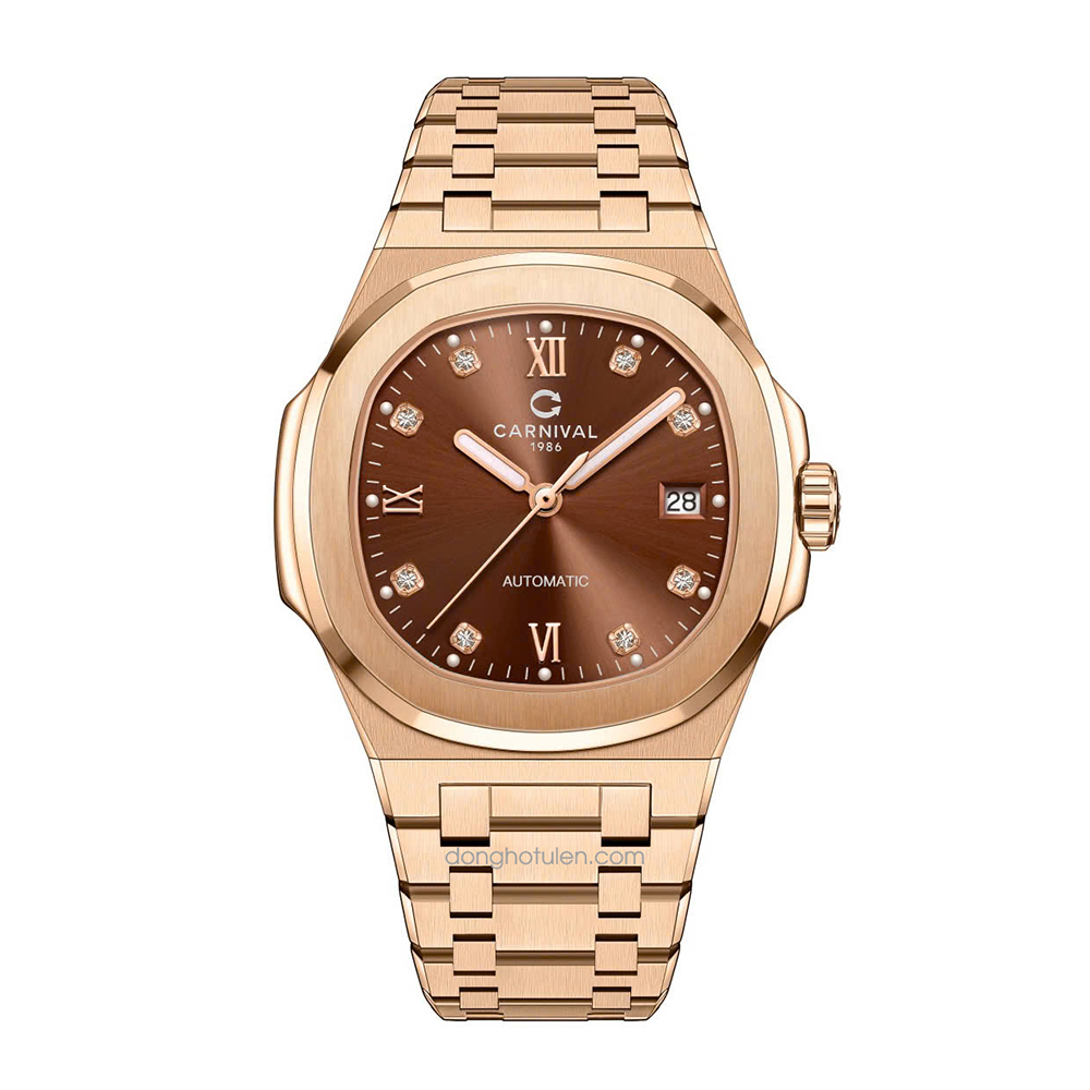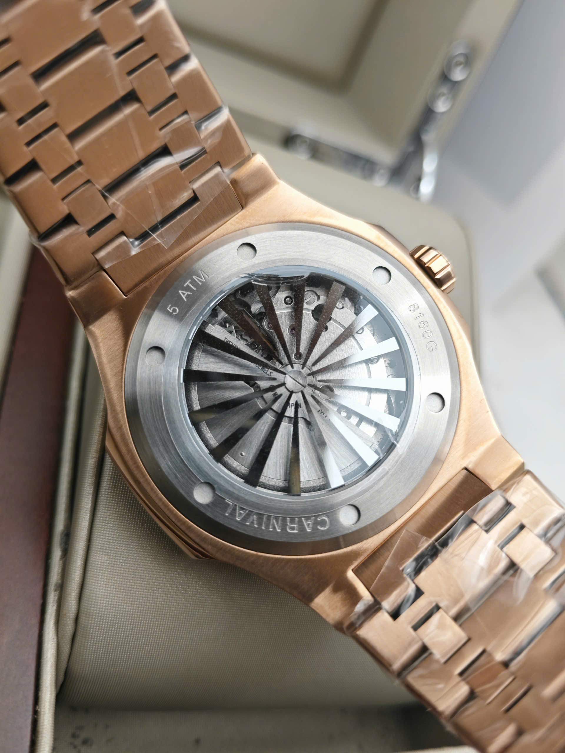 Điểm cộng lớn nhất của CARNIVAL 8160G-VH-N chính là bộ máy automatic (cơ tự động). Không cần thay pin, chiếc đồng hồ vận hành nhờ vào chuyển động tay hàng ngày của người đeo – mang lại cảm giác gắn bó và đầy chất “nghệ”.