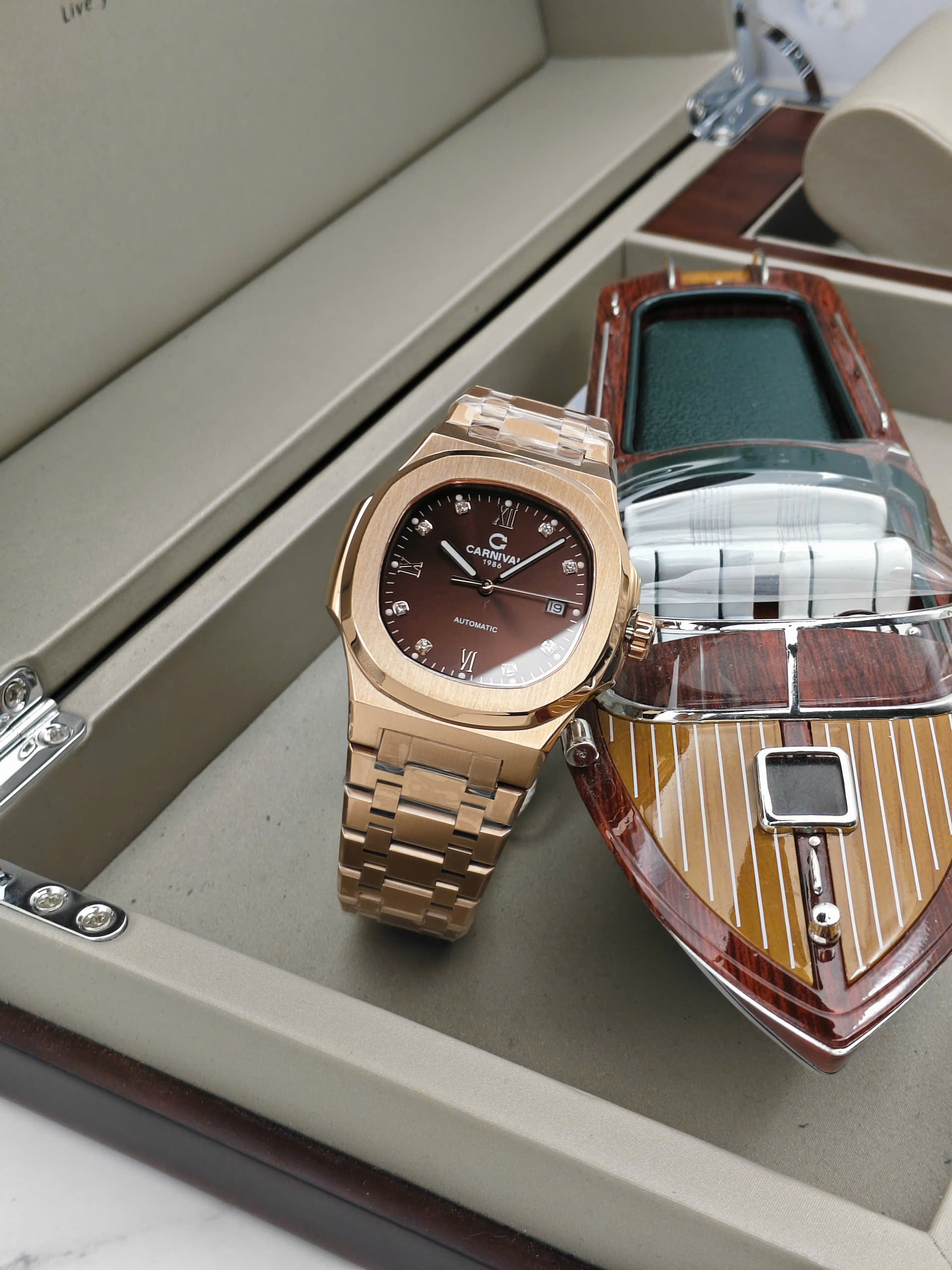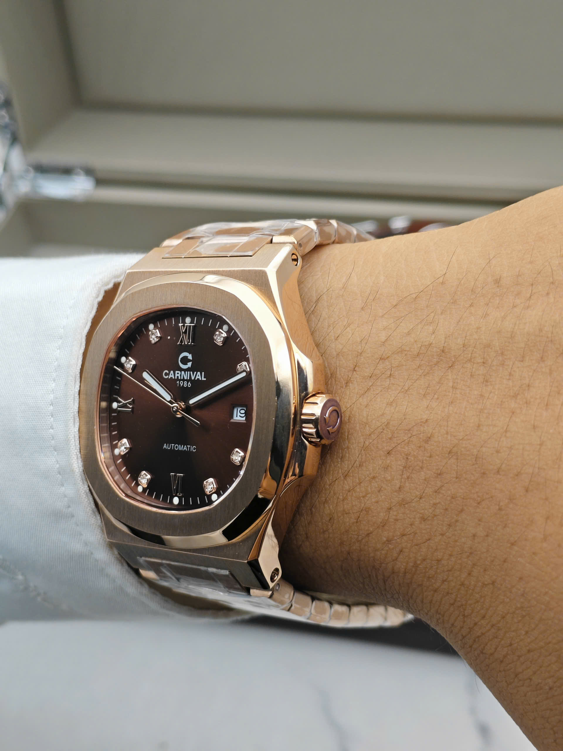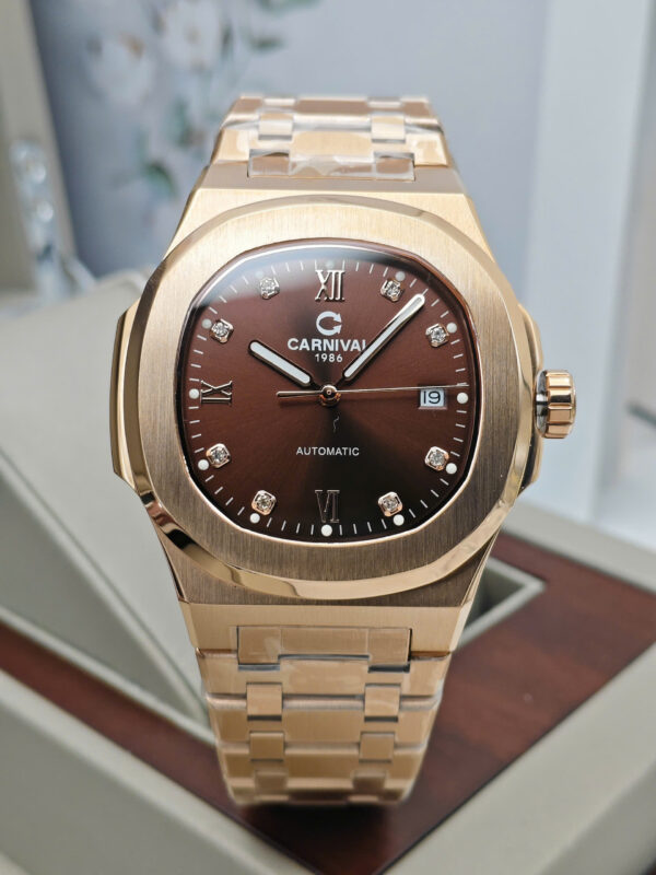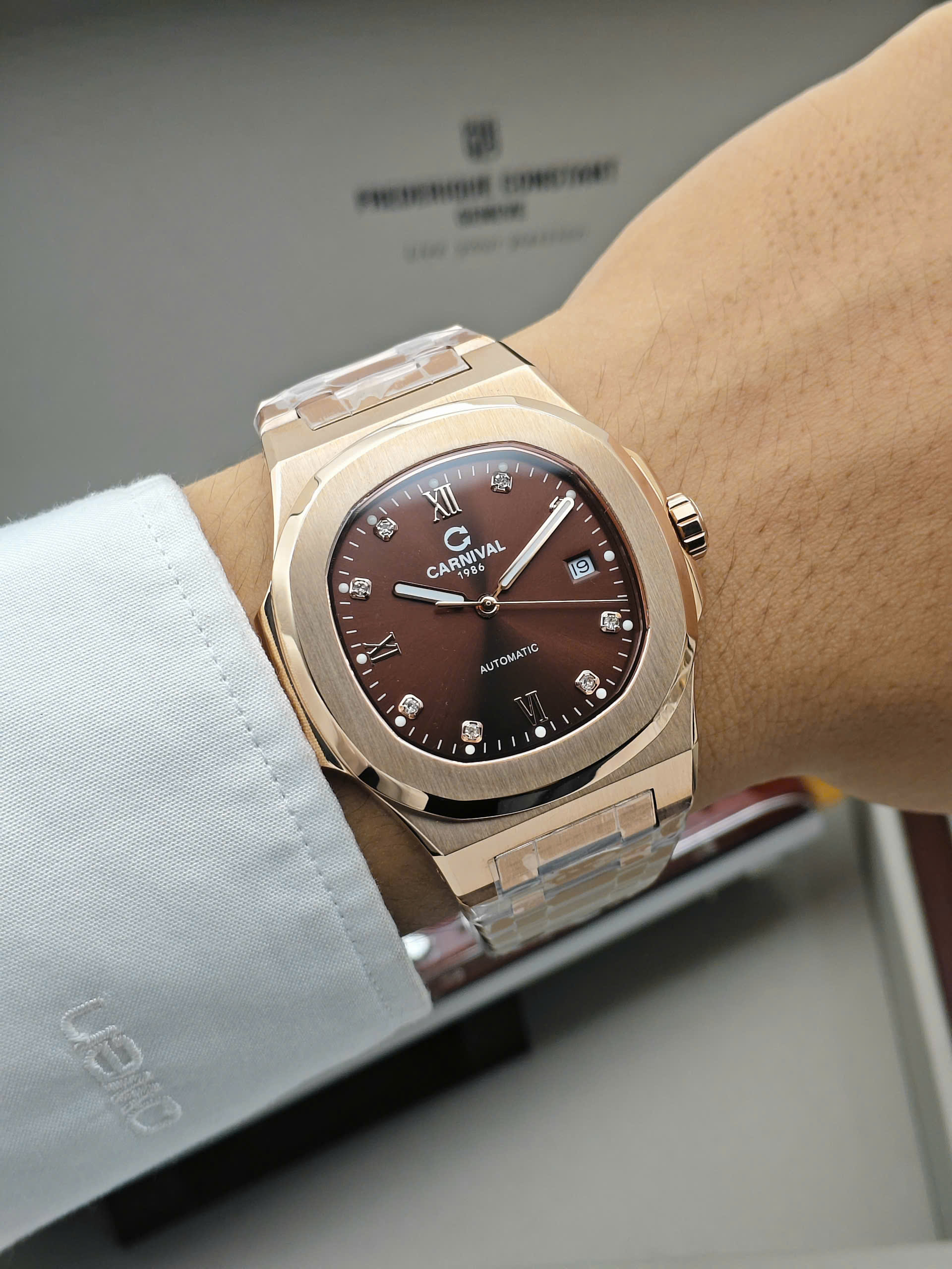 Điểm cộng lớn nhất của CARNIVAL 8160G-VH-N chính là bộ máy automatic (cơ tự động). Không cần thay pin, chiếc đồng hồ vận hành nhờ vào chuyển động tay hàng ngày của người đeo – mang lại cảm giác gắn bó và đầy chất “nghệ”.