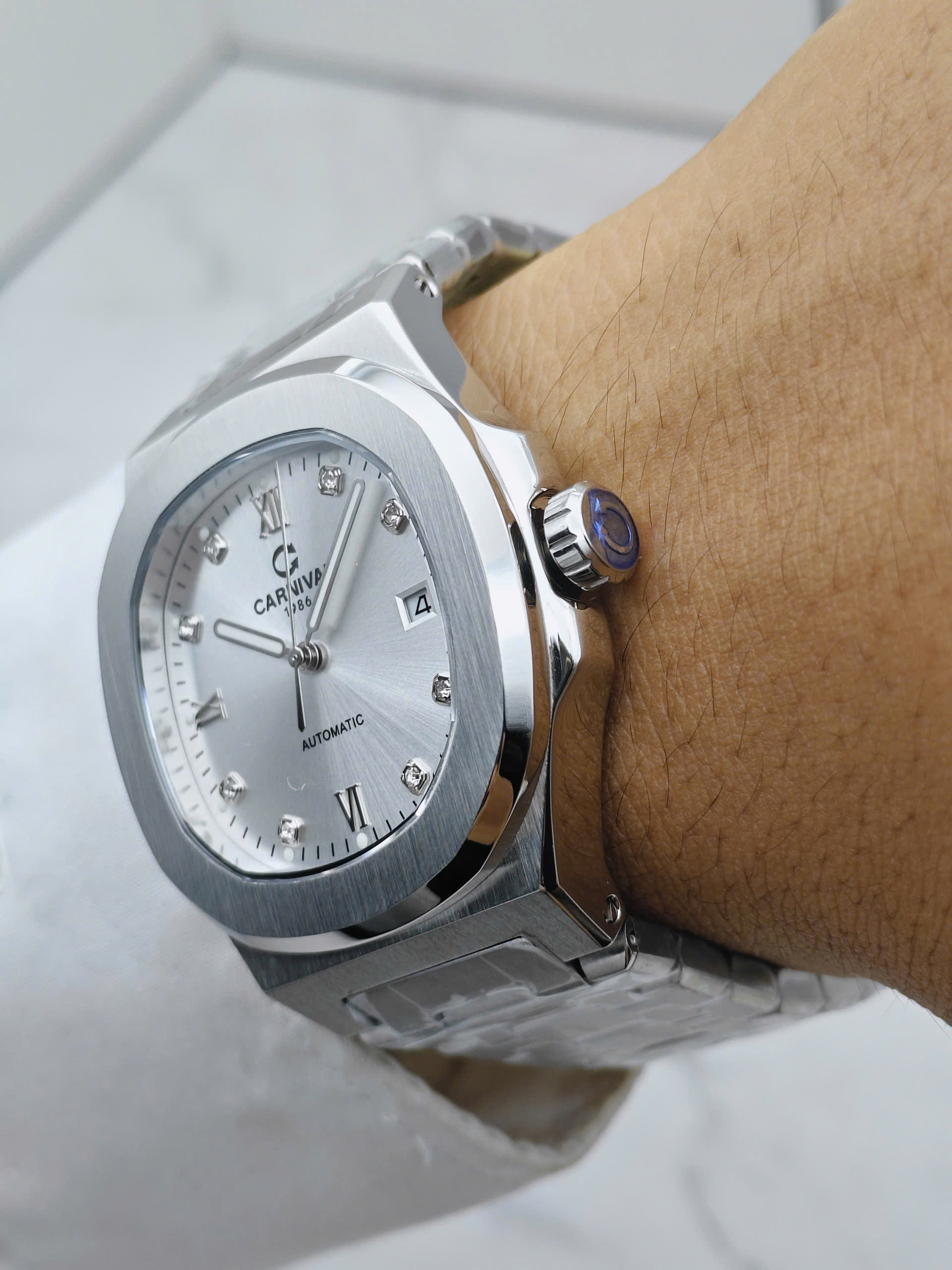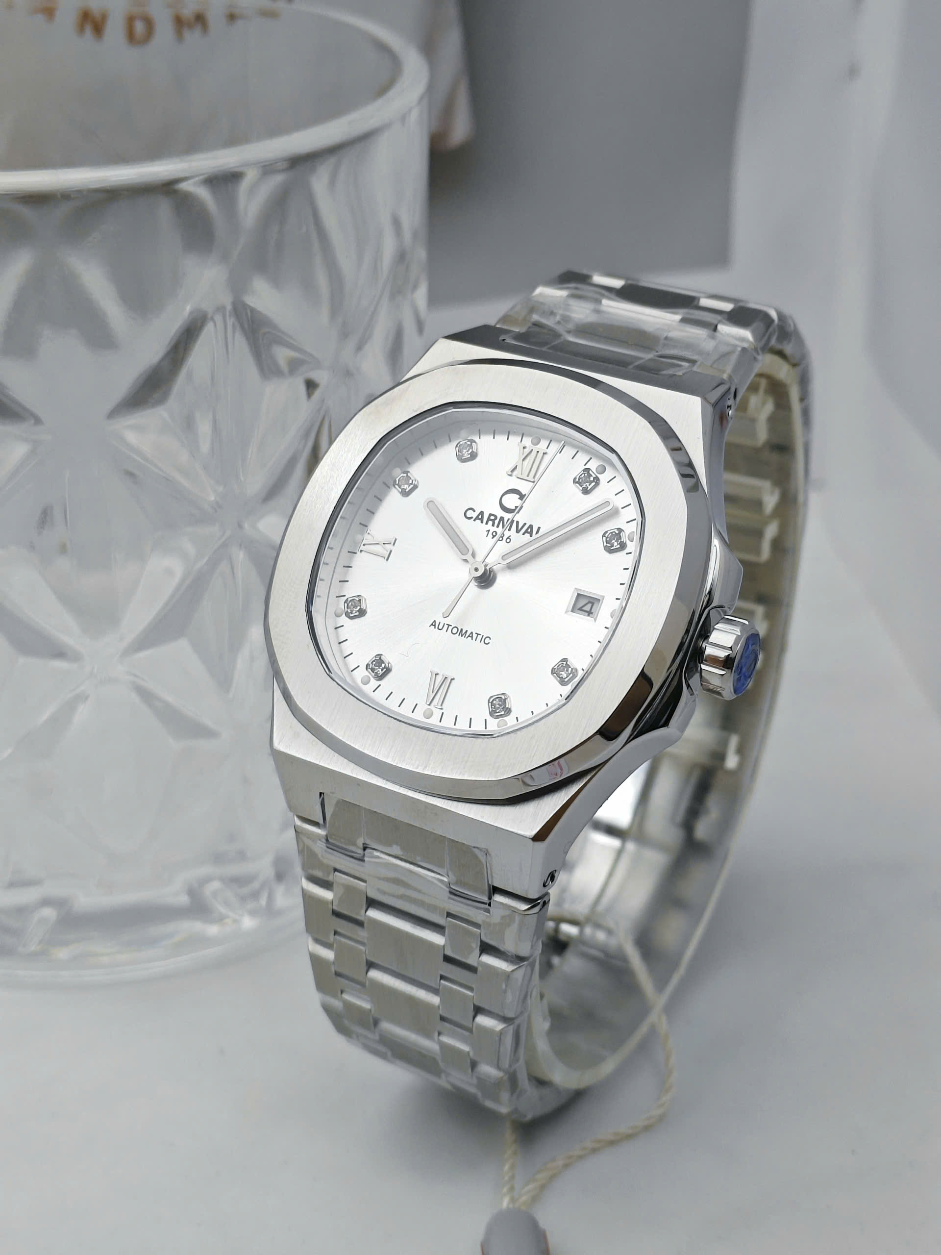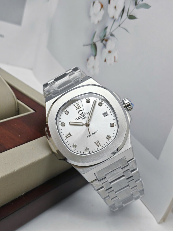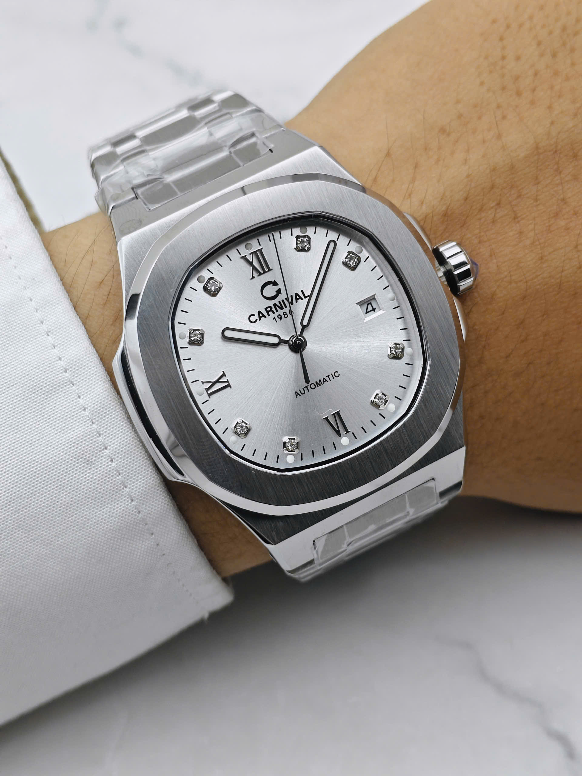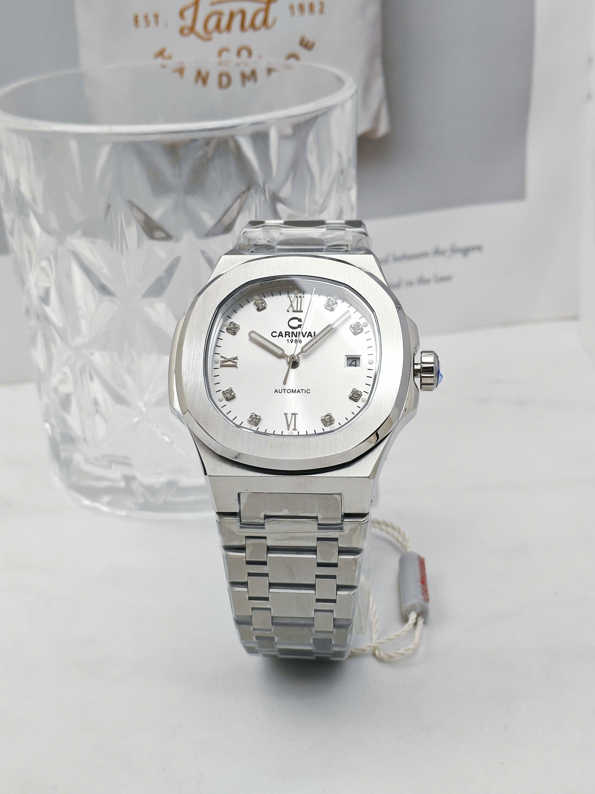 Điểm cộng lớn nhất của Đồng hồ Carnival 8160G-VT-T chính là bộ máy automatic (cơ tự động). Không cần thay pin, chiếc đồng hồ vận hành nhờ vào chuyển động tay hàng ngày của người đeo – mang lại cảm giác gắn bó và đầy chất “nghệ”.