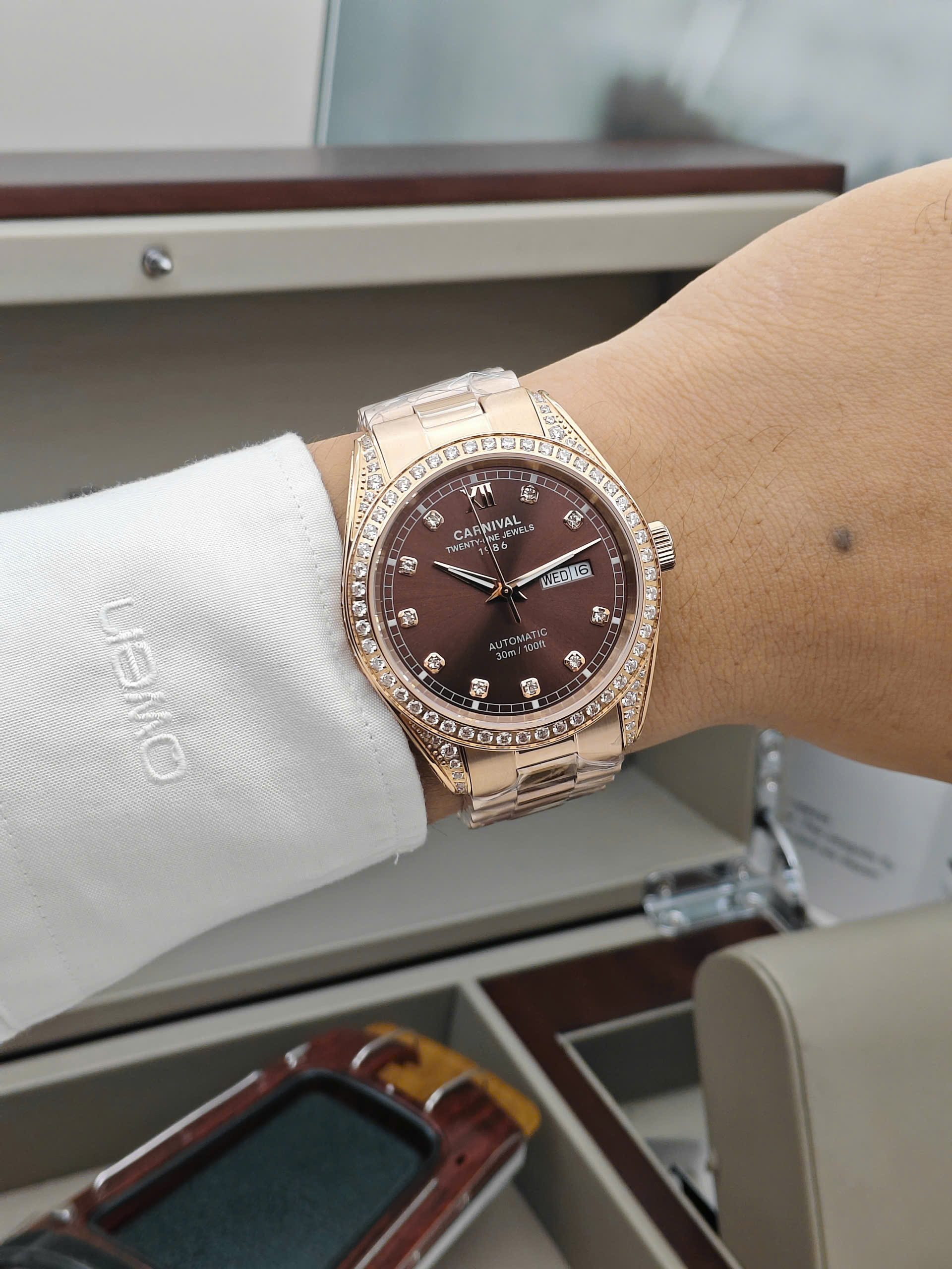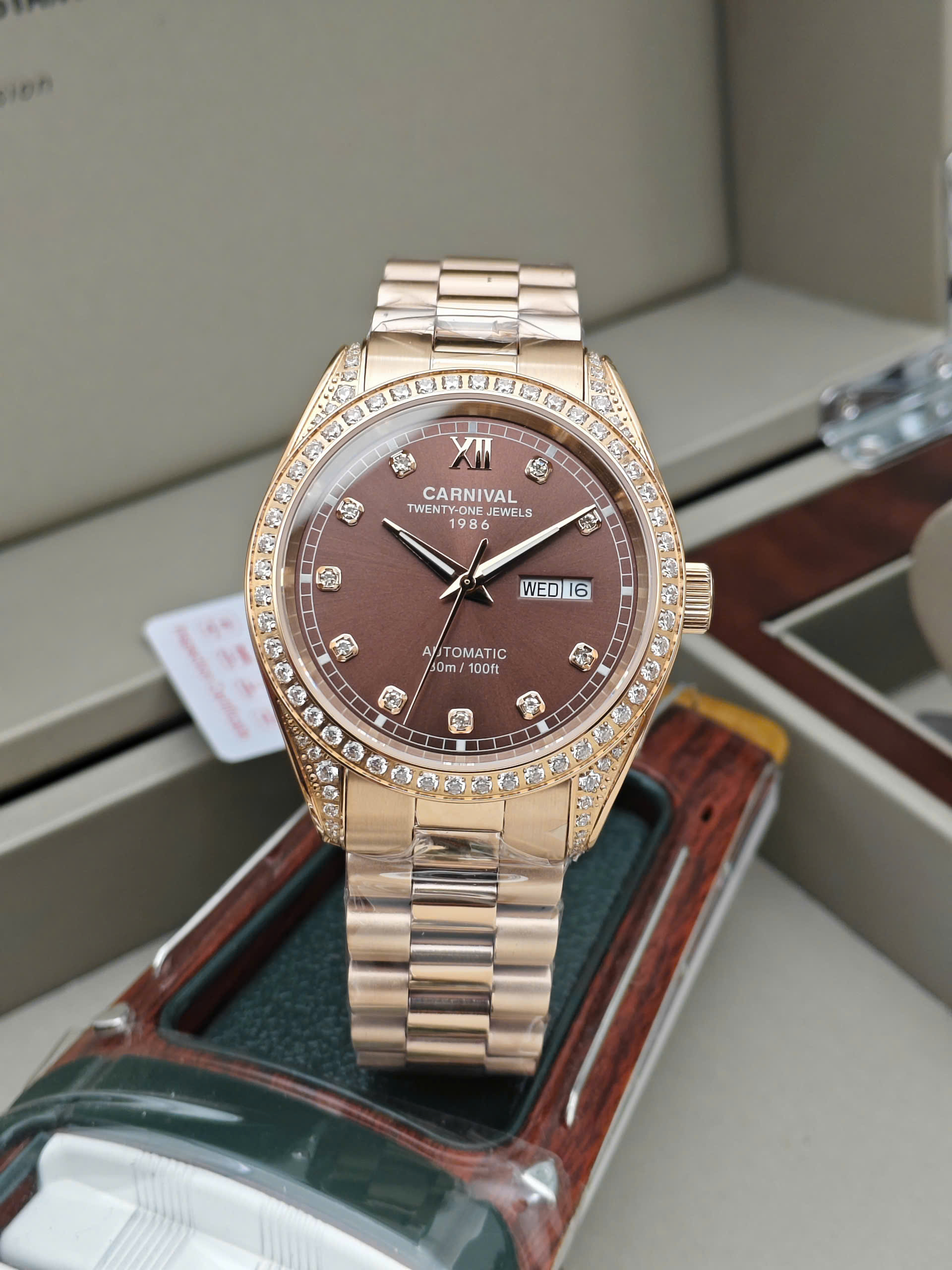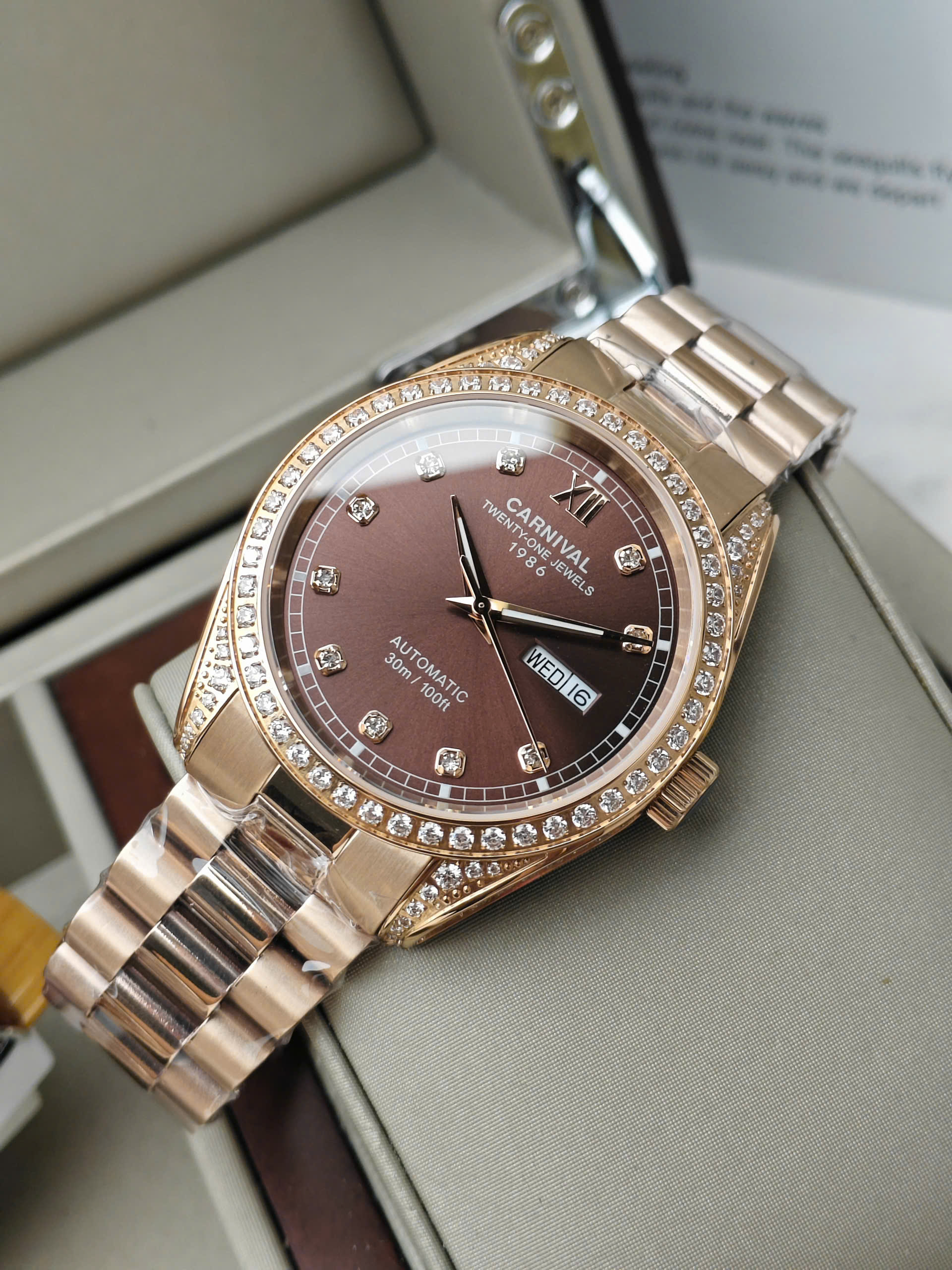 Carnival 8107G mã 8907G-VH-N là mẫu đồng hồ nam mang phong cách sang trọng, lịch lãm theo tinh thần thiết kế Thụy Sỹ. Mặt số màu nâu ấm áp kết hợp viền vàng hồng nổi bật tạo nên vẻ ngoài tinh tế, trưởng thành và đầy cuốn hút. Đường kính mặt số 40mm vừa phải, dễ đeo và phù hợp với nhiều kích thước cổ tay, đặc biệt lý tưởng cho những quý ông yêu thích phong cách cổ điển pha chút hiện đại trong môi trường công sở hoặc các dịp trang trọng.