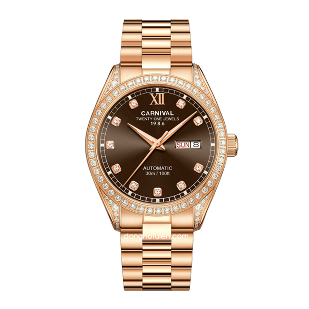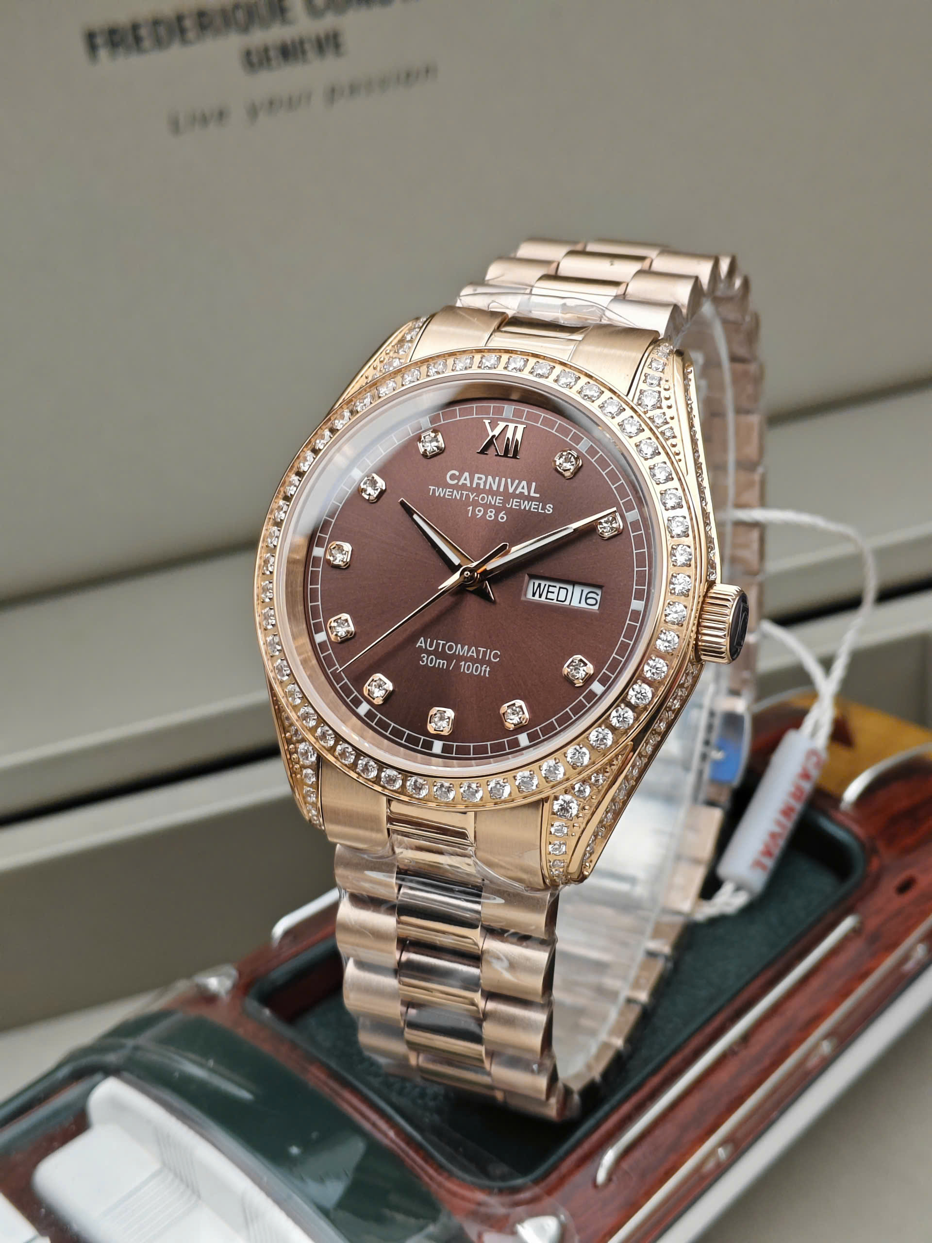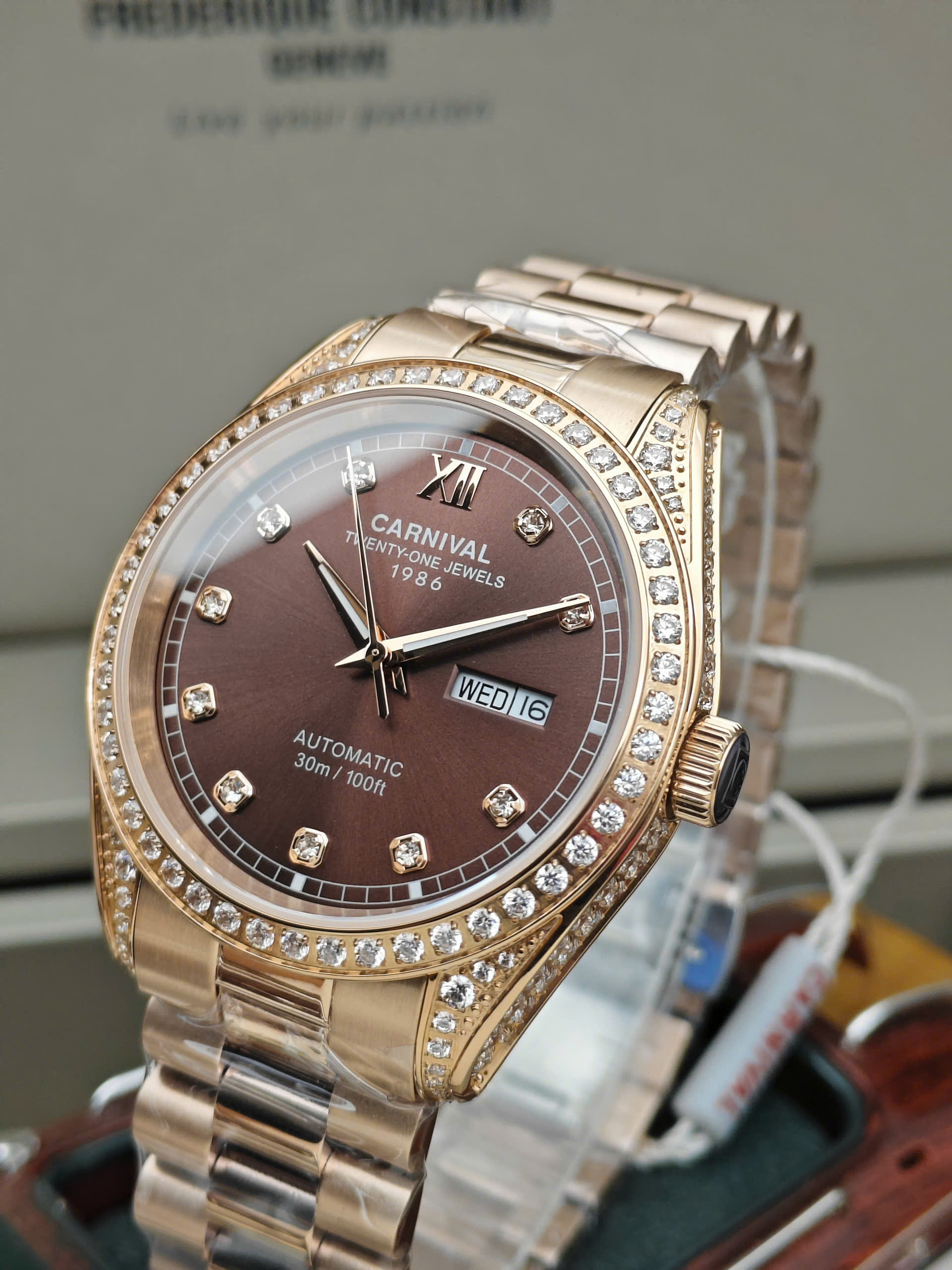 Carnival 8107G mã 8907G-VH-N là mẫu đồng hồ nam mang phong cách sang trọng, lịch lãm theo tinh thần thiết kế Thụy Sỹ. Mặt số màu nâu ấm áp kết hợp viền vàng hồng nổi bật tạo nên vẻ ngoài tinh tế, trưởng thành và đầy cuốn hút. Đường kính mặt số 40mm vừa phải, dễ đeo và phù hợp với nhiều kích thước cổ tay, đặc biệt lý tưởng cho những quý ông yêu thích phong cách cổ điển pha chút hiện đại trong môi trường công sở hoặc các dịp trang trọng.