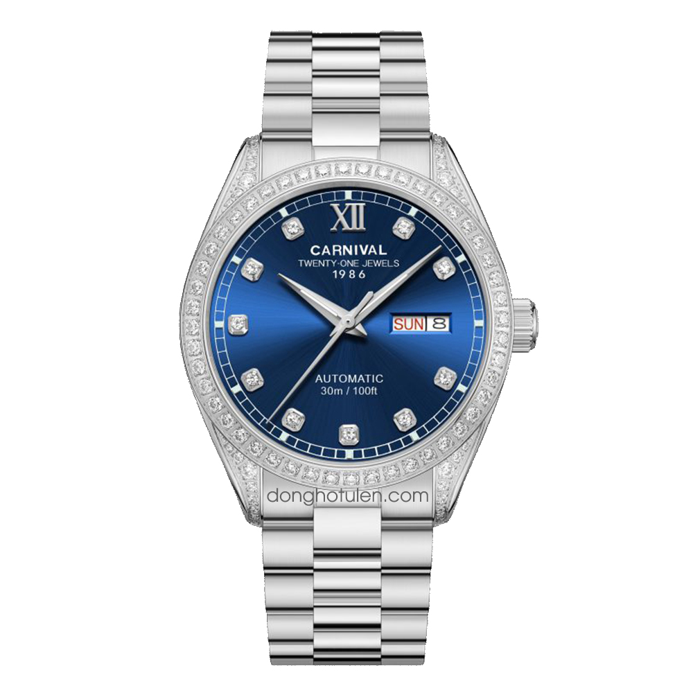 Đồng hồ Carnival 8907G-VT-X được trang bị cỗ máy Automatic. Mặt số màu xanh dương với các cọc số kim cương đính nổi trên mặt đồng hồ mang đến sự sang trọng cho người đeo. Đồng hồ được thiết kế 3 kim có tông màu bạc với chức năng giờ, phút, giây. Lịch ngày được bài trí ở góc 3 giờ rất tiện dụng. Xung quanh viền mặt đồng hồ đính kim cương lấp lánh.