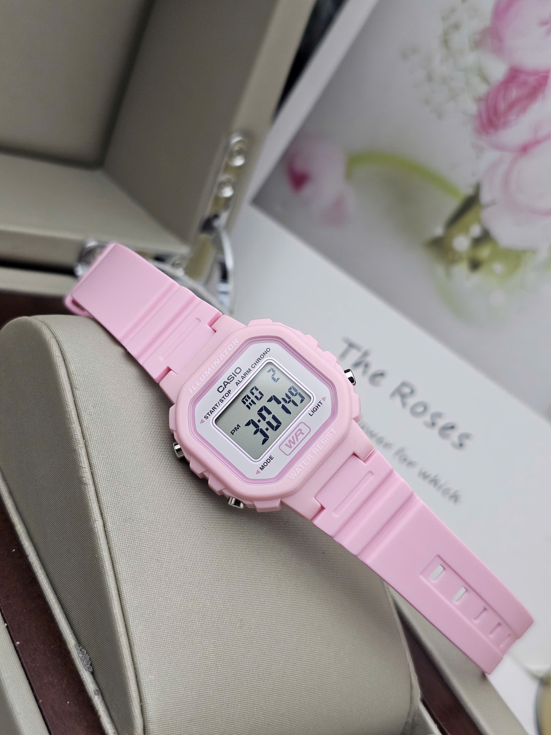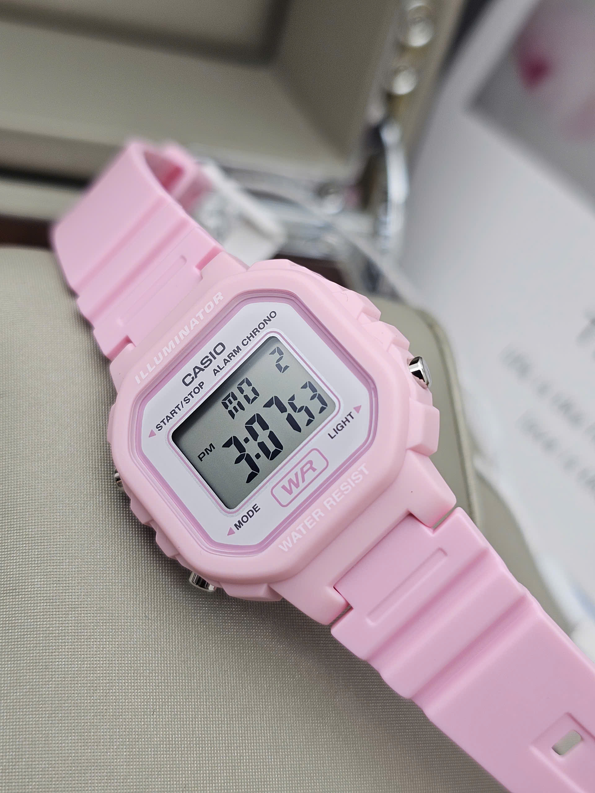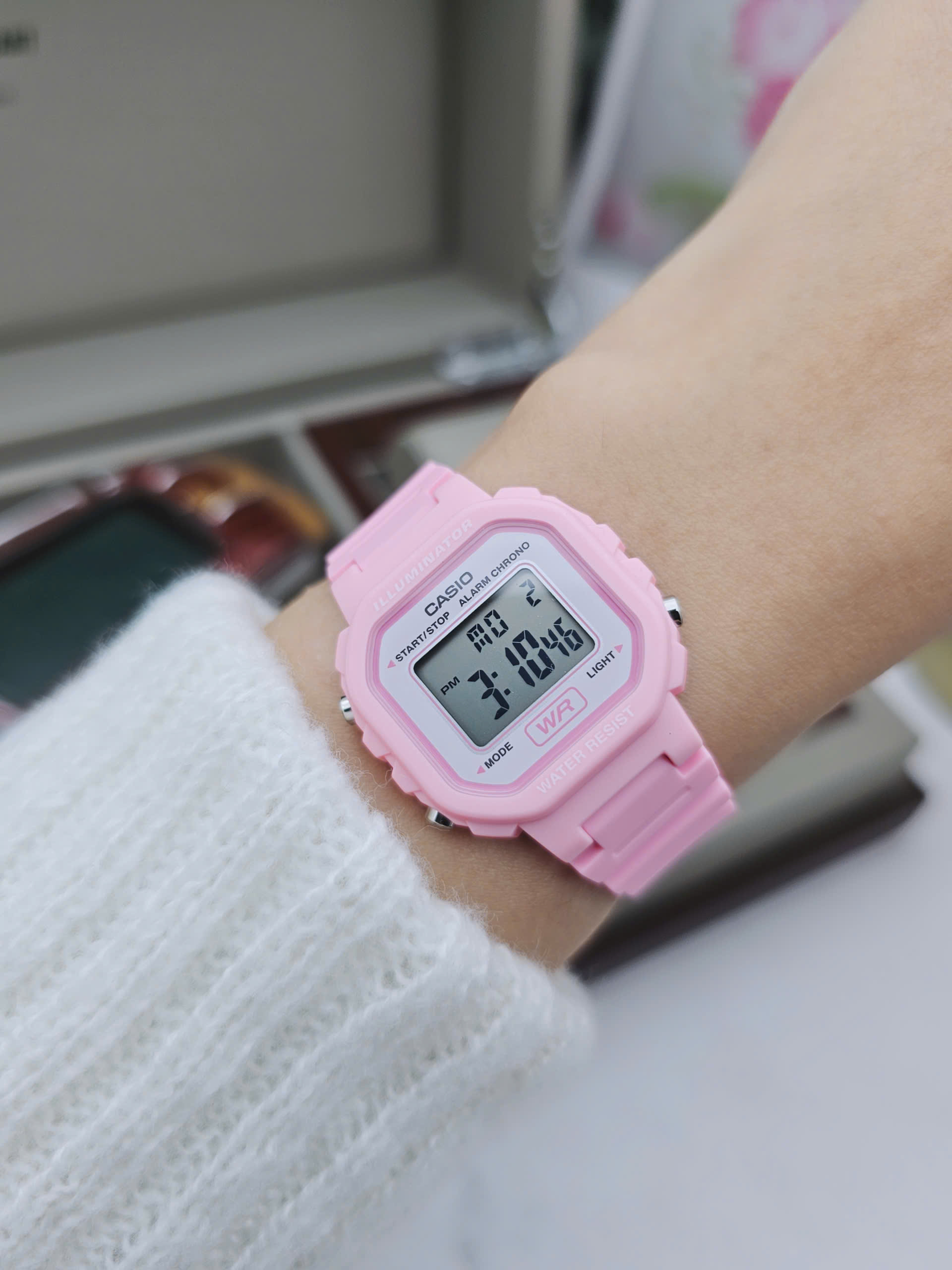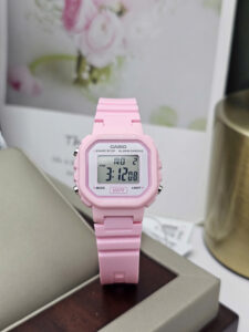 Đồng hồ nữ CASIO LA-20WH-4A1DF là mẫu đồng hồ điện tử trẻ trung, năng động đến từ thương hiệu Casio Nhật Bản. Thiết kế nổi bật với tông màu hồng ngọt ngào kết hợp mặt số trắng dễ nhìn, phù hợp với phong cách nữ tính và hiện đại. Vỏ nhựa cùng dây cao su nhẹ, bền, mang lại cảm giác thoải mái khi đeo suốt ngày dài. Đường kính mặt 30mm và độ dày 8.5mm giúp đồng hồ ôm tay gọn gàng, phù hợp cho cổ tay nhỏ.