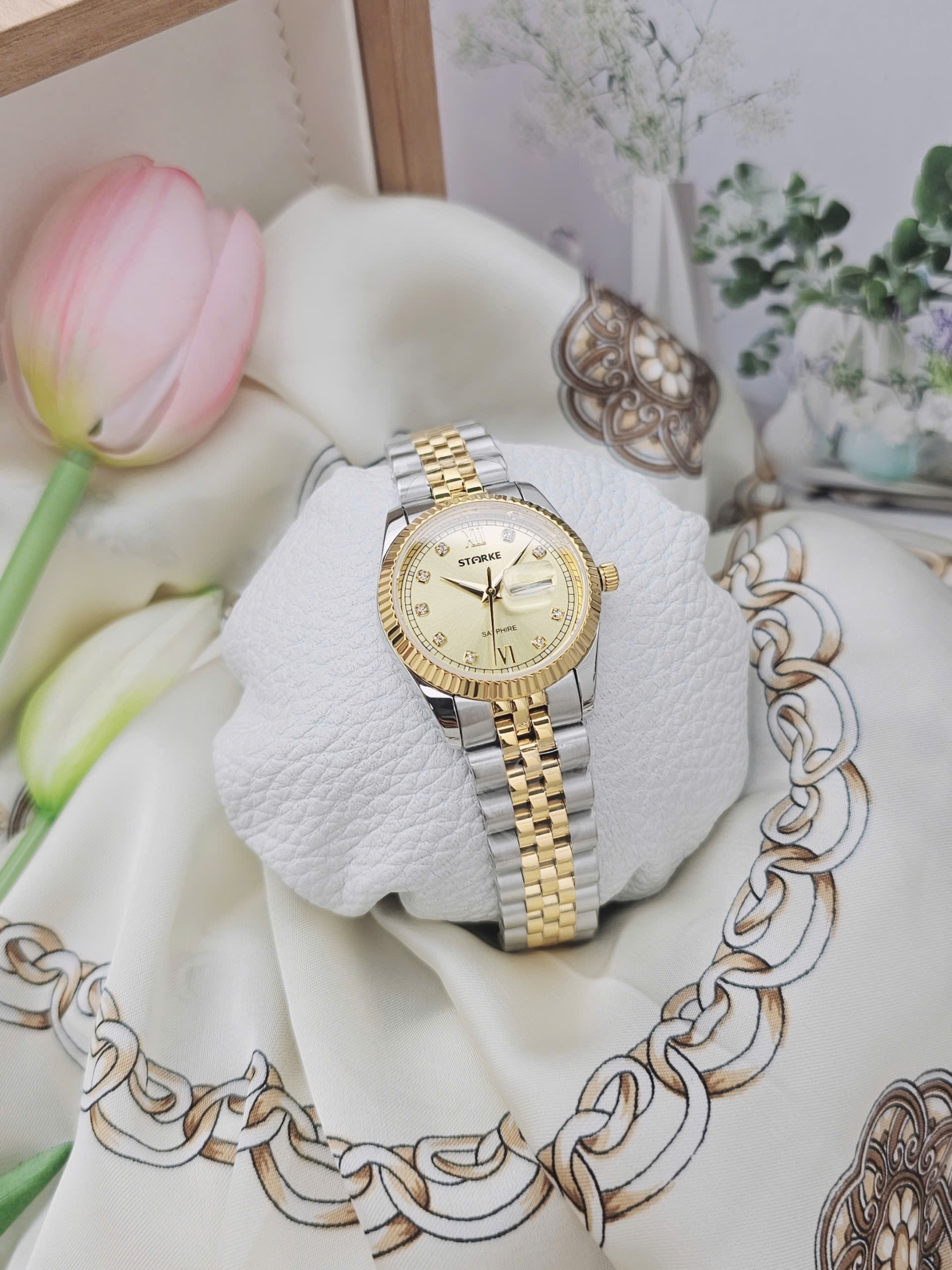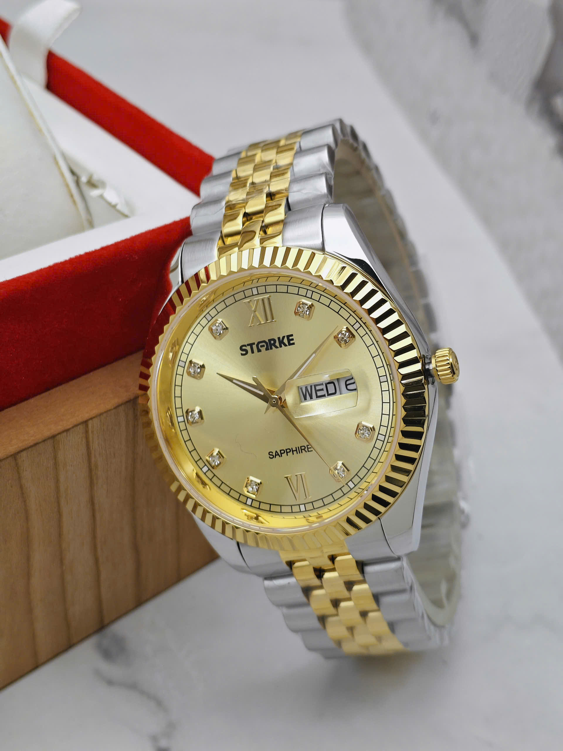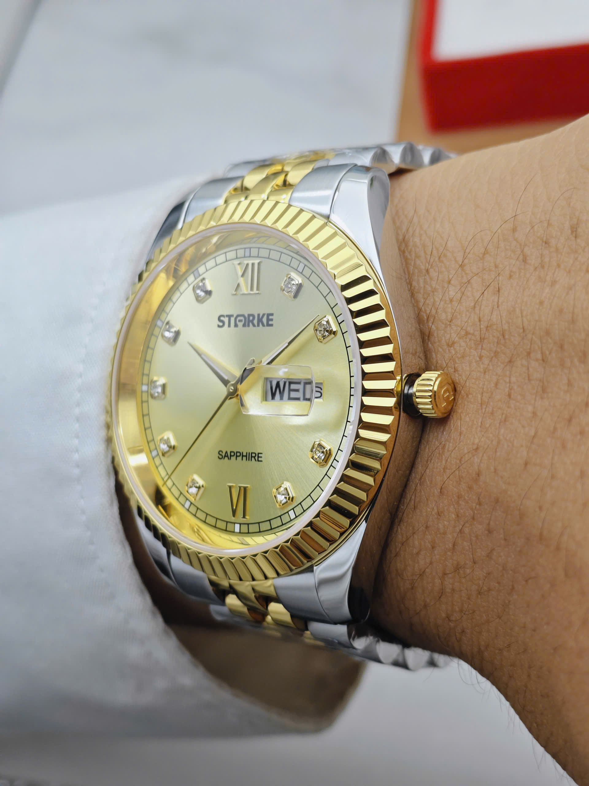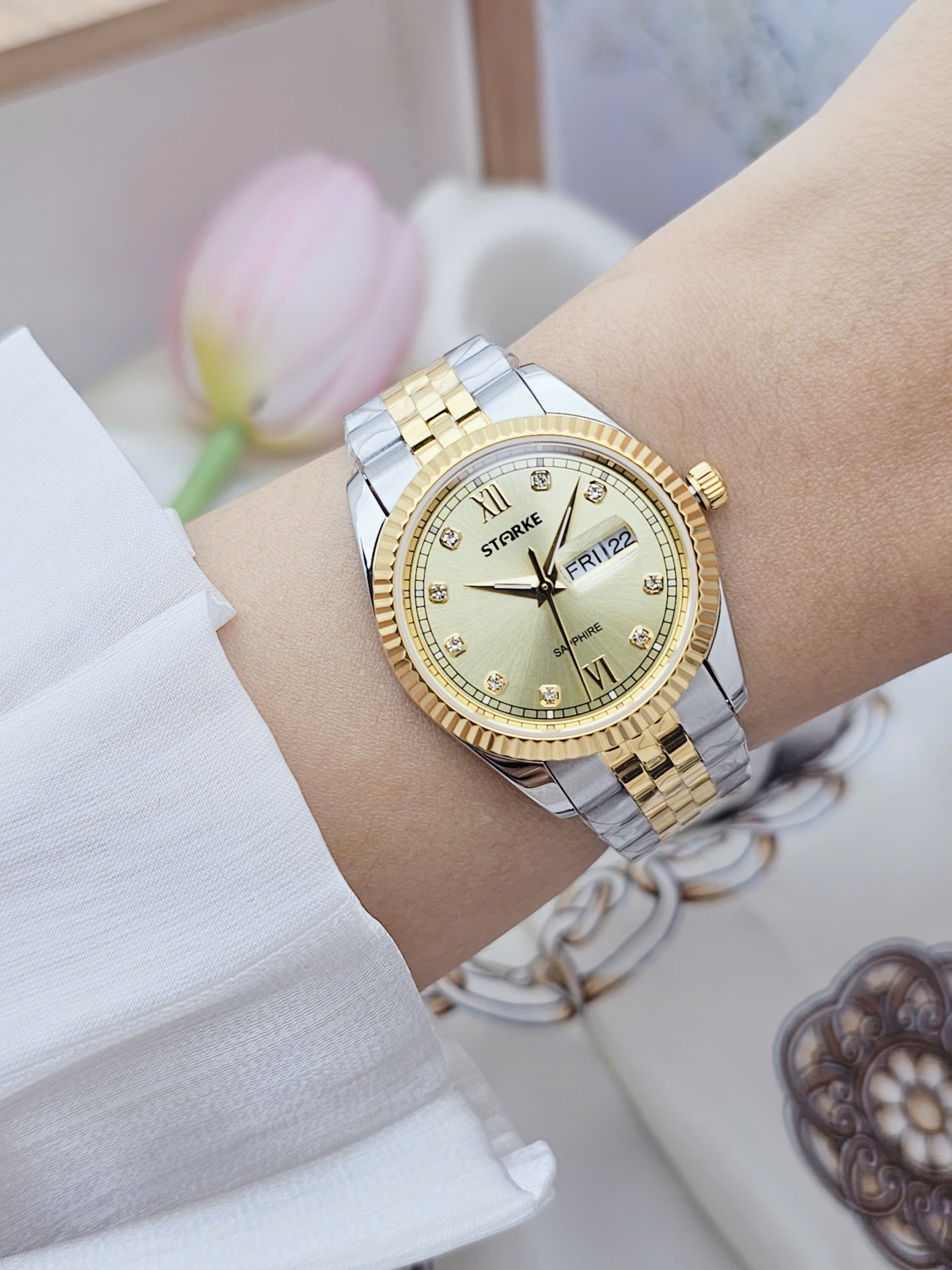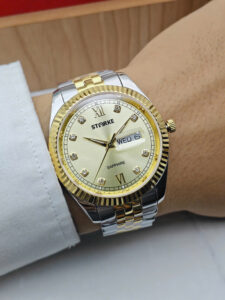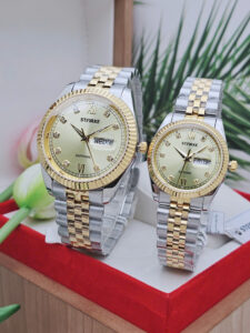 Đồng hồ đôi Starke SK185AL & SK185AM là biểu tượng của sự gắn kết và phong cách tinh tế dành cho các cặp đôi hiện đại. Thuộc thương hiệu Starke đến từ Đức, bộ đôi sở hữu thiết kế đồng bộ với vỏ thép không gỉ màu bạc kết hợp dây demi vàng – trắng sang trọng. Mặt số vàng nổi bật tạo cảm giác ấm áp, cao cấp, thể hiện sự hòa hợp trong phong cách của hai người. Thiết kế thanh lịch giúp cặp đồng hồ dễ dàng phù hợp trong nhiều hoàn cảnh sử dụng.