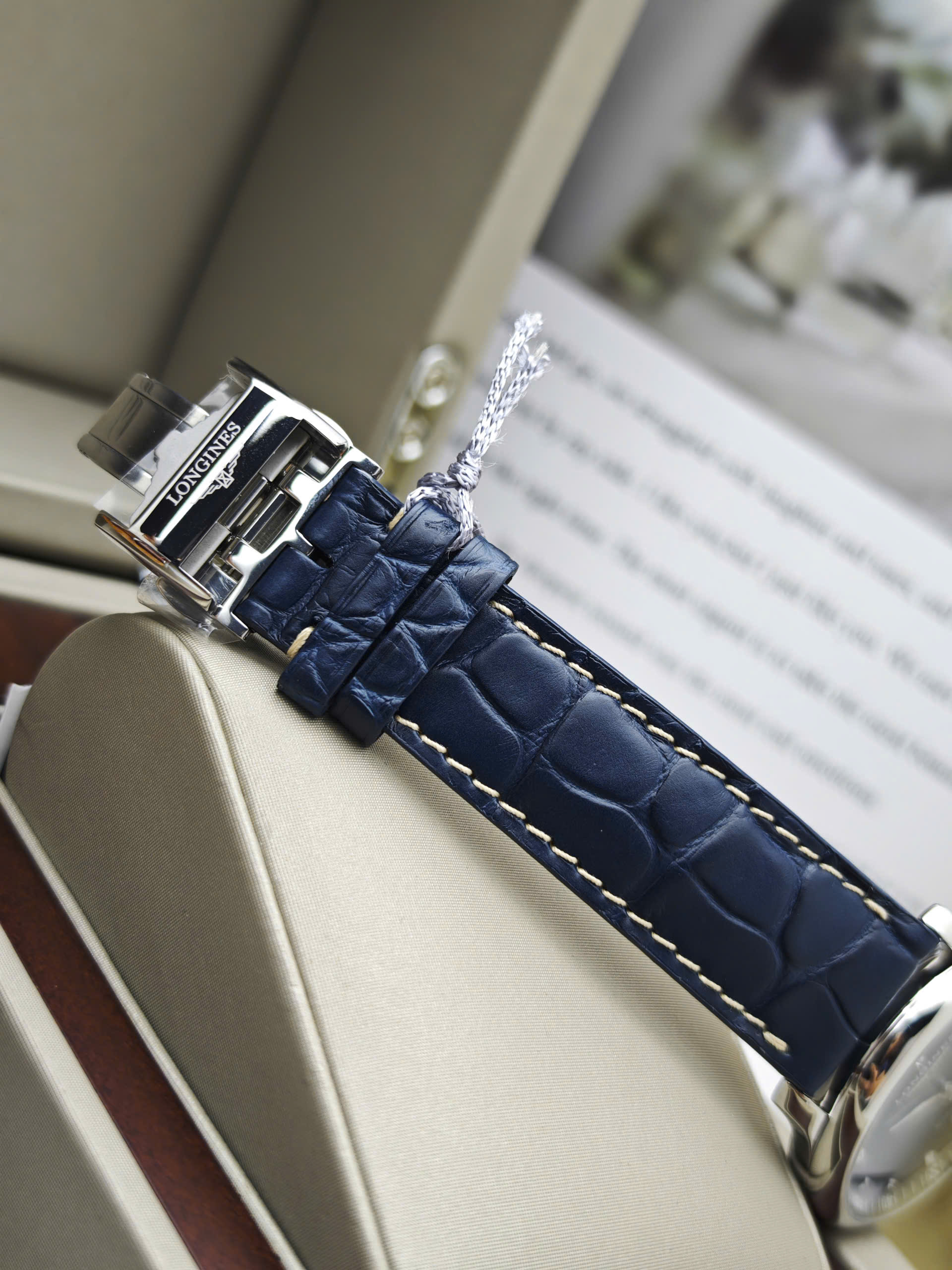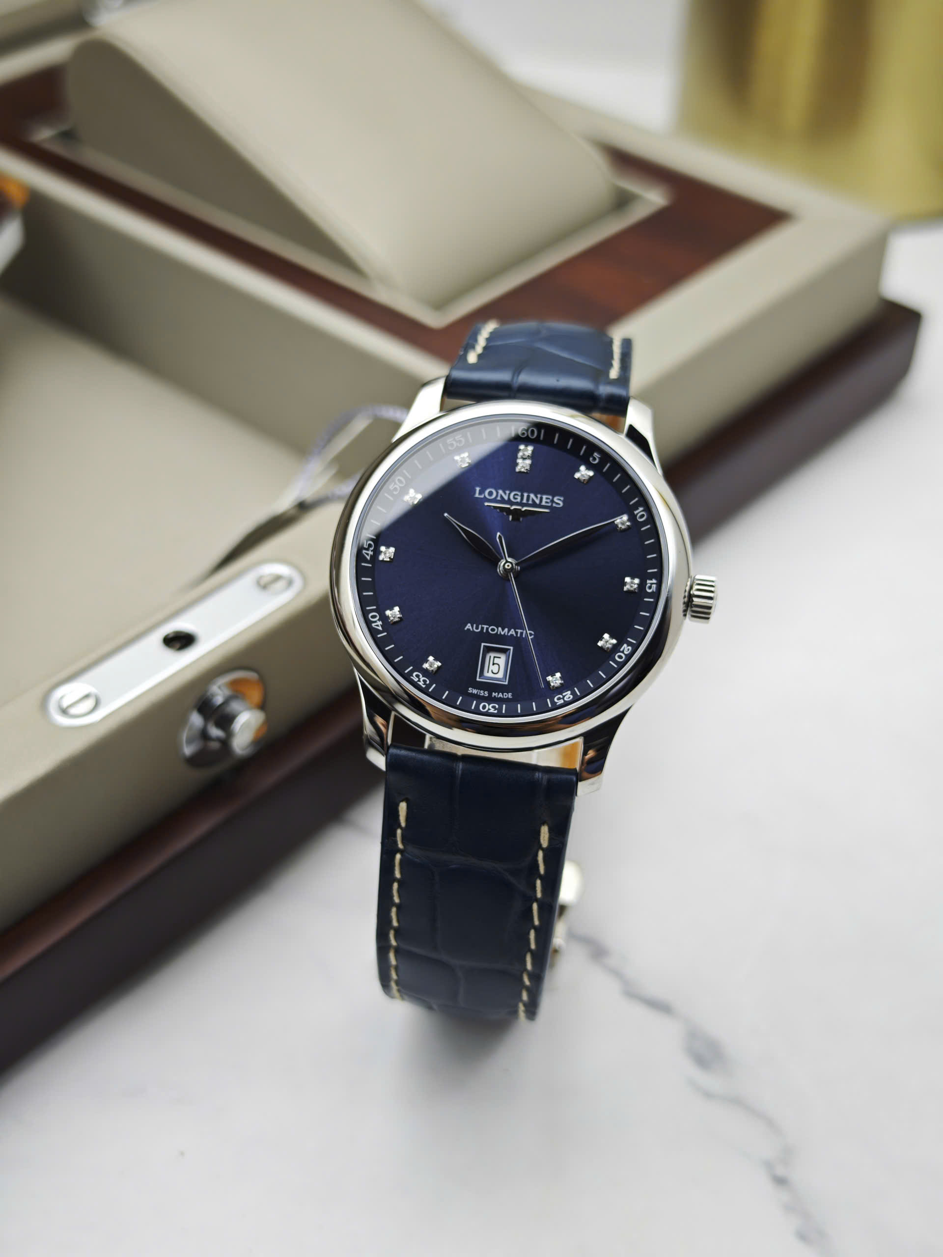 Longines Master 12 Diamonds 38.5mm L2.628.4.97.0 là mẫu đồng hồ nam cao cấp mang đậm phong cách thanh lịch và tinh xảo của thương hiệu Longines đến từ Thụy Sỹ. Thiết kế mặt tròn kích thước 38.5mm vừa vặn với cổ tay nam giới, tạo cảm giác sang trọng nhưng không quá phô trương. Mặt số màu xanh sâu lắng được tô điểm bằng 12 viên kim cương tại vị trí cọc giờ, mang lại điểm nhấn đẳng cấp và tinh tế, phù hợp cho những quý ông yêu thích sự lịch lãm.