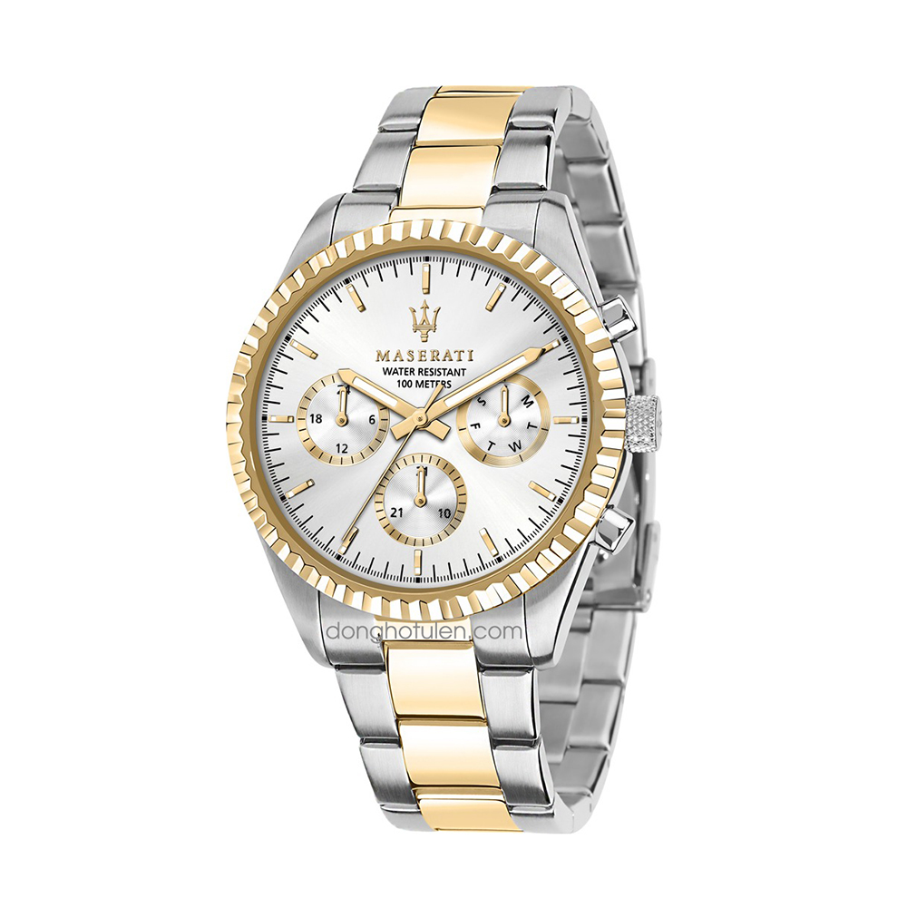 Đồng hồ Maserati Compizione – R8853100021 là mẫu đồng hồ mang đậm tinh thần thể thao xen lẫn sự sang trọng đặc trưng của thương hiệu Ý. Thiết kế mặt tròn đường kính 43 mm cùng vỏ thép không gỉ bạc tạo cảm giác mạnh mẽ và chắc chắn. Mặt số bạc kết hợp bộ kim vàng nổi bật giúp tăng độ tương phản, giúp người dùng dễ dàng quan sát giờ trong mọi hoàn cảnh. Kính khoáng chịu lực tốt, hạn chế trầy xước và giữ độ trong suốt lâu dài. Với khả năng chống nước 10 Bar, mẫu đồng hồ này phù hợp cho sinh hoạt hằng ngày và cả các hoạt động bơi nhẹ. Tổng thể thiết kế toát lên sự nam tính, hiện đại, đặc biệt phù hợp với những ai muốn tìm một phụ kiện vừa thời trang vừa đậm chất Maserati.