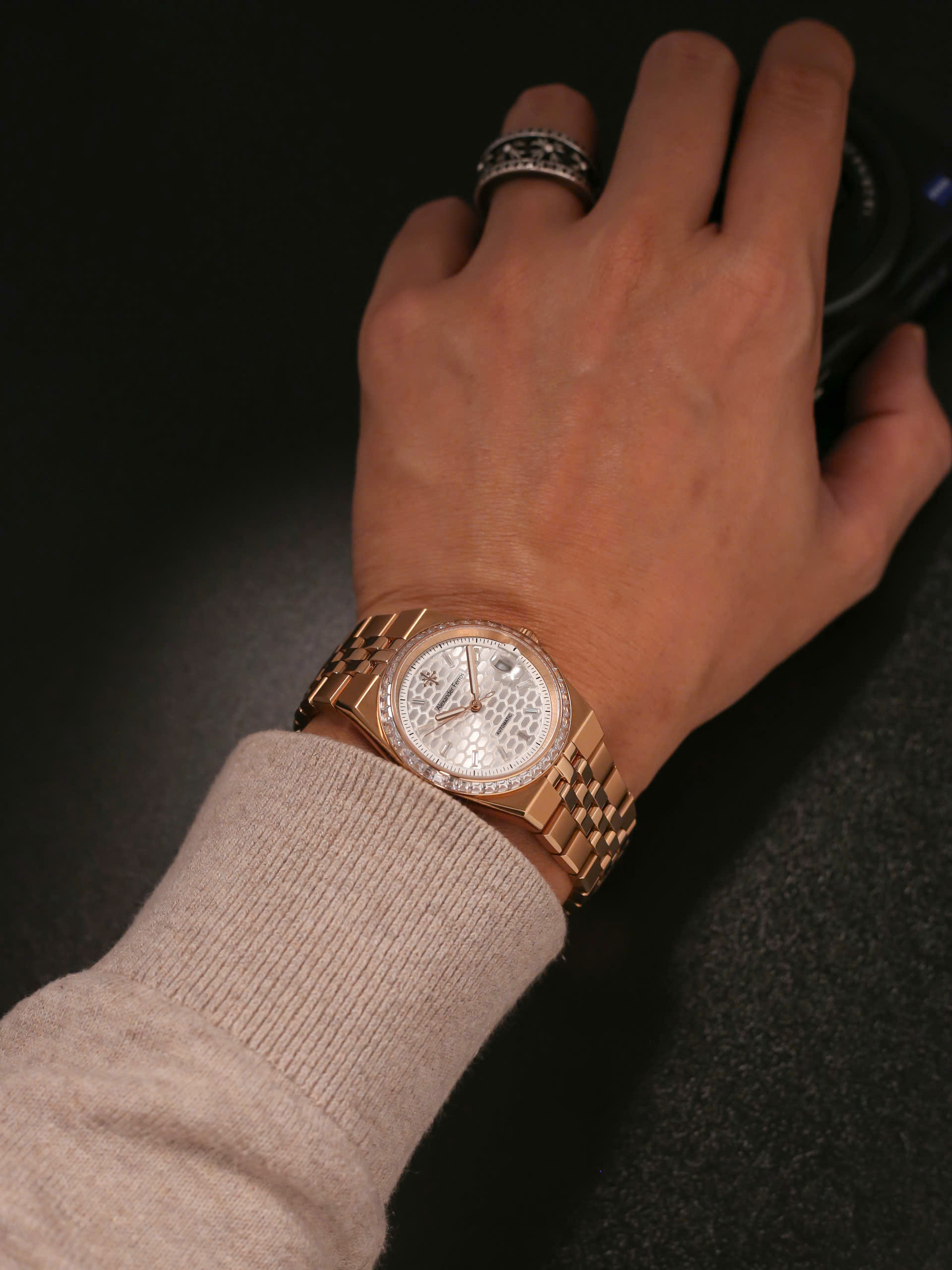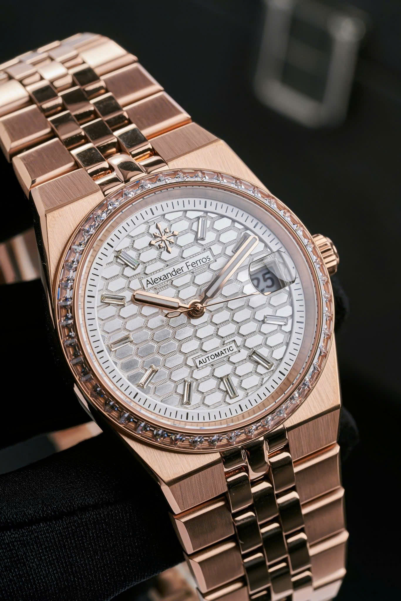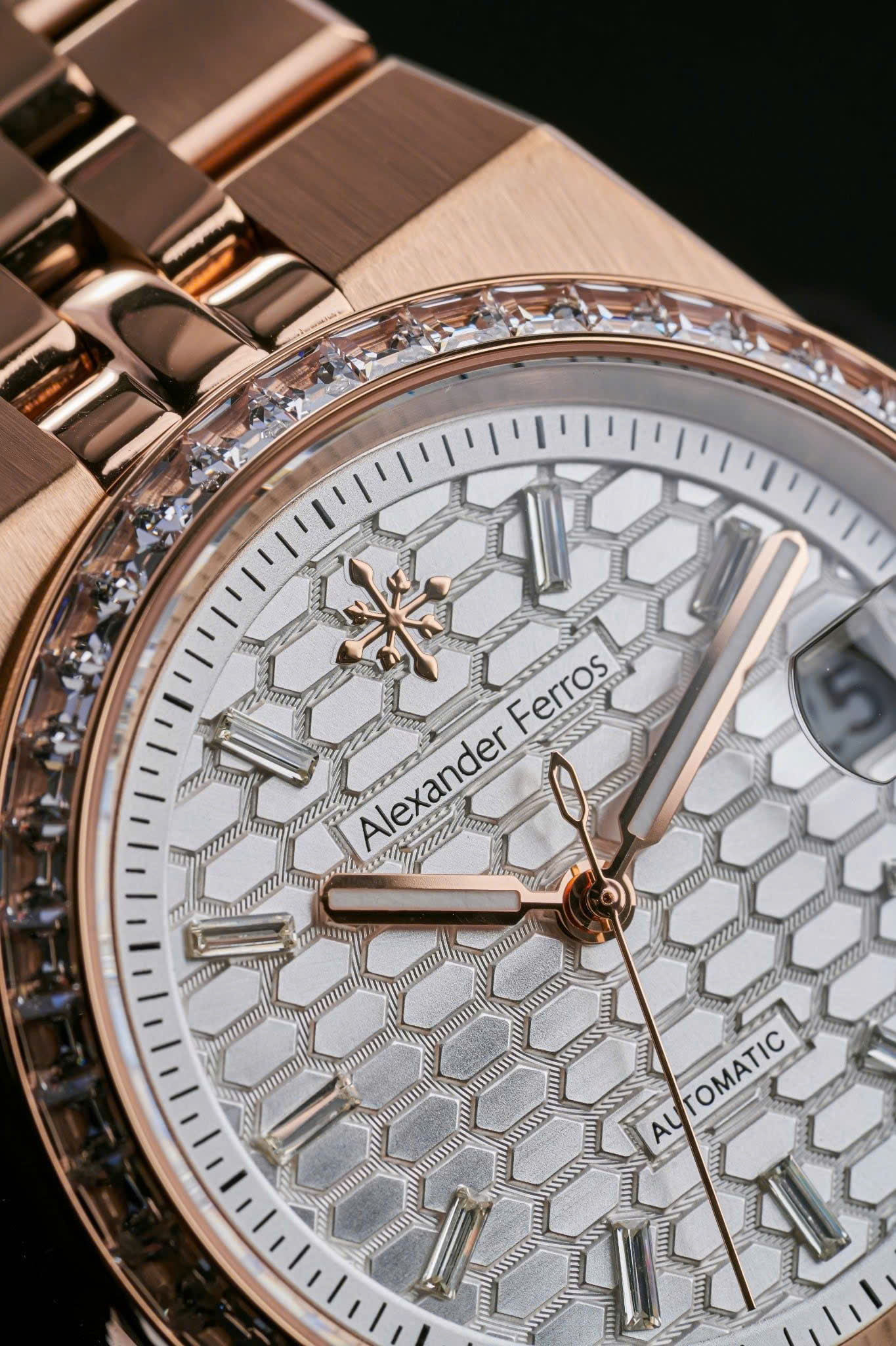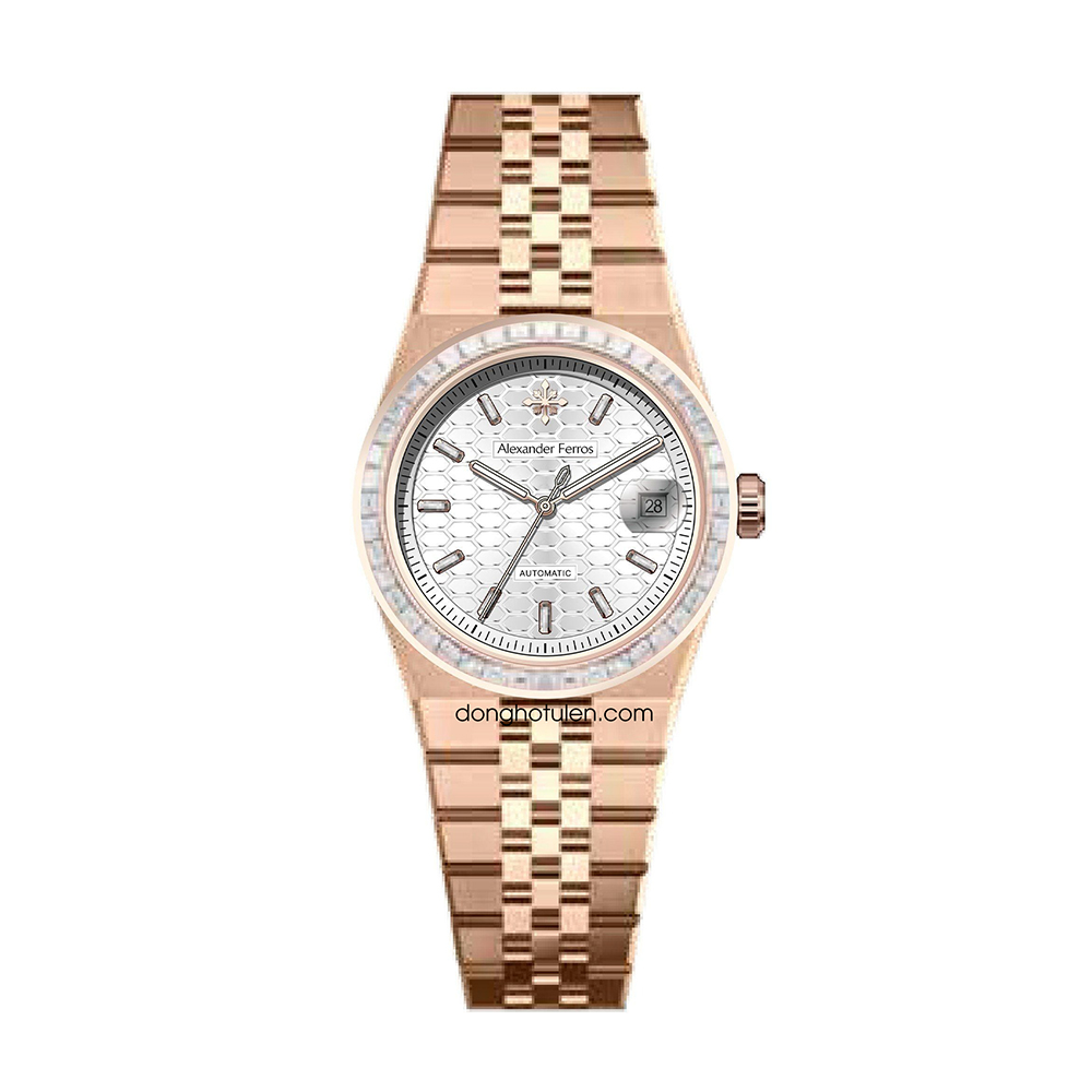 Alexander Ferros 8181R02 sở hữu thiết kế thanh lịch với mặt số trắng trang nhã, kết hợp viền và dây thép mạ vàng hồng rosegold sang trọng. Kích thước mặt 36mm gọn gàng, phù hợp với những quý ông yêu phong cách tinh giản và cổ điển. Vỏ thép không gỉ cùng mặt kính sapphire mang lại vẻ ngoài bền bỉ, sáng đẹp theo thời gian, giúp đồng hồ dễ dàng đồng hành trong nhiều hoàn cảnh khác nhau.