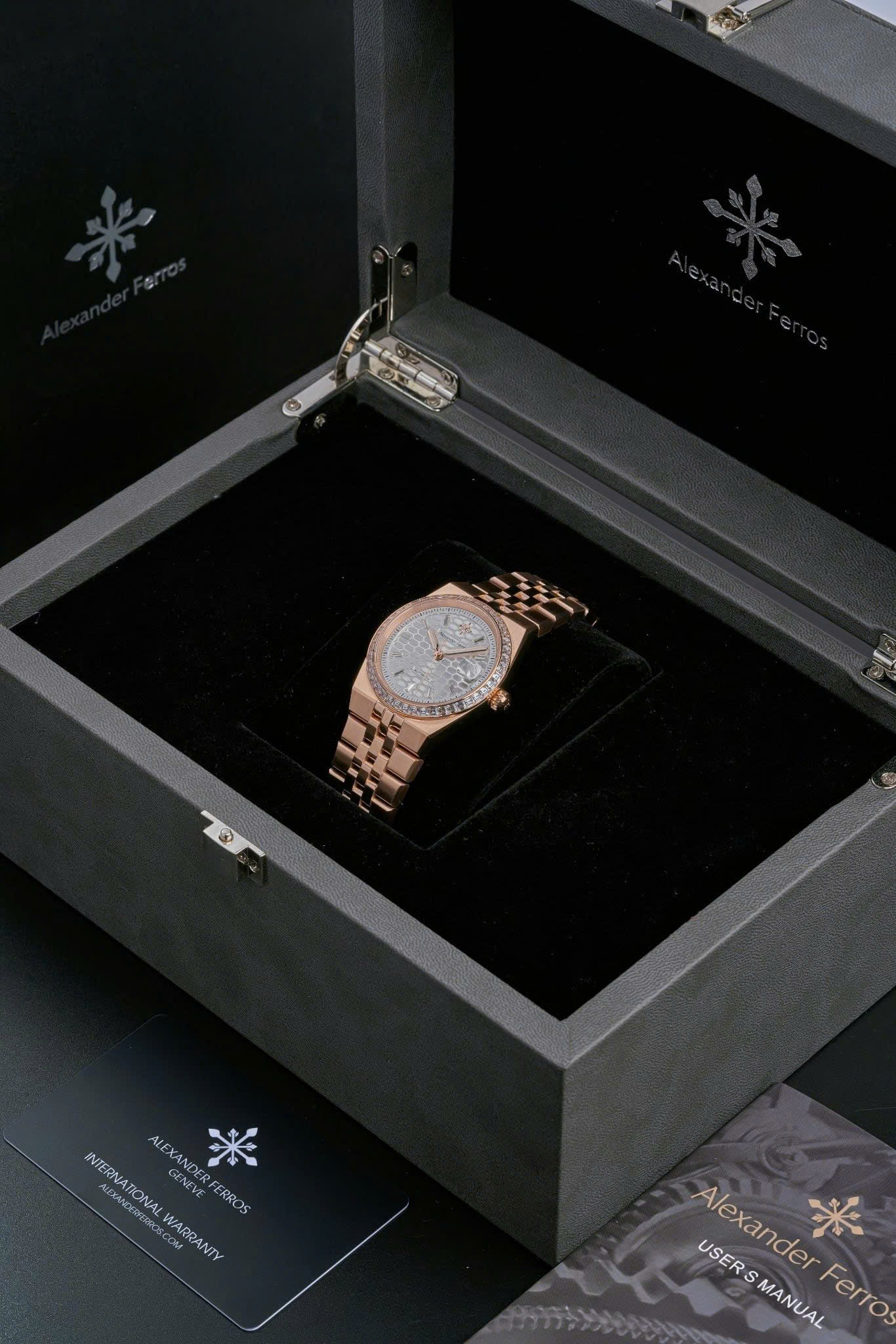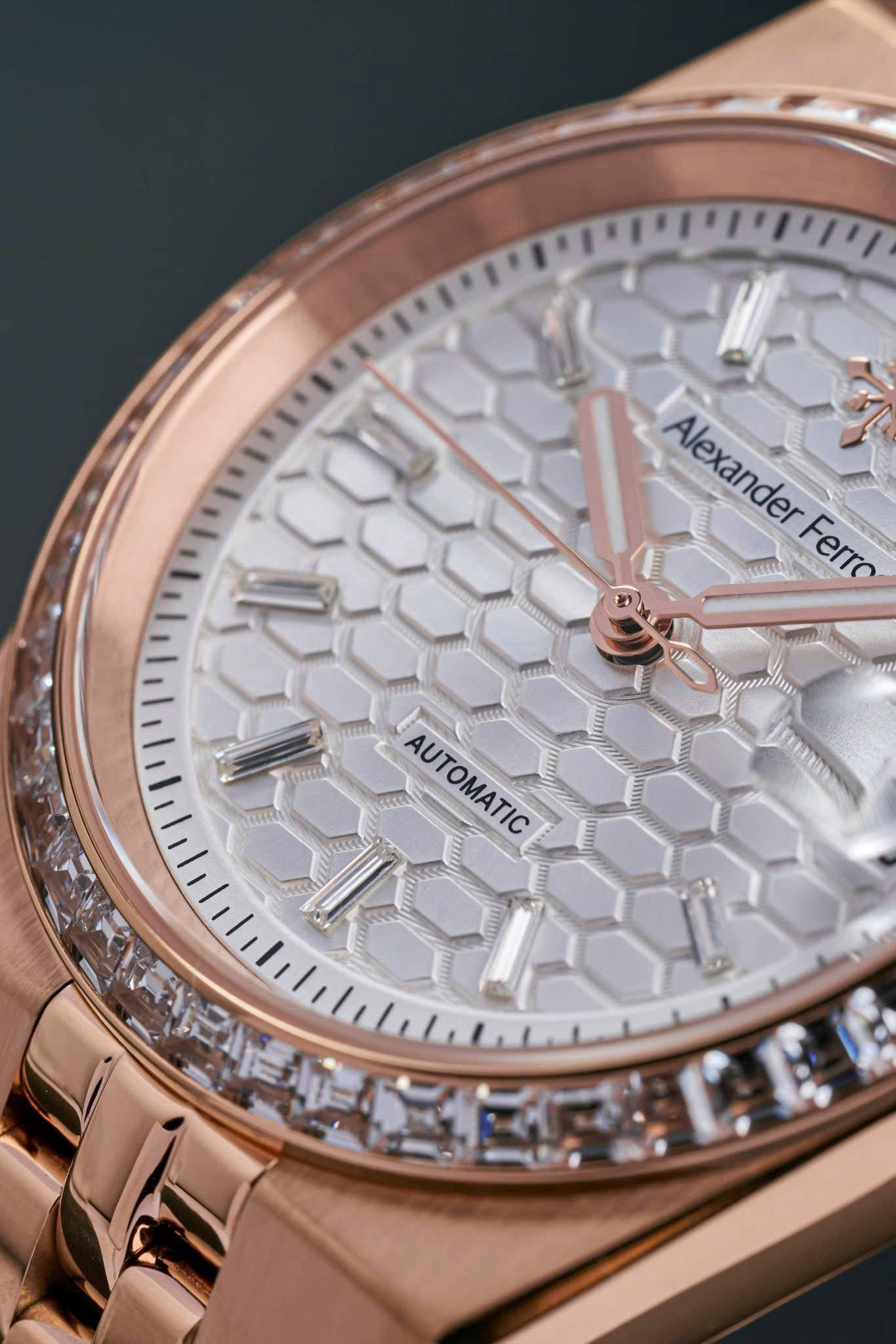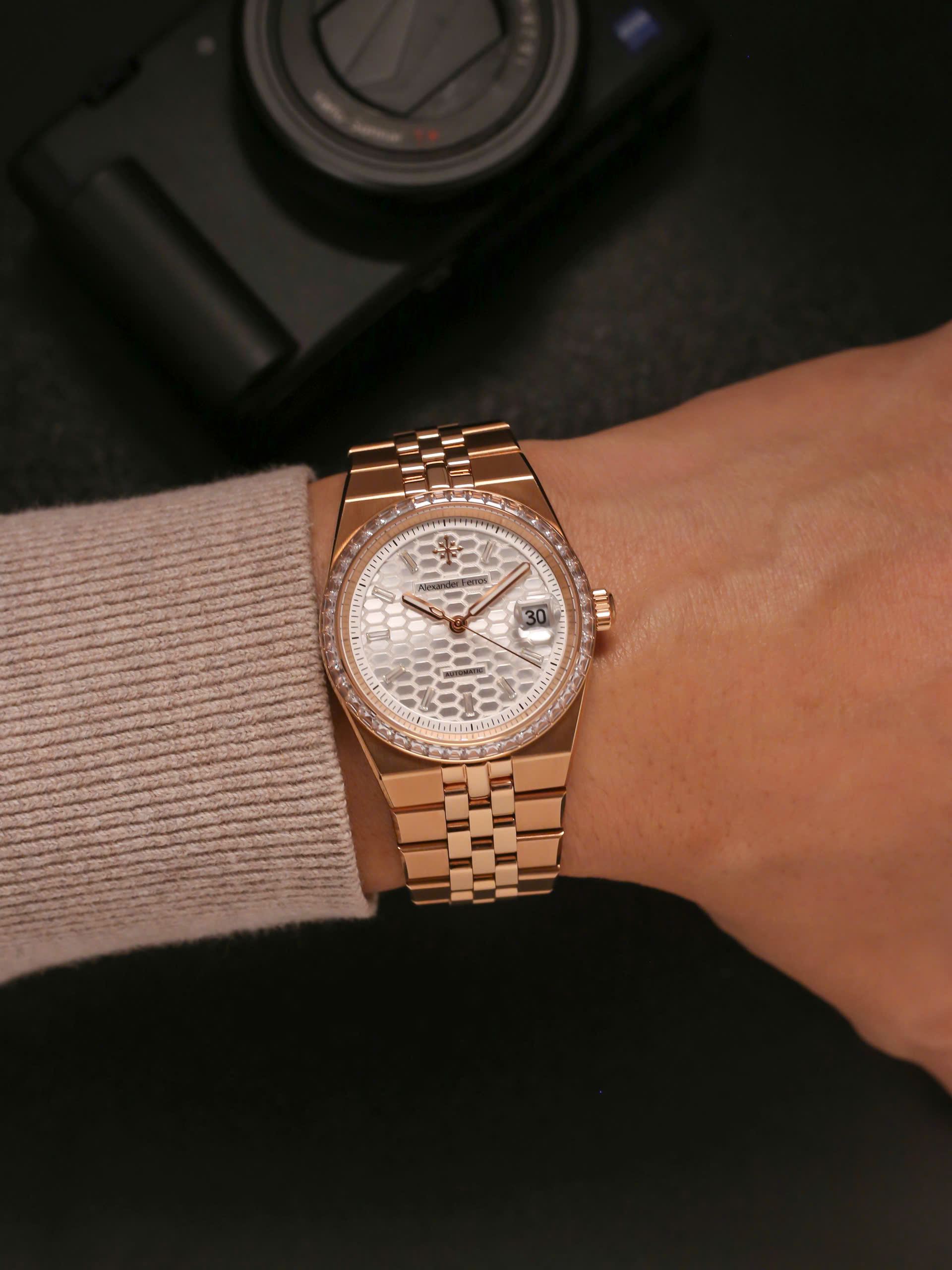 Alexander Ferros 8181R02 sở hữu thiết kế thanh lịch với mặt số trắng trang nhã, kết hợp viền và dây thép mạ vàng hồng rosegold sang trọng. Kích thước mặt 36mm gọn gàng, phù hợp với những quý ông yêu phong cách tinh giản và cổ điển. Vỏ thép không gỉ cùng mặt kính sapphire mang lại vẻ ngoài bền bỉ, sáng đẹp theo thời gian, giúp đồng hồ dễ dàng đồng hành trong nhiều hoàn cảnh khác nhau.