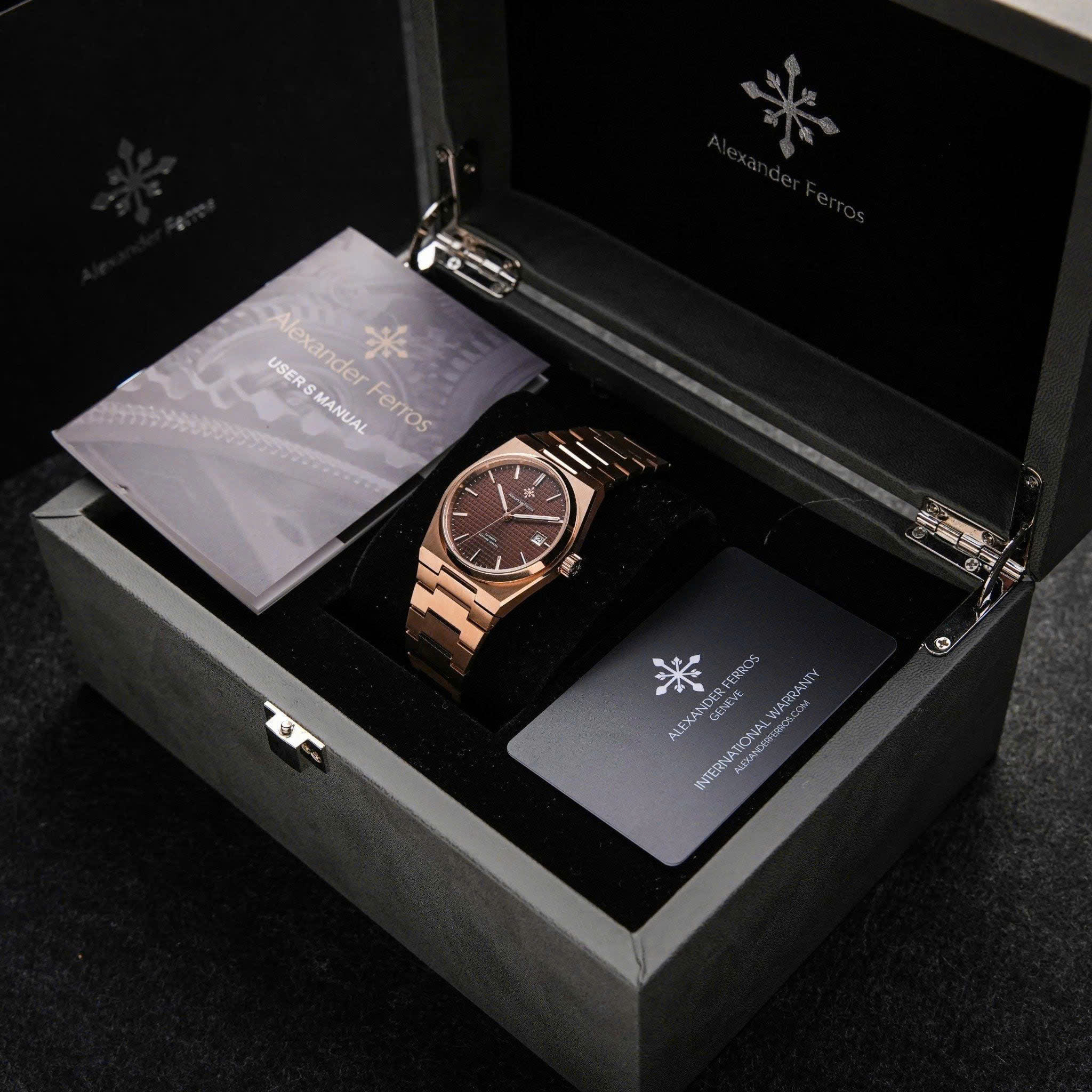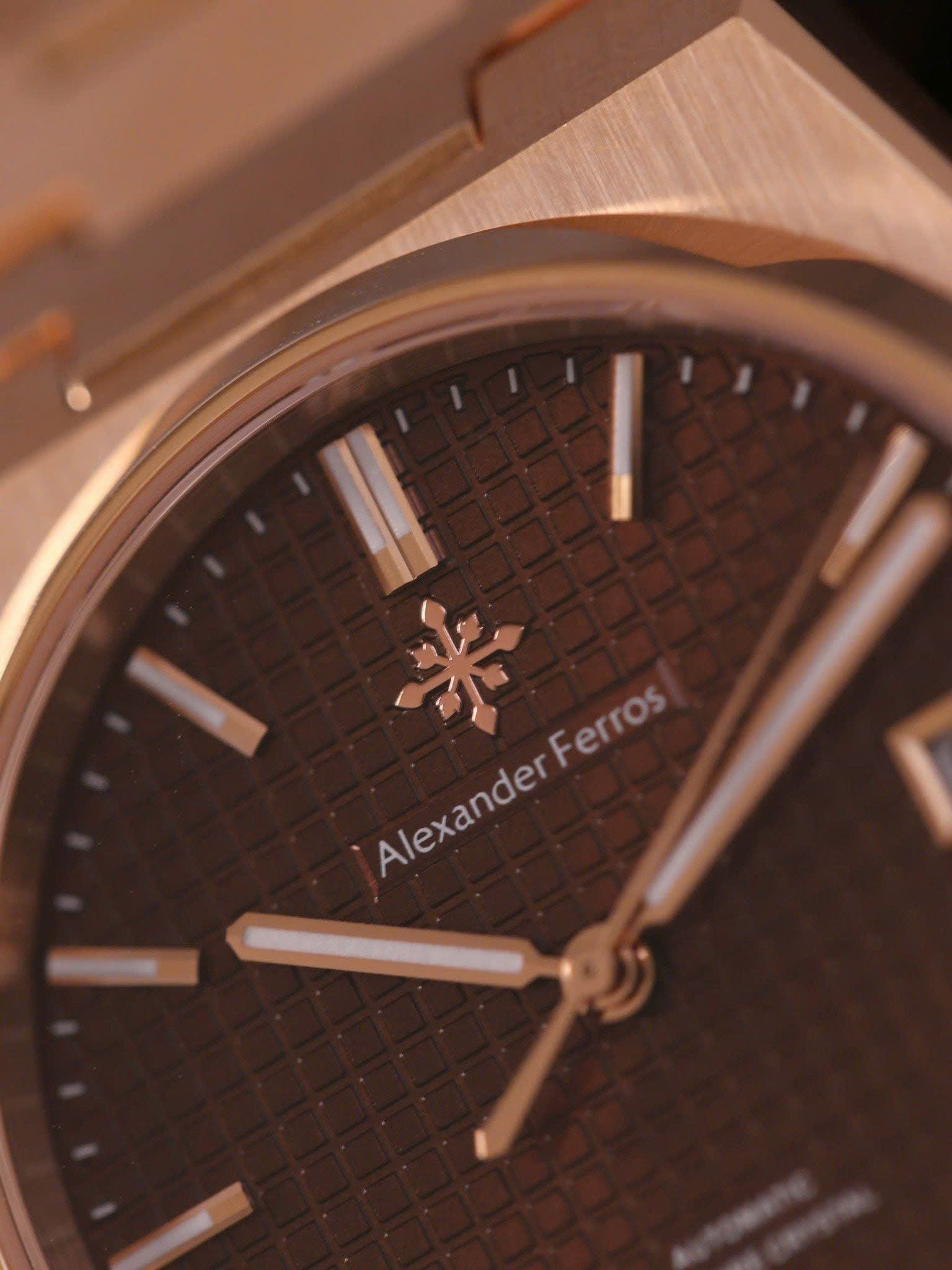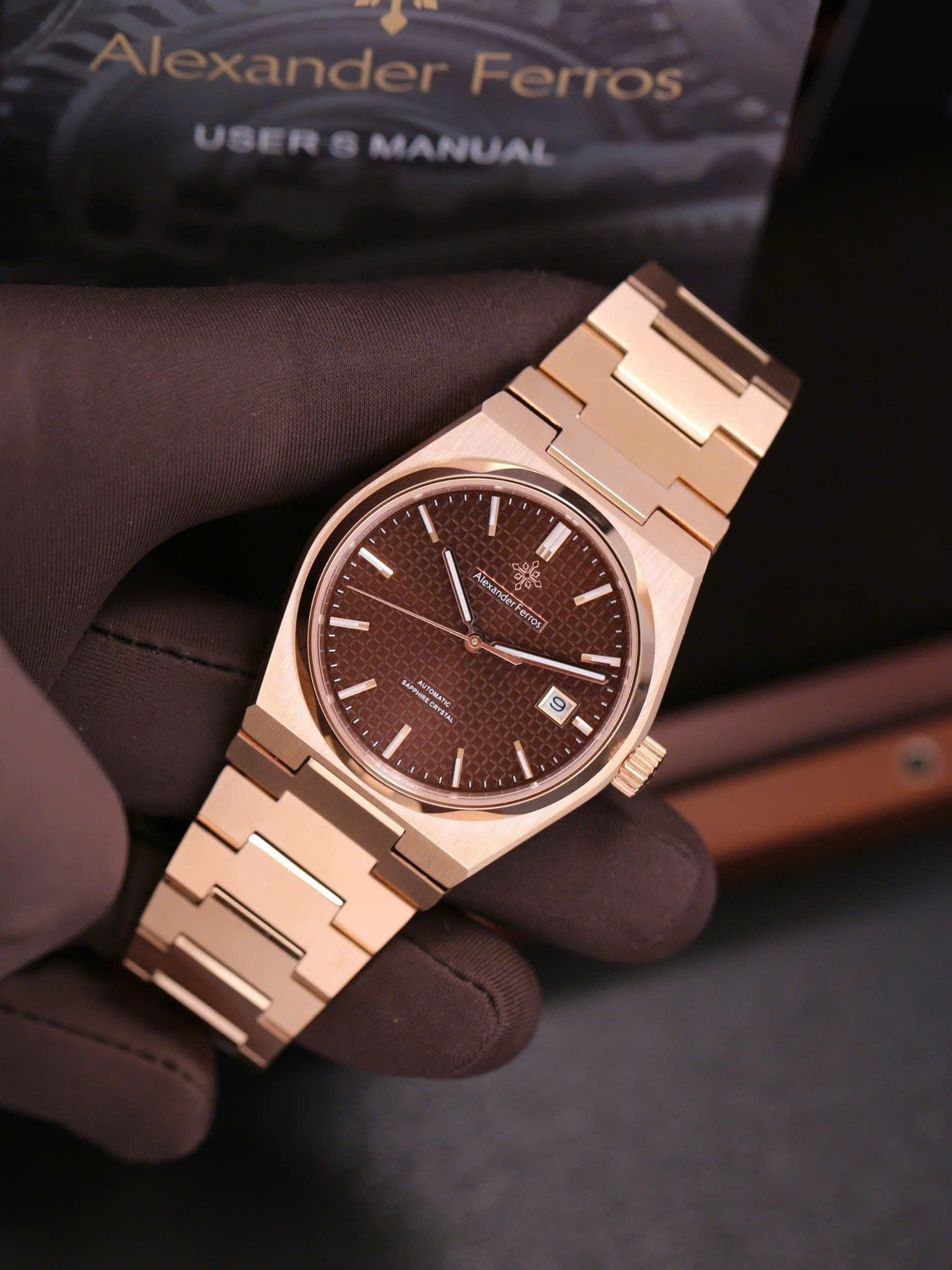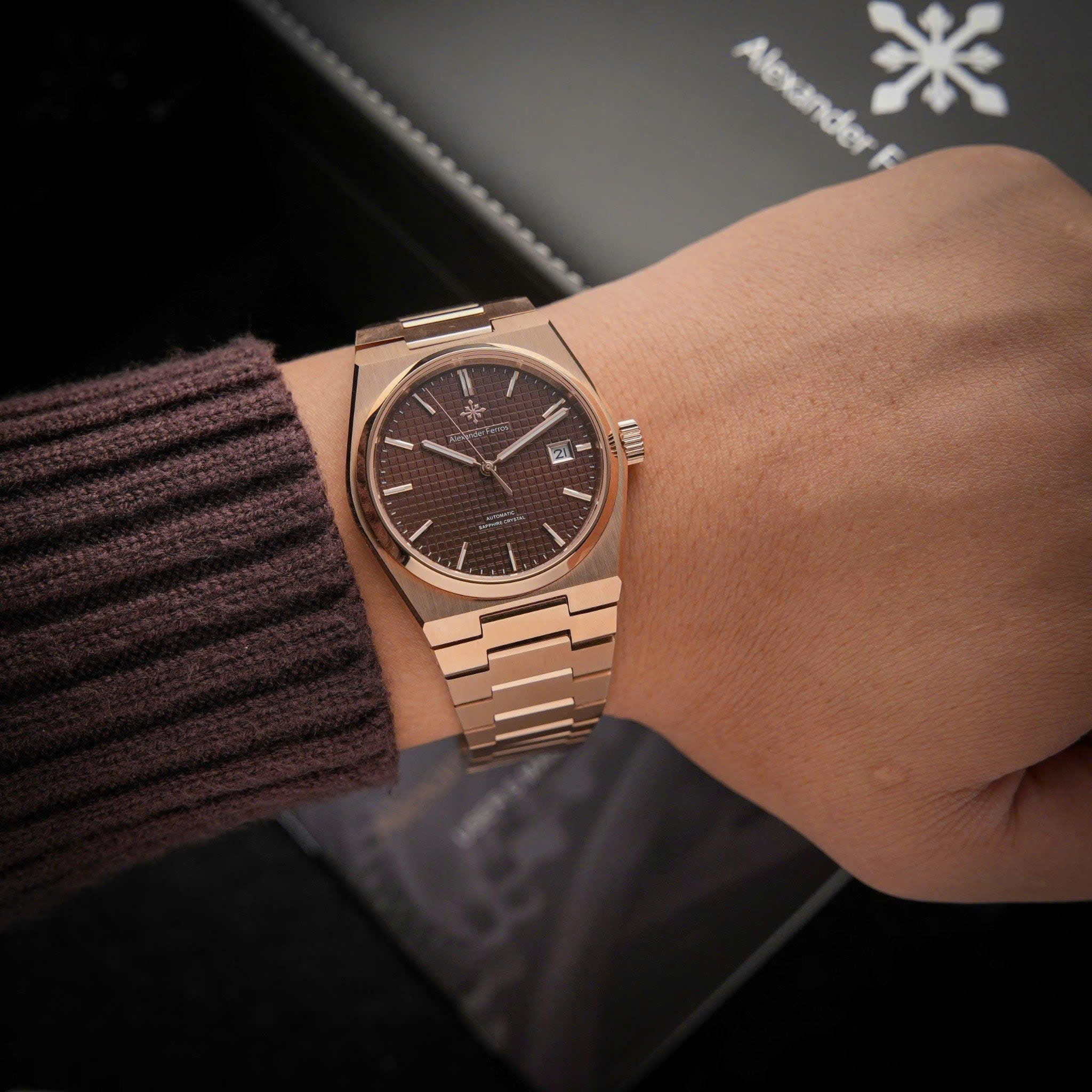 Alexander Ferros 5052R08 gây ấn tượng với tông màu nâu trầm kết hợp dây và viền vàng hồng rosegold sang trọng. Thiết kế mặt số 38mm gọn gàng mang lại cảm giác tinh tế, phù hợp với cổ tay nam giới yêu phong cách lịch lãm. Vỏ và dây thép không gỉ được hoàn thiện tỉ mỉ, kết hợp mặt kính sapphire trong suốt giúp đồng hồ luôn giữ được vẻ sáng đẹp và bền bỉ theo thời gian.