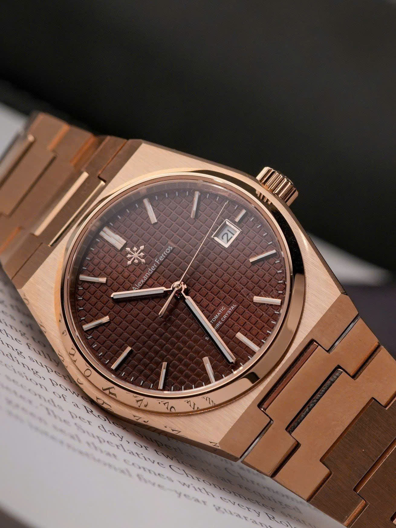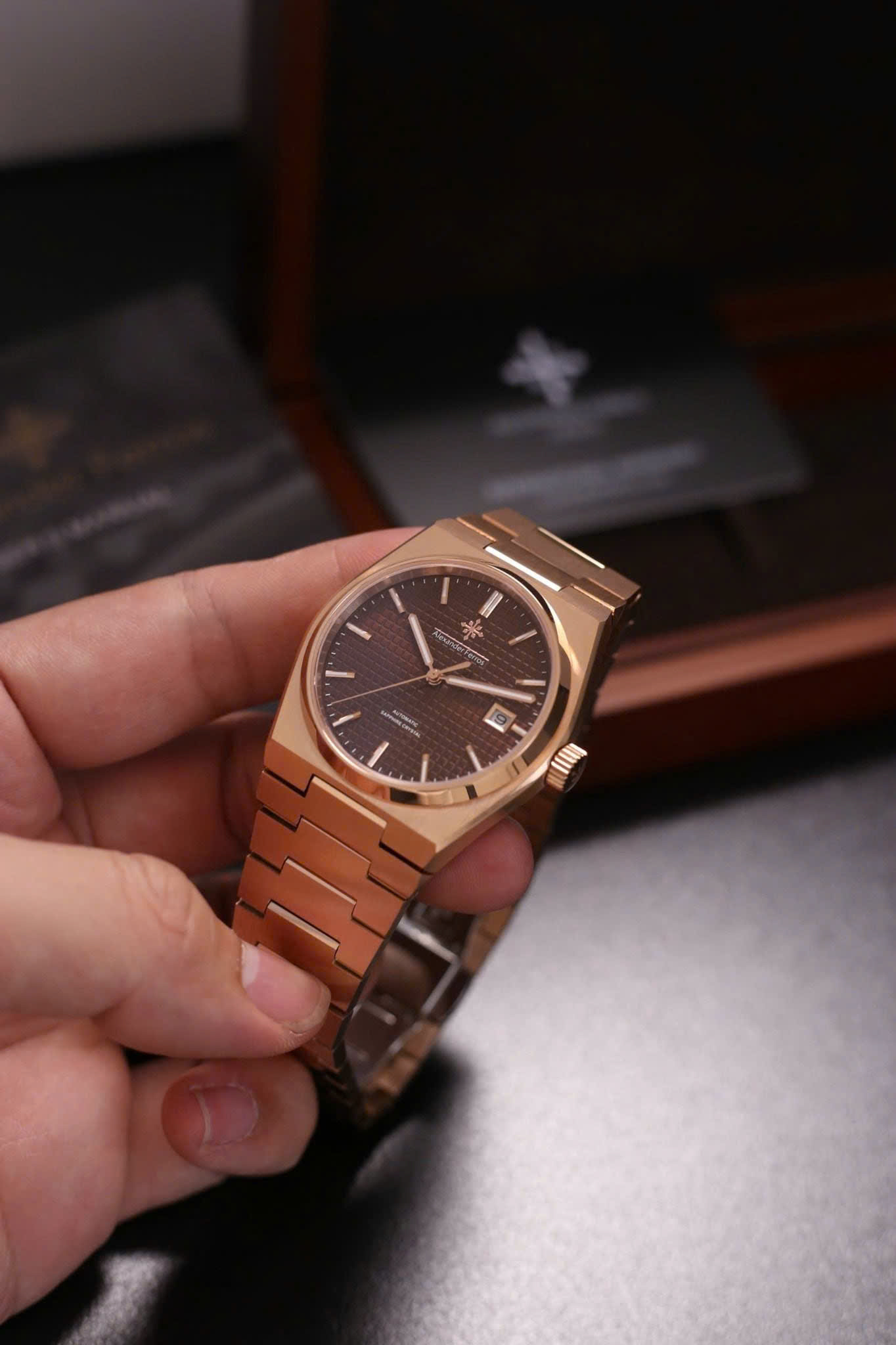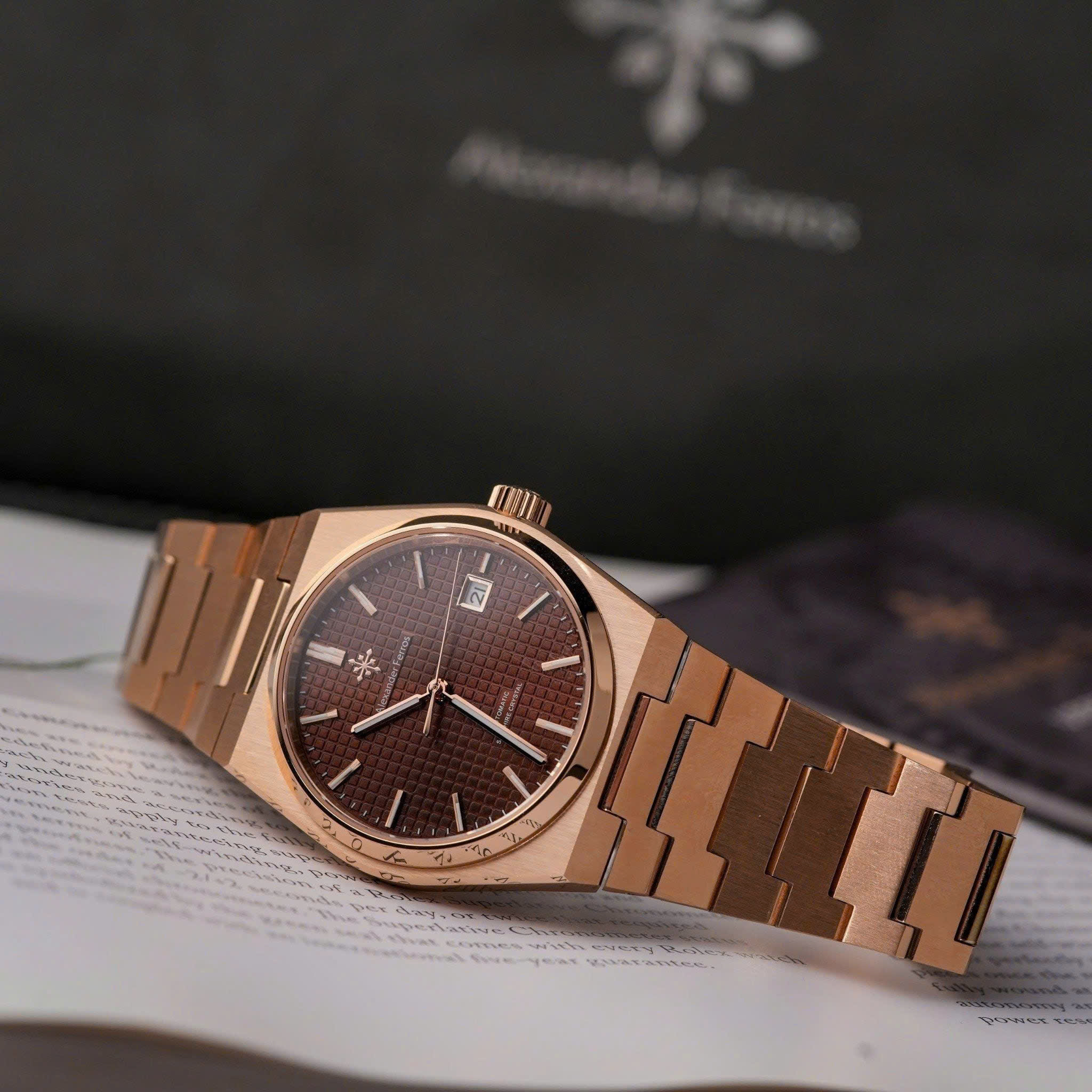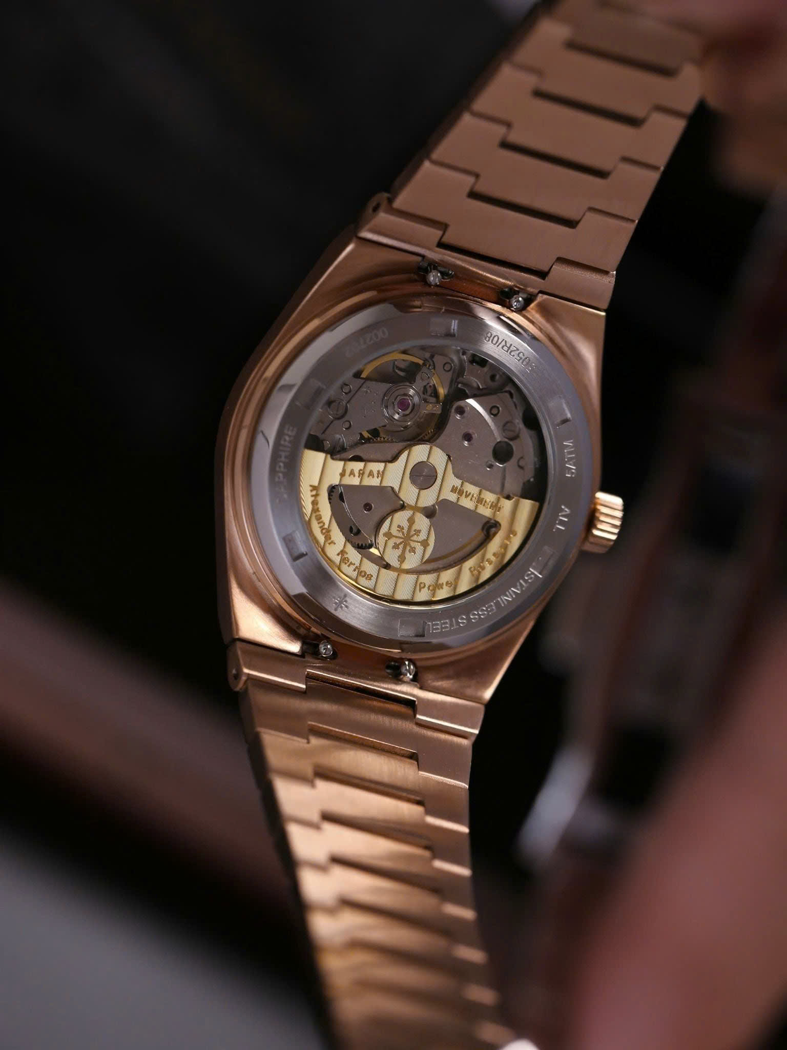 Alexander Ferros 5052R08 gây ấn tượng với tông màu nâu trầm kết hợp dây và viền vàng hồng rosegold sang trọng. Thiết kế mặt số 38mm gọn gàng mang lại cảm giác tinh tế, phù hợp với cổ tay nam giới yêu phong cách lịch lãm. Vỏ và dây thép không gỉ được hoàn thiện tỉ mỉ, kết hợp mặt kính sapphire trong suốt giúp đồng hồ luôn giữ được vẻ sáng đẹp và bền bỉ theo thời gian.