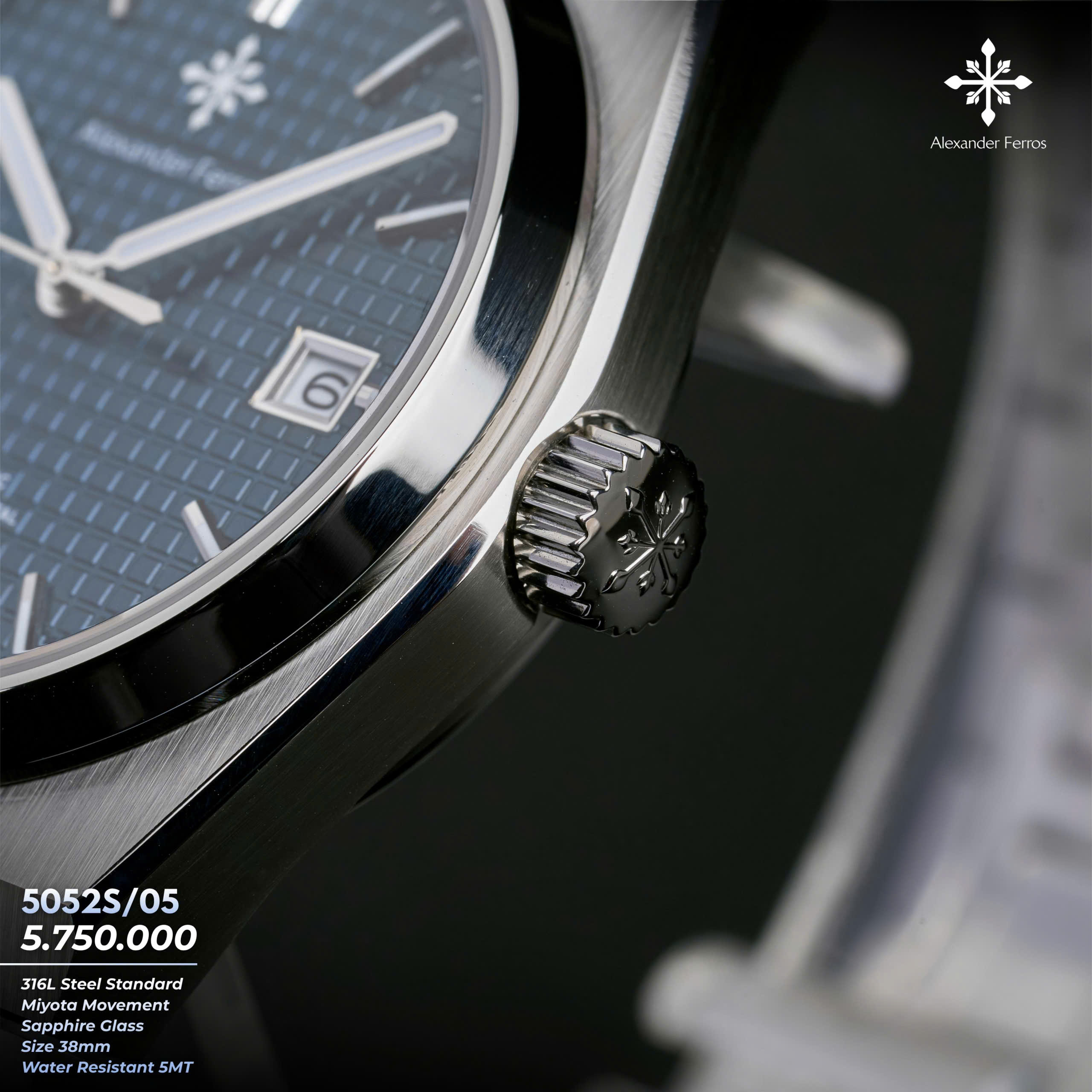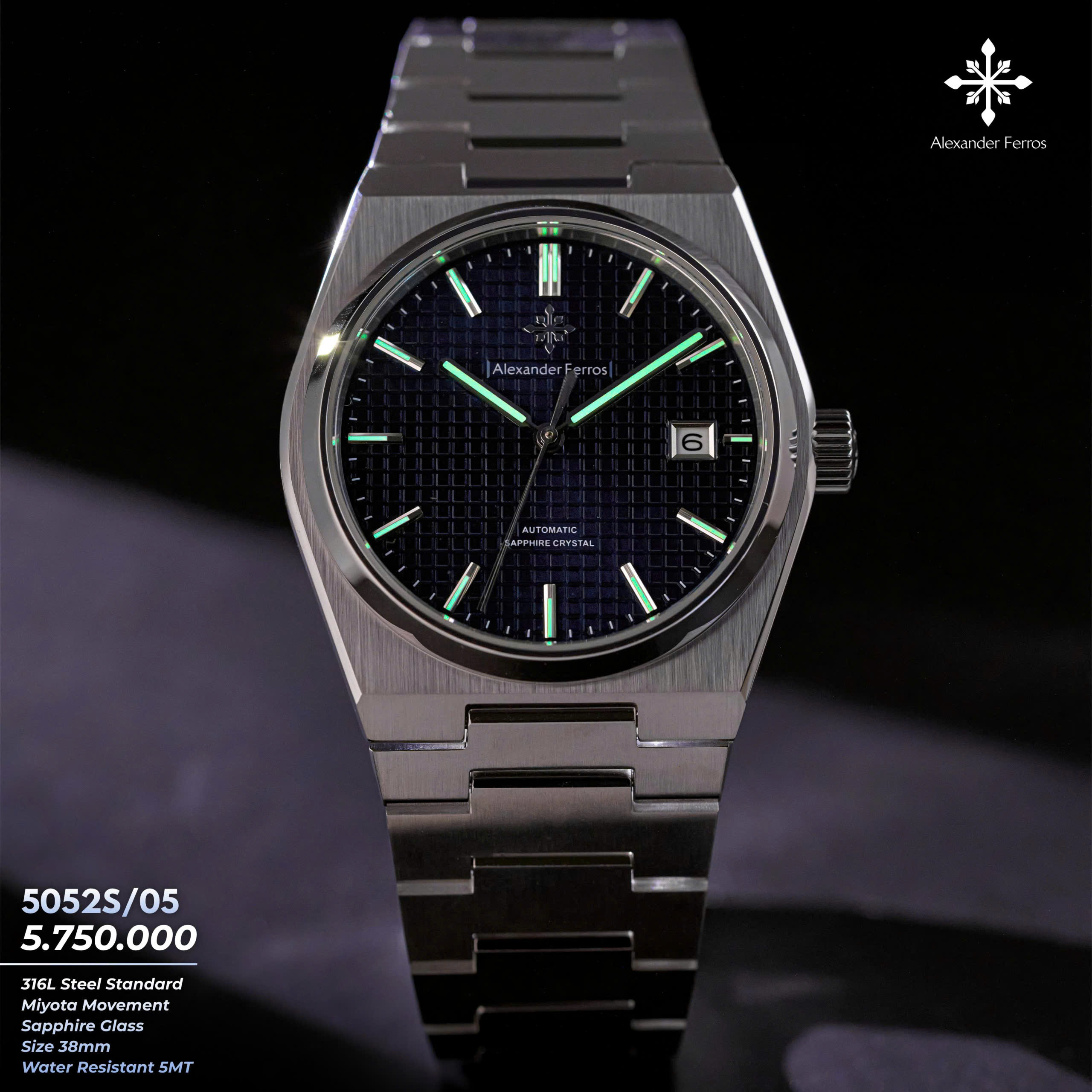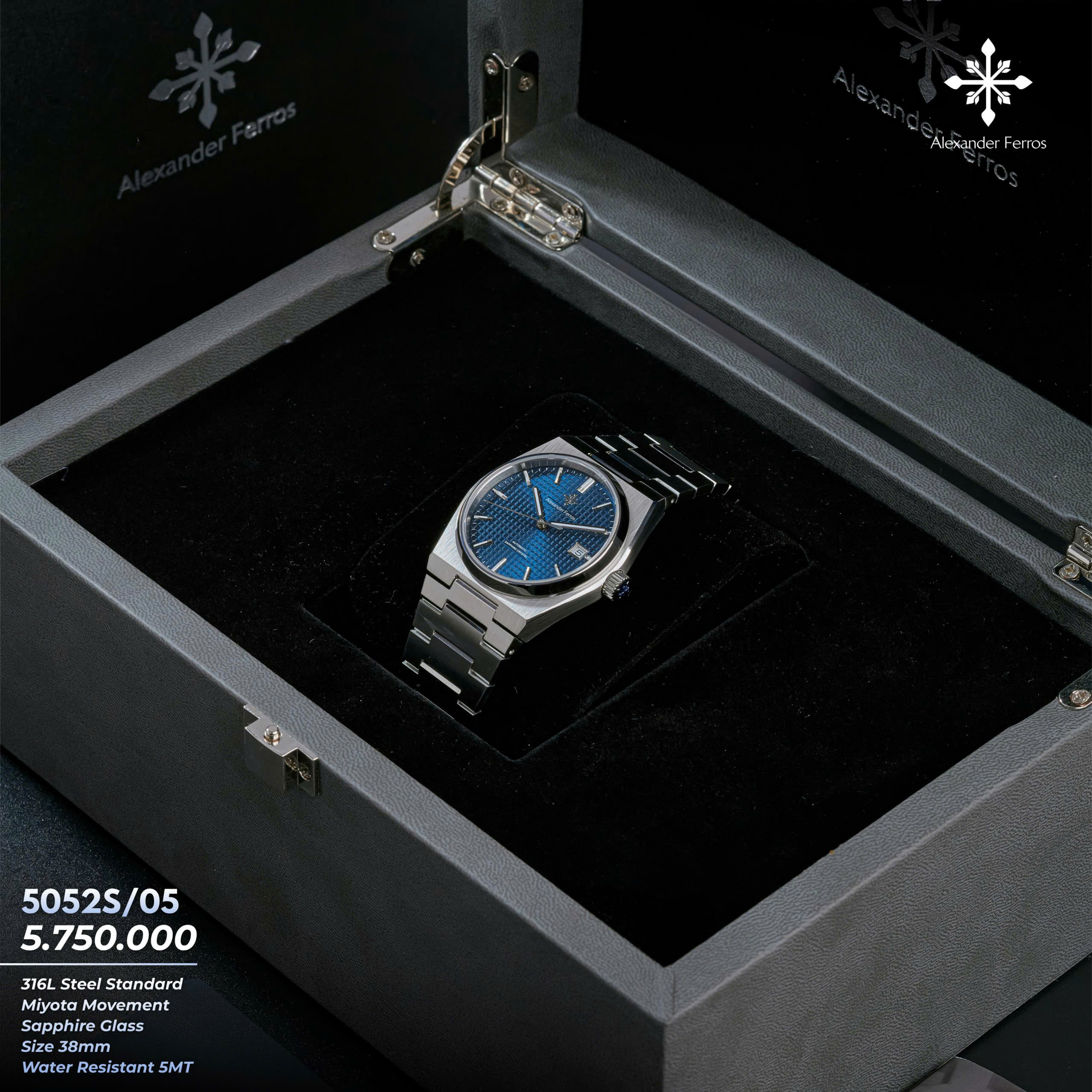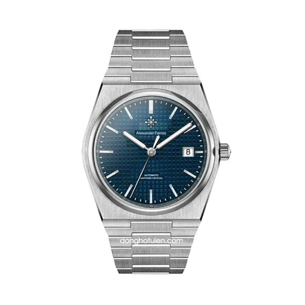 Alexander Ferros 5052S05 mang vẻ đẹp thanh lịch và hiện đại với mặt số xanh nổi bật trên nền vỏ và dây thép không gỉ màu bạc inox. Thiết kế mặt 38mm gọn gàng, vừa vặn cổ tay, phù hợp với những quý ông yêu phong cách tinh giản nhưng vẫn cuốn hút. Mặt kính sapphire trong suốt giúp tôn lên màu xanh sâu của mặt số, đồng thời mang lại cảm giác sang trọng và bền bỉ theo thời gian.