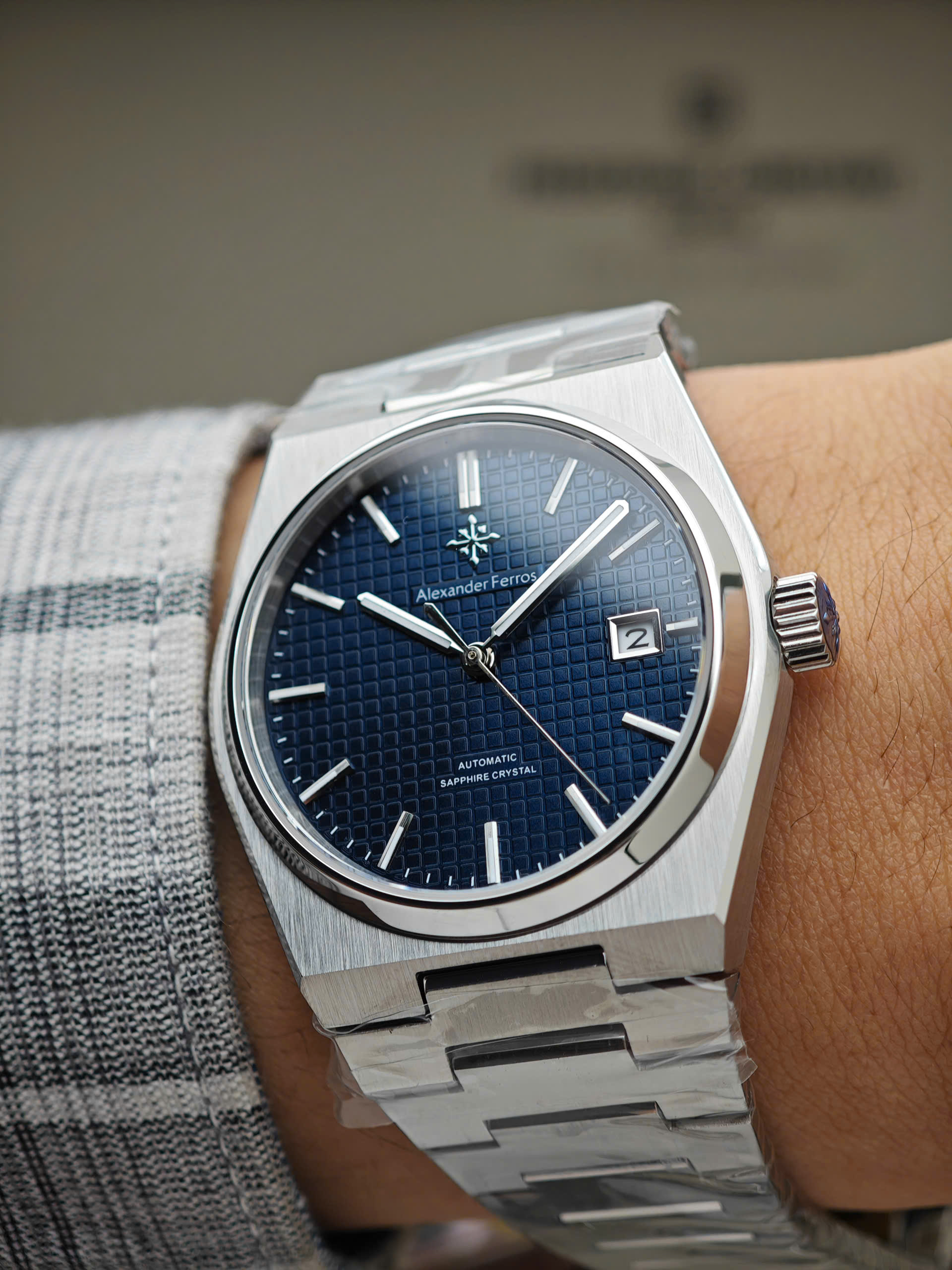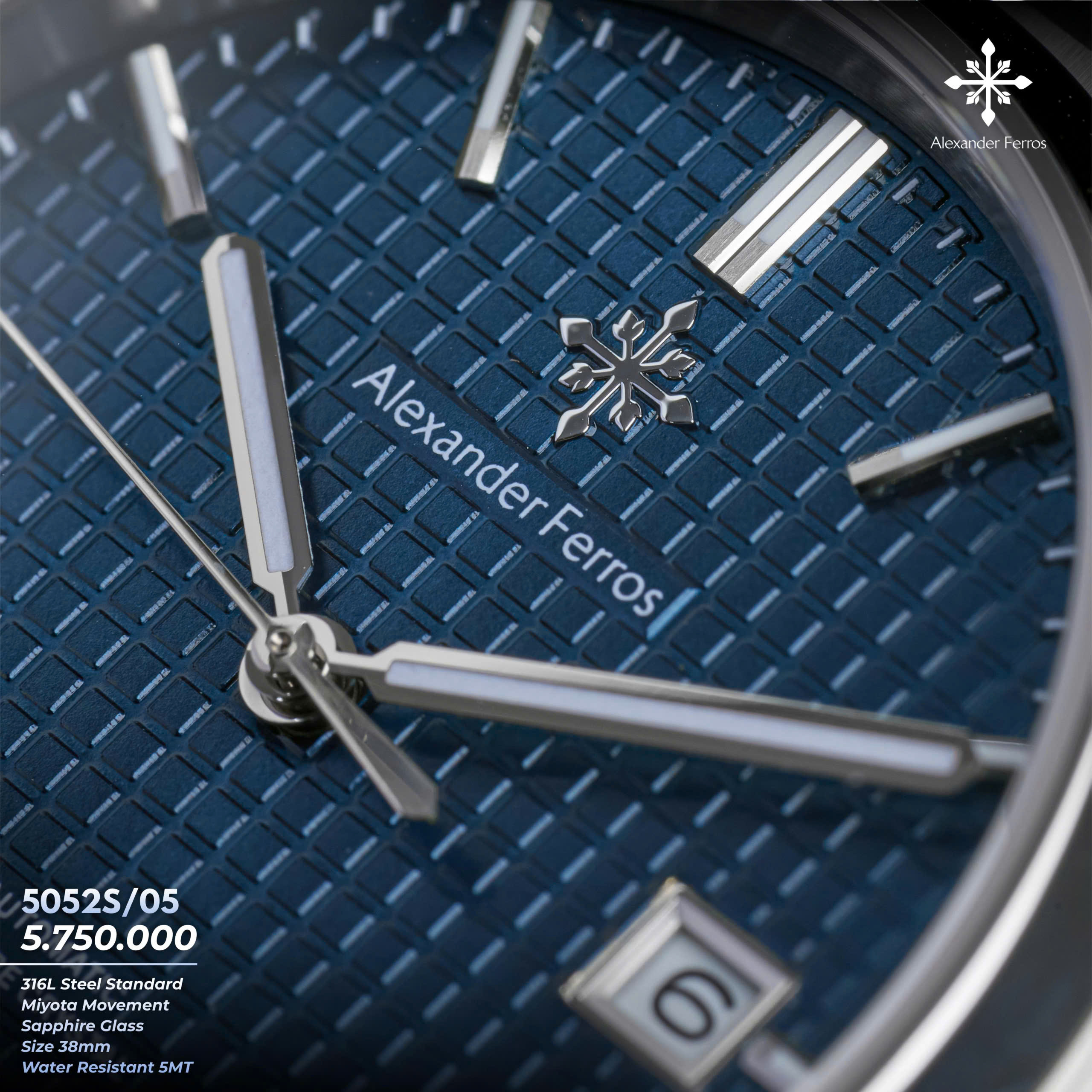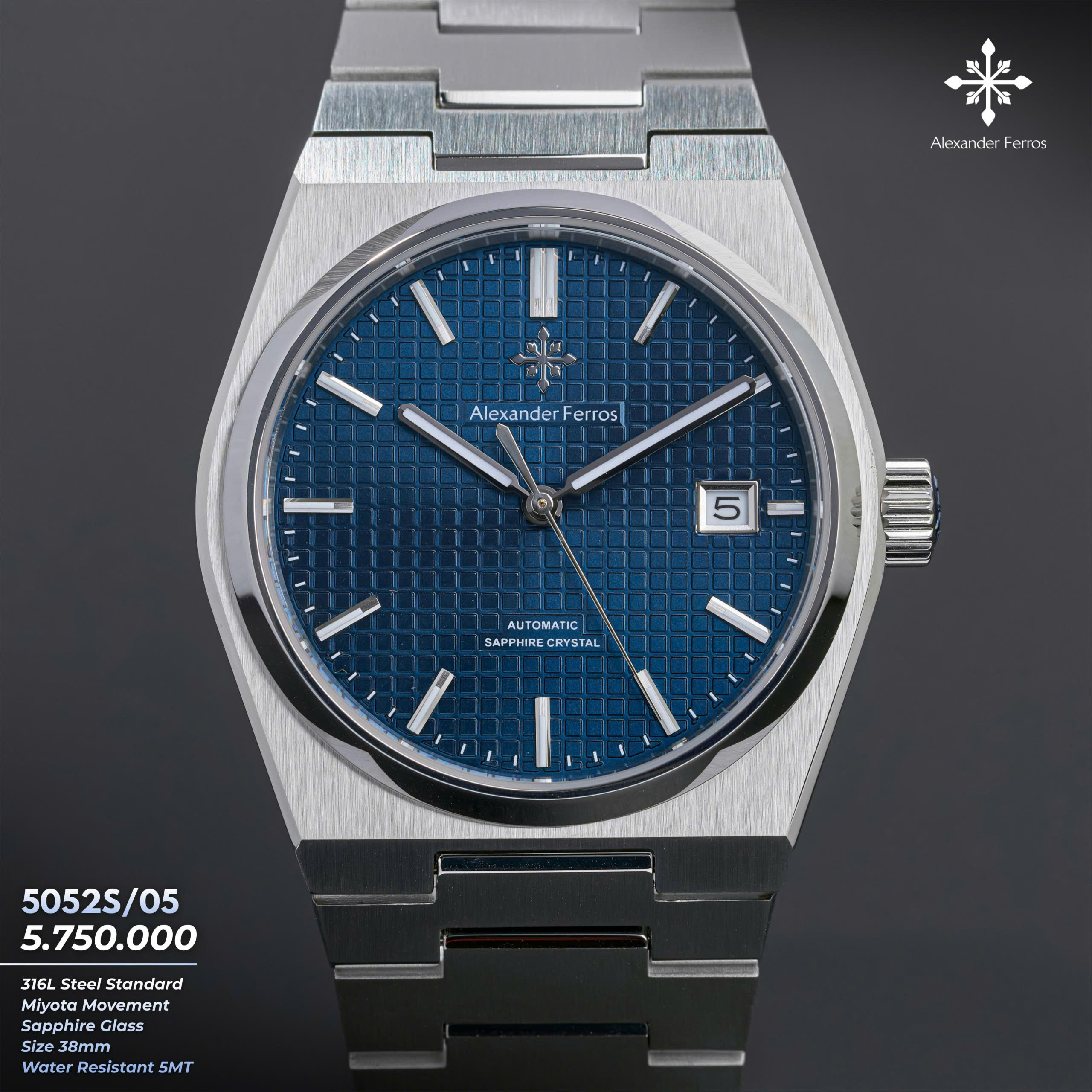 Alexander Ferros 5052S05 mang vẻ đẹp thanh lịch và hiện đại với mặt số xanh nổi bật trên nền vỏ và dây thép không gỉ màu bạc inox. Thiết kế mặt 38mm gọn gàng, vừa vặn cổ tay, phù hợp với những quý ông yêu phong cách tinh giản nhưng vẫn cuốn hút. Mặt kính sapphire trong suốt giúp tôn lên màu xanh sâu của mặt số, đồng thời mang lại cảm giác sang trọng và bền bỉ theo thời gian.