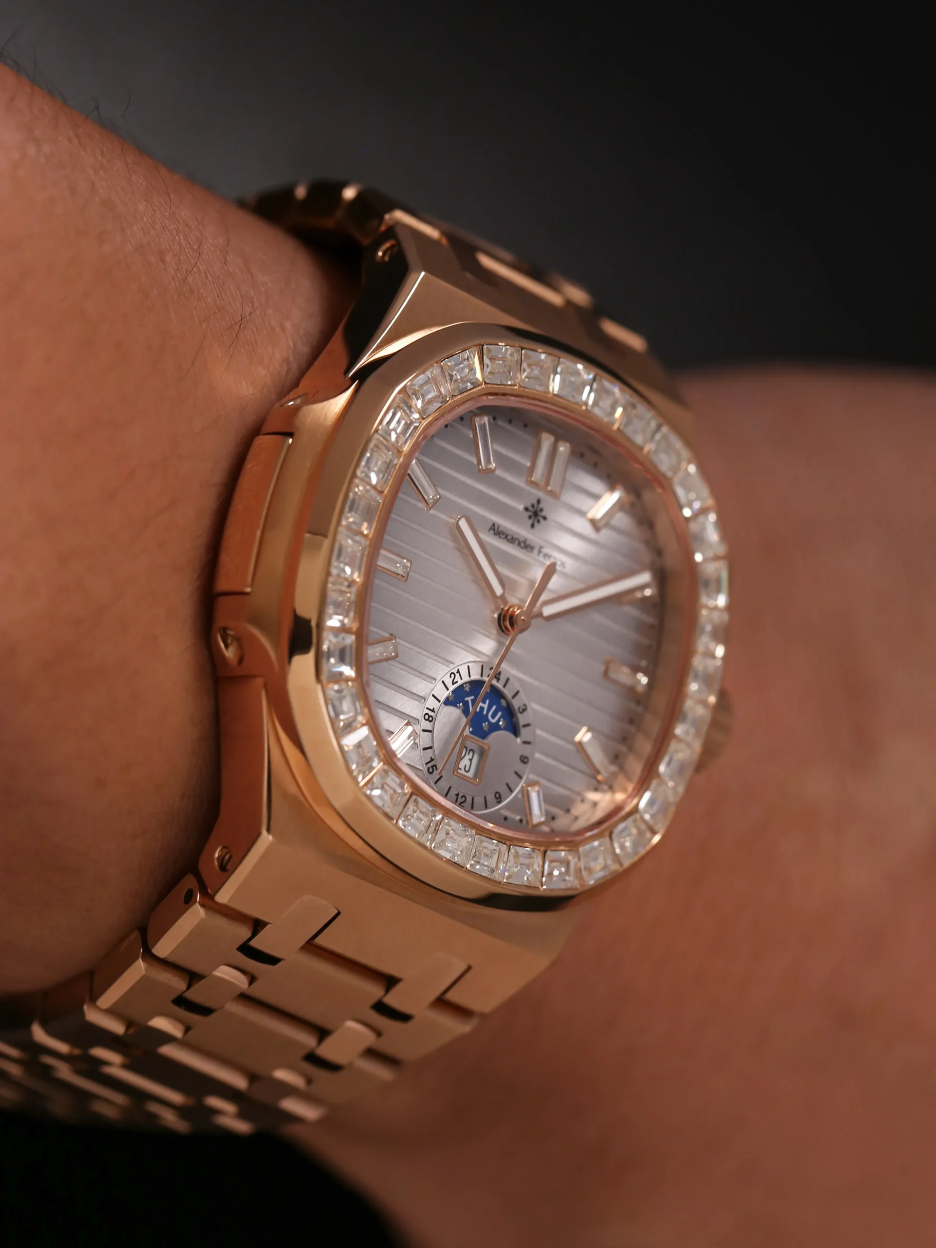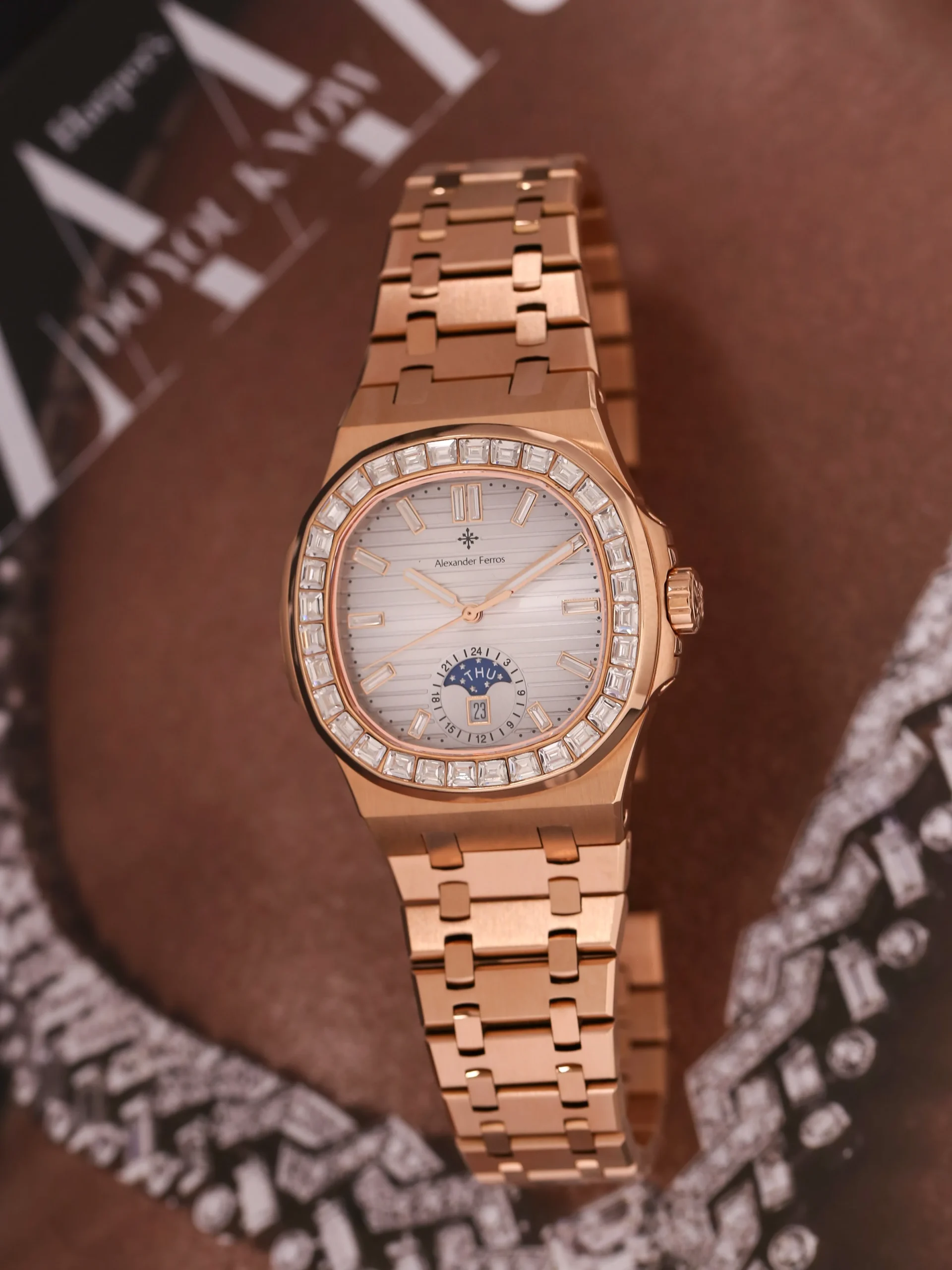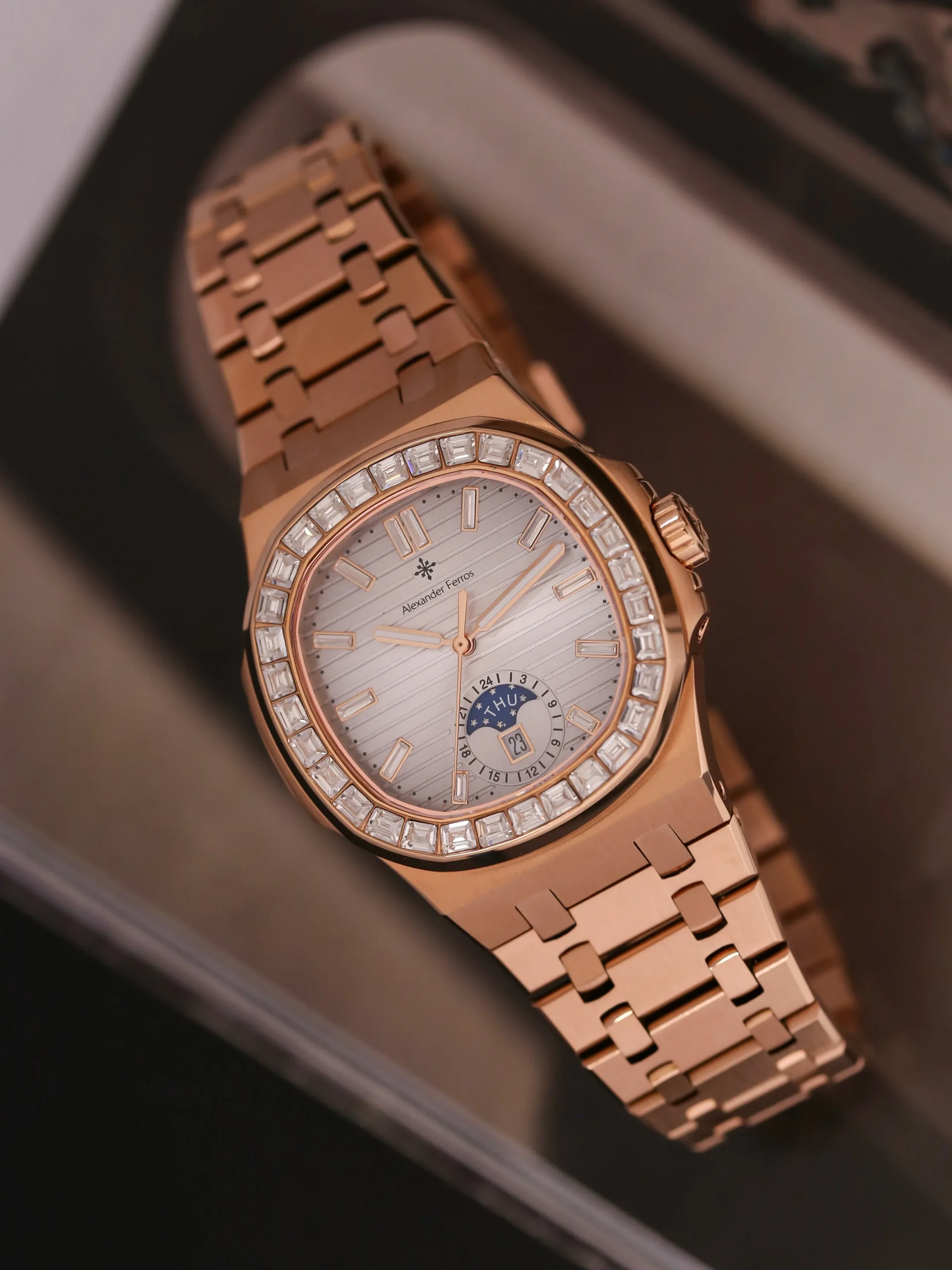 Sự kết hợp giữa mặt số trắng tinh tế và dây thép không gỉ màu vàng hồng tạo nên phong cách thanh lịch và sang trọng. Mặt kính sapphire cao cấp giúp hạn chế trầy xước hiệu quả, giữ cho đồng hồ luôn sáng đẹp trong quá trình sử dụng. Với thiết kế tinh tế cùng bộ máy automatic bền bỉ, Alexander Ferros 6111R/02 là lựa chọn phù hợp cho nam giới yêu thích đồng hồ cơ cao cấp.