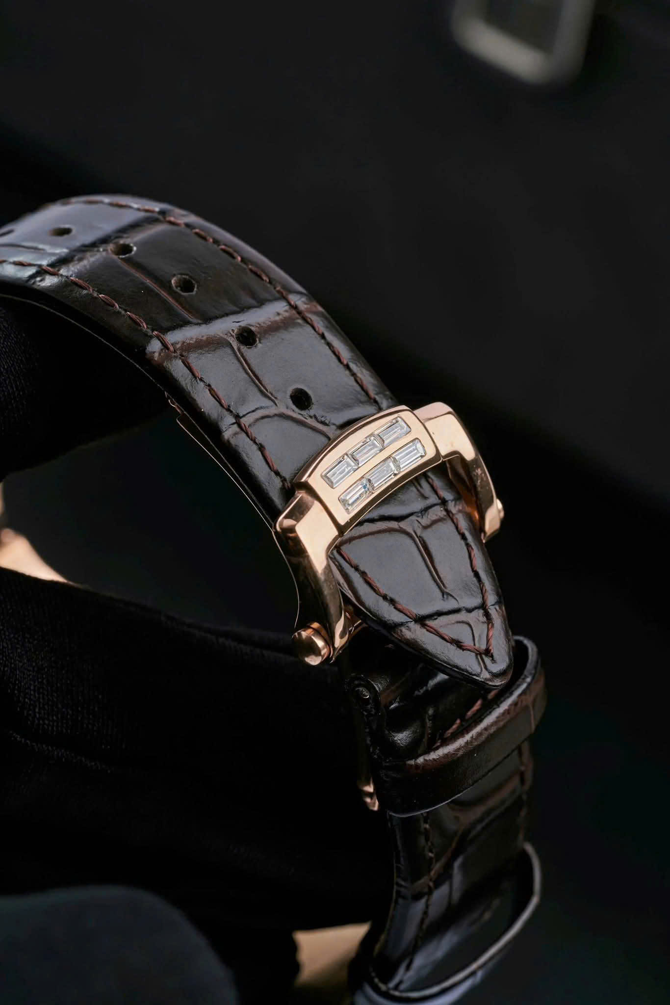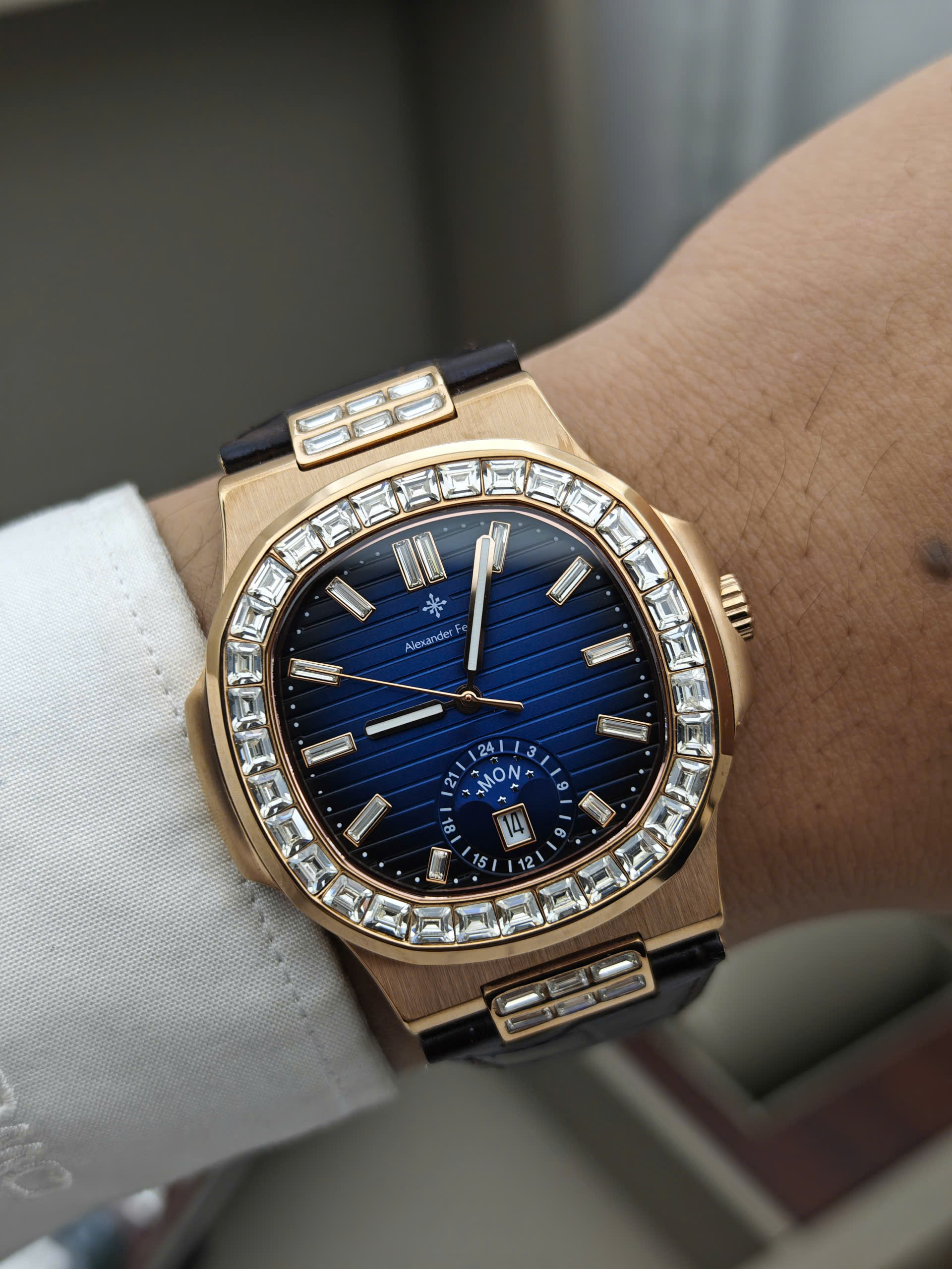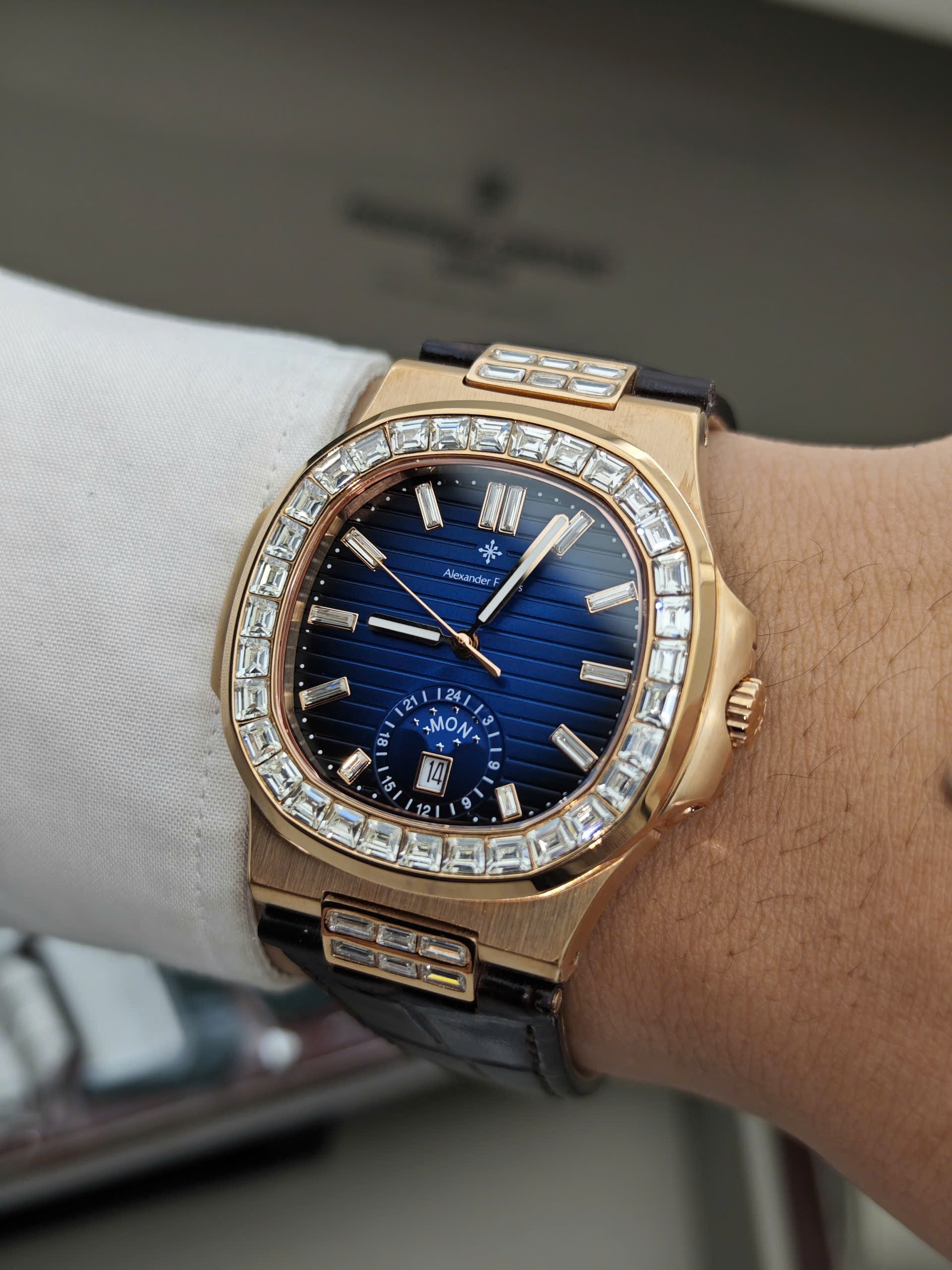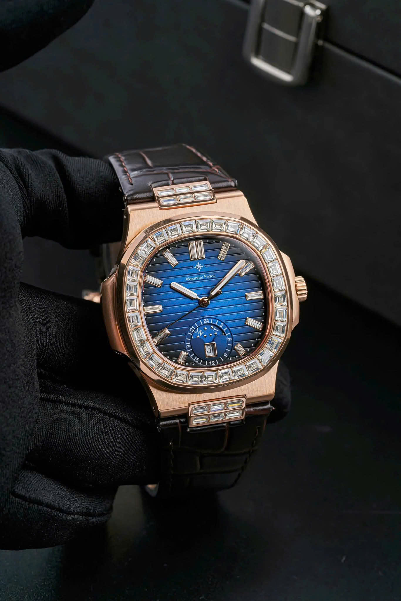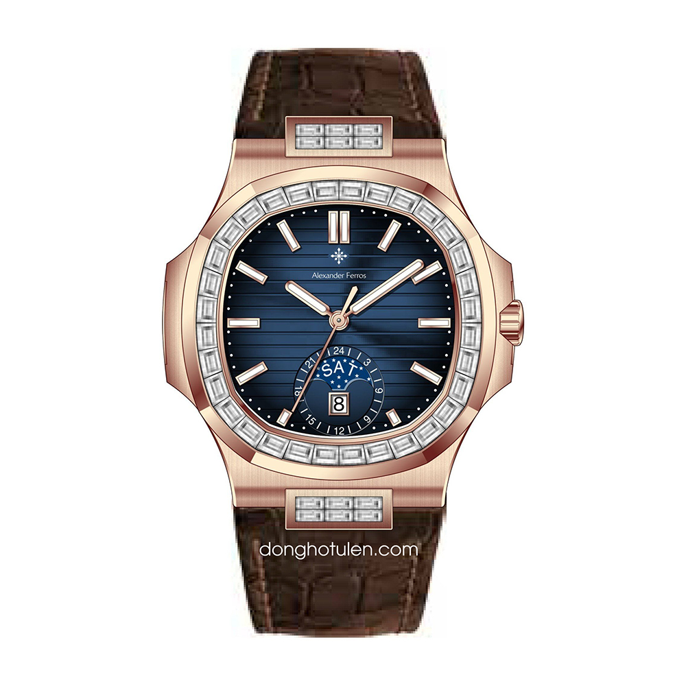 Alexander Ferros 6111R-05 là chiếc đồng hồ nam đẳng cấp với mặt xanh Blue nổi bật và viền vàng hồng rosegold đính đá lấp lánh, tạo điểm nhấn sang trọng trên cổ tay. Kết hợp dây da nâu cao cấp cùng vỏ thép không gỉ, đồng hồ mang vẻ thanh lịch, tinh tế, phù hợp cho những quý ông yêu phong cách lịch lãm. Mặt kính sapphire chống trầy xước giúp giữ vẻ đẹp lâu dài, đồng thời làm nổi bật từng chi tiết tinh xảo trên mặt số.