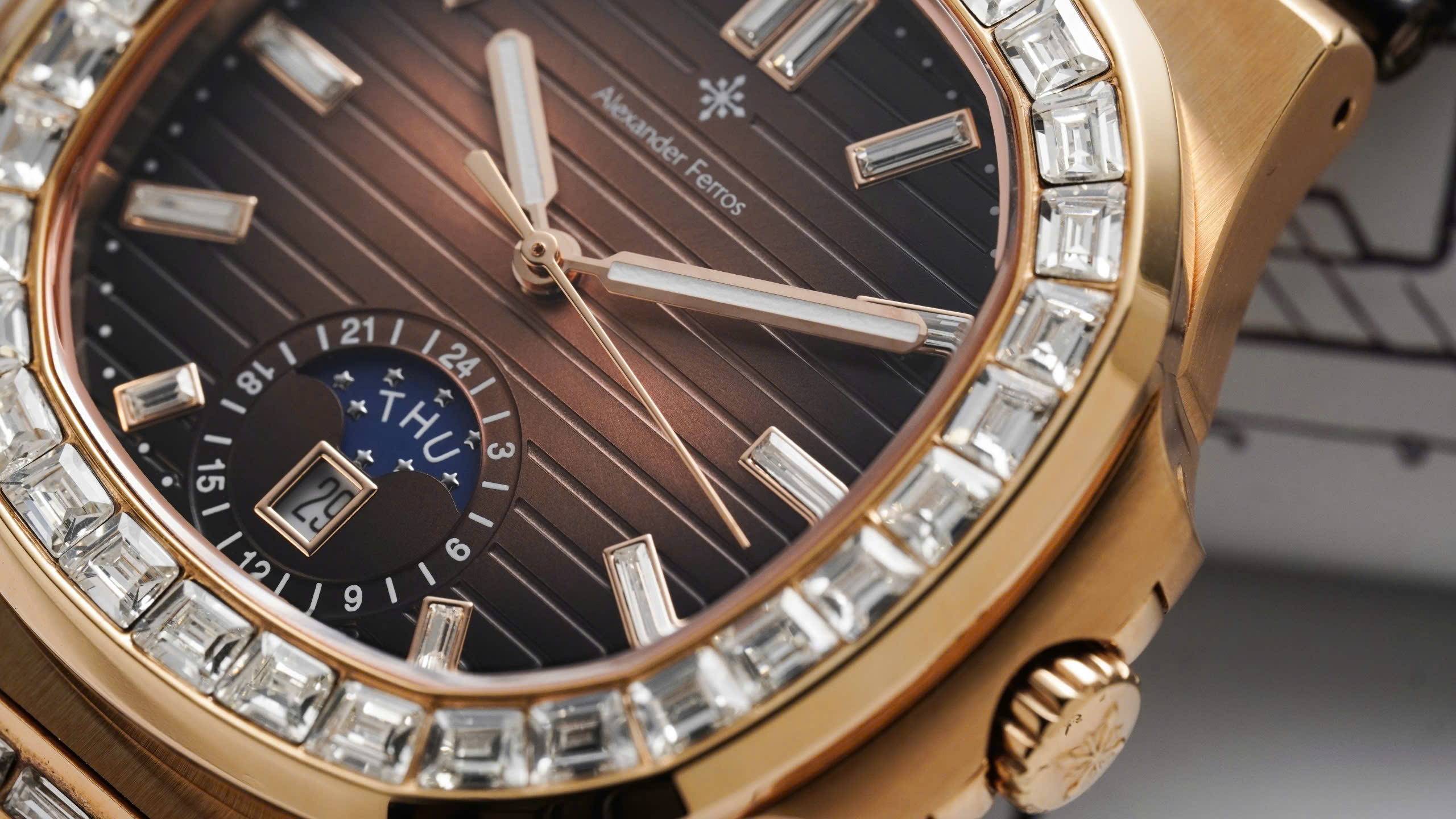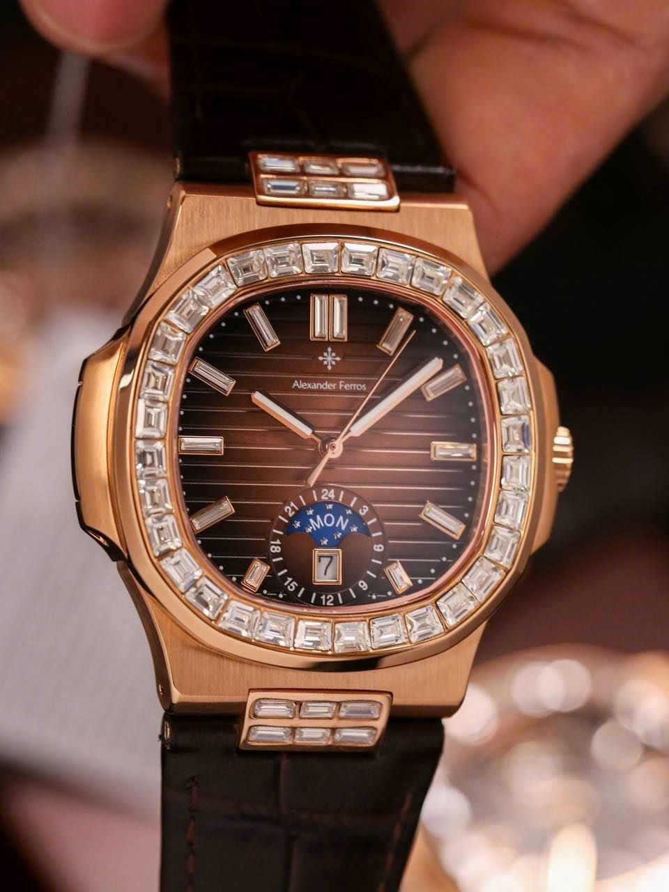 Mẫu Alexander Ferros 6111R-08 sử dụng bộ máy cơ tự động xuất xứ Nhật Bản, vận hành bền bỉ, chính xác. Chức năng giờ, phút, giây và lịch ngày được bố trí trực quan, dễ quan sát. Dây da nâu mềm mại kết hợp viền đính đá vừa nổi bật vừa tiện dụng, phù hợp cho cả công việc lẫn các sự kiện thường ngày. Khả năng chịu nước 5ATM giúp đồng hồ an toàn trong các hoạt động hằng ngày như rửa tay hay đi mưa nhẹ.