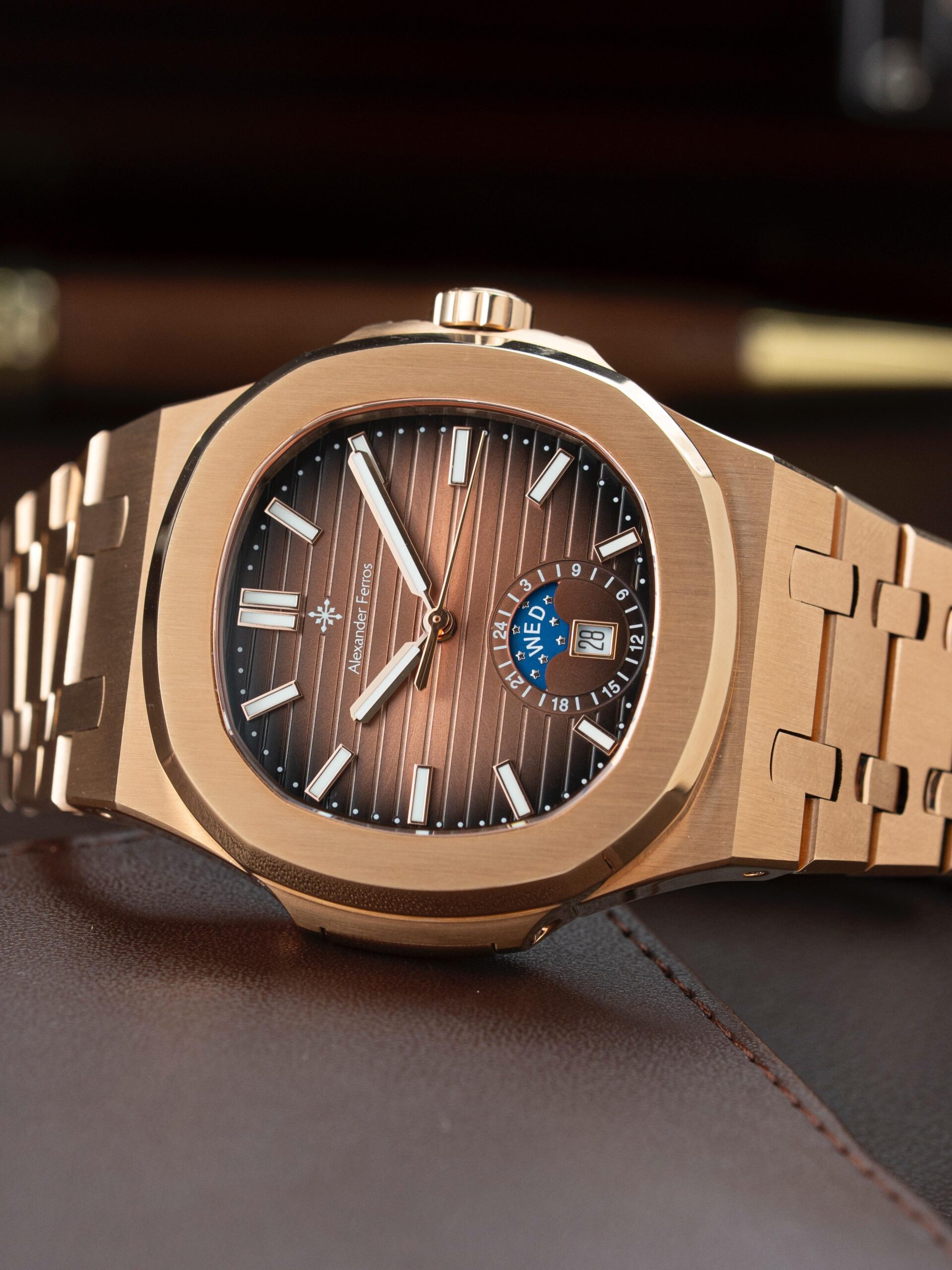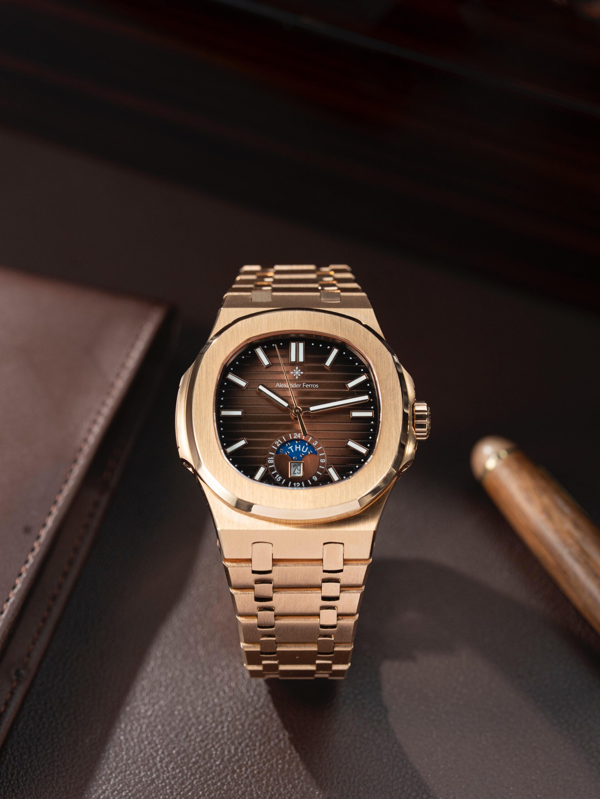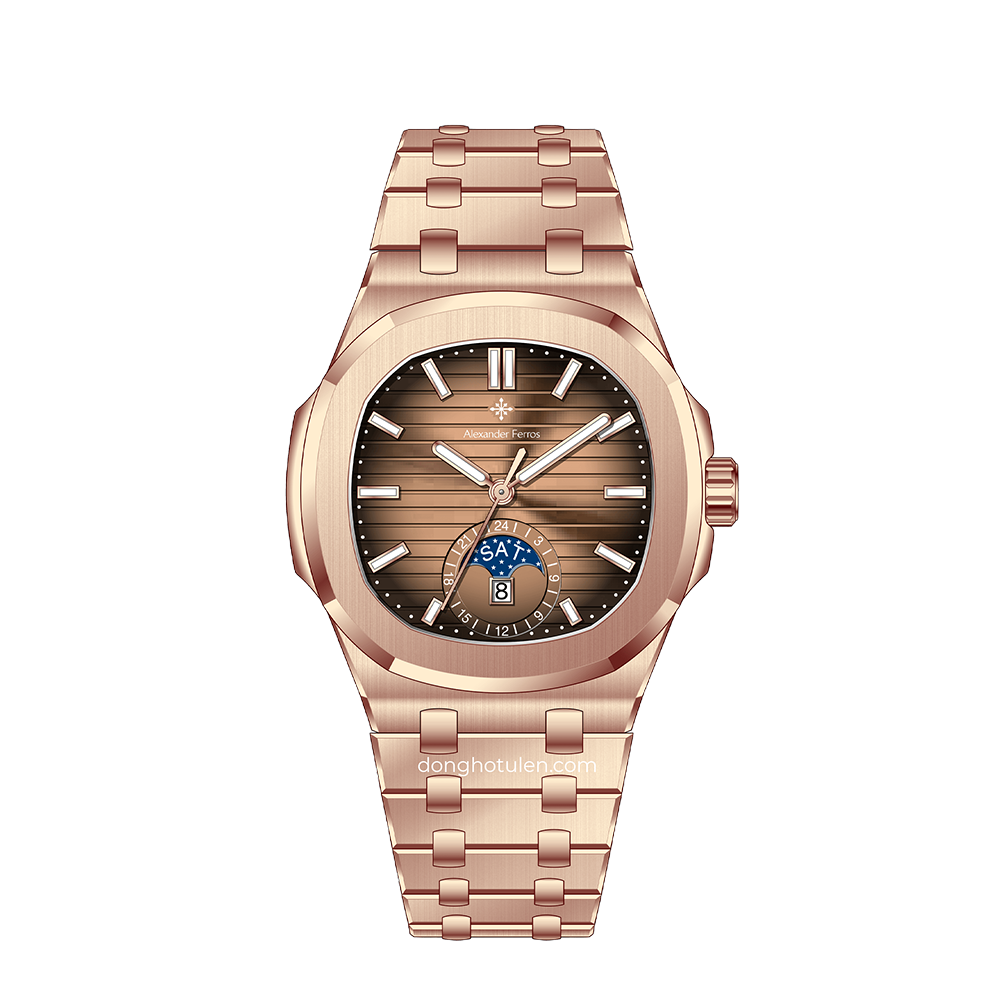 Sự kết hợp giữa mặt số nâu thanh lịch và dây thép không gỉ màu vàng hồng tạo nên phong cách hiện đại và sang trọng. Mặt kính sapphire cao cấp giúp hạn chế trầy xước hiệu quả, giữ cho đồng hồ luôn sáng đẹp trong quá trình sử dụng. Với thiết kế tinh tế cùng bộ máy automatic bền bỉ, Alexander Ferros 6122R/08 là lựa chọn phù hợp cho nam giới yêu thích đồng hồ cơ đẳng cấp.