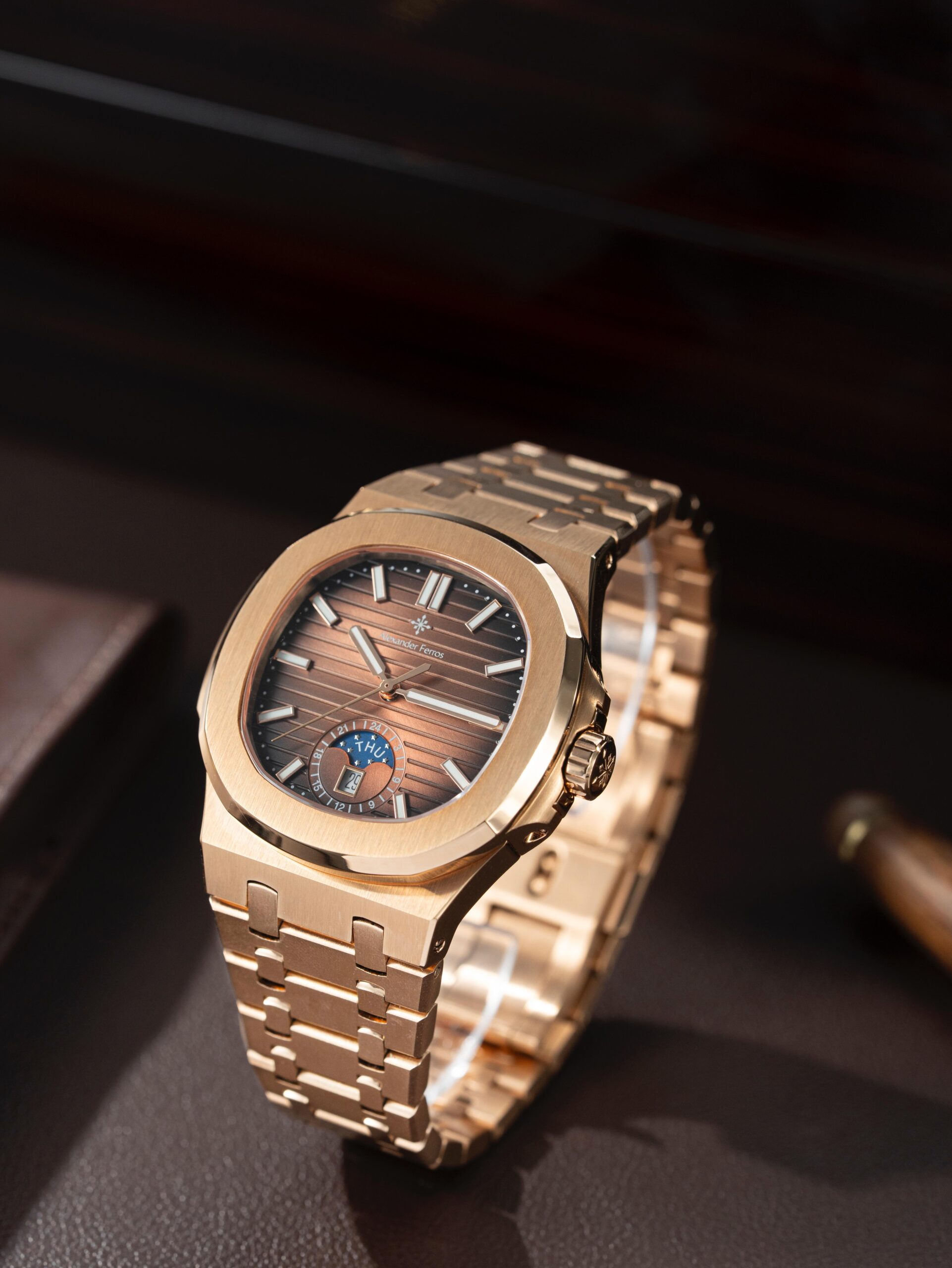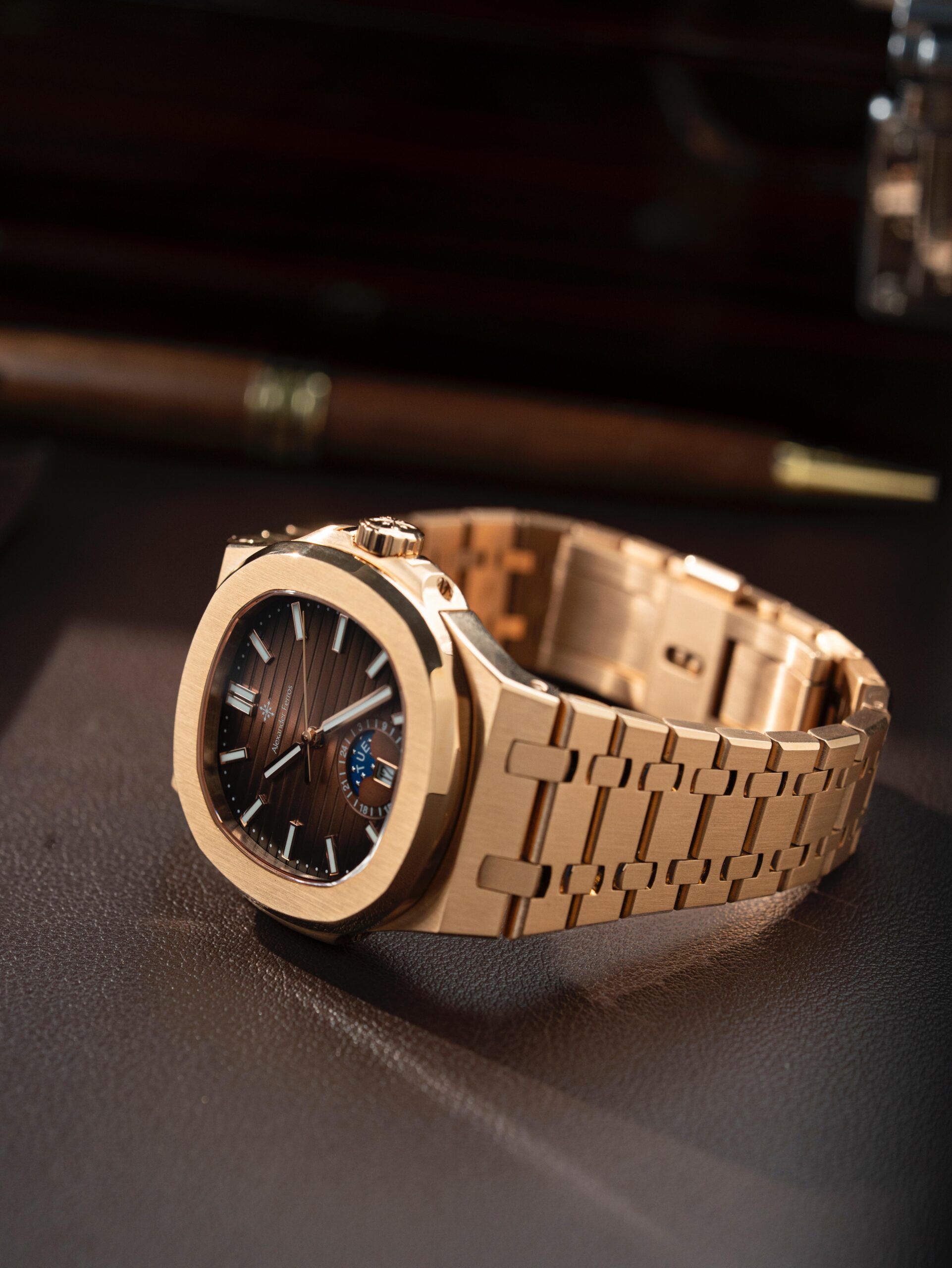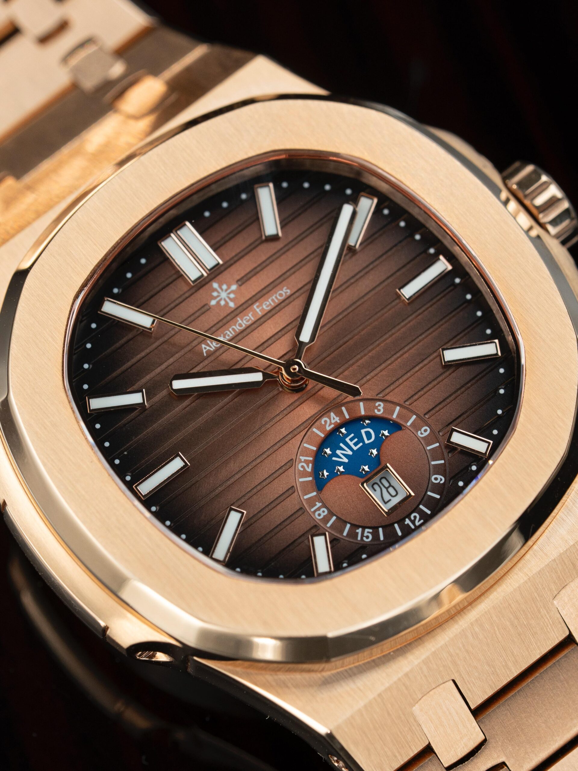 Sự kết hợp giữa mặt số nâu thanh lịch và dây thép không gỉ màu vàng hồng tạo nên phong cách hiện đại và sang trọng. Mặt kính sapphire cao cấp giúp hạn chế trầy xước hiệu quả, giữ cho đồng hồ luôn sáng đẹp trong quá trình sử dụng. Với thiết kế tinh tế cùng bộ máy automatic bền bỉ, Alexander Ferros 6122R/08 là lựa chọn phù hợp cho nam giới yêu thích đồng hồ cơ đẳng cấp.