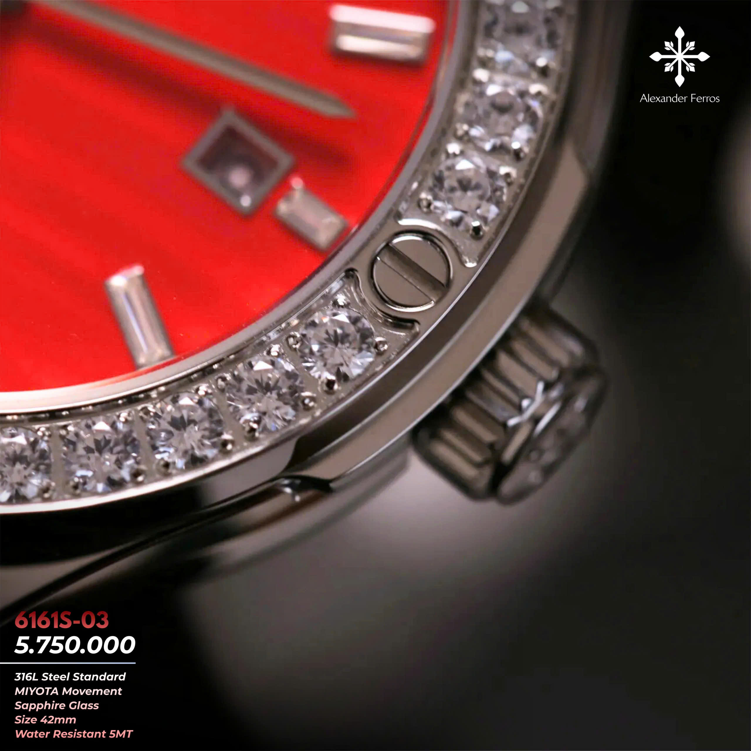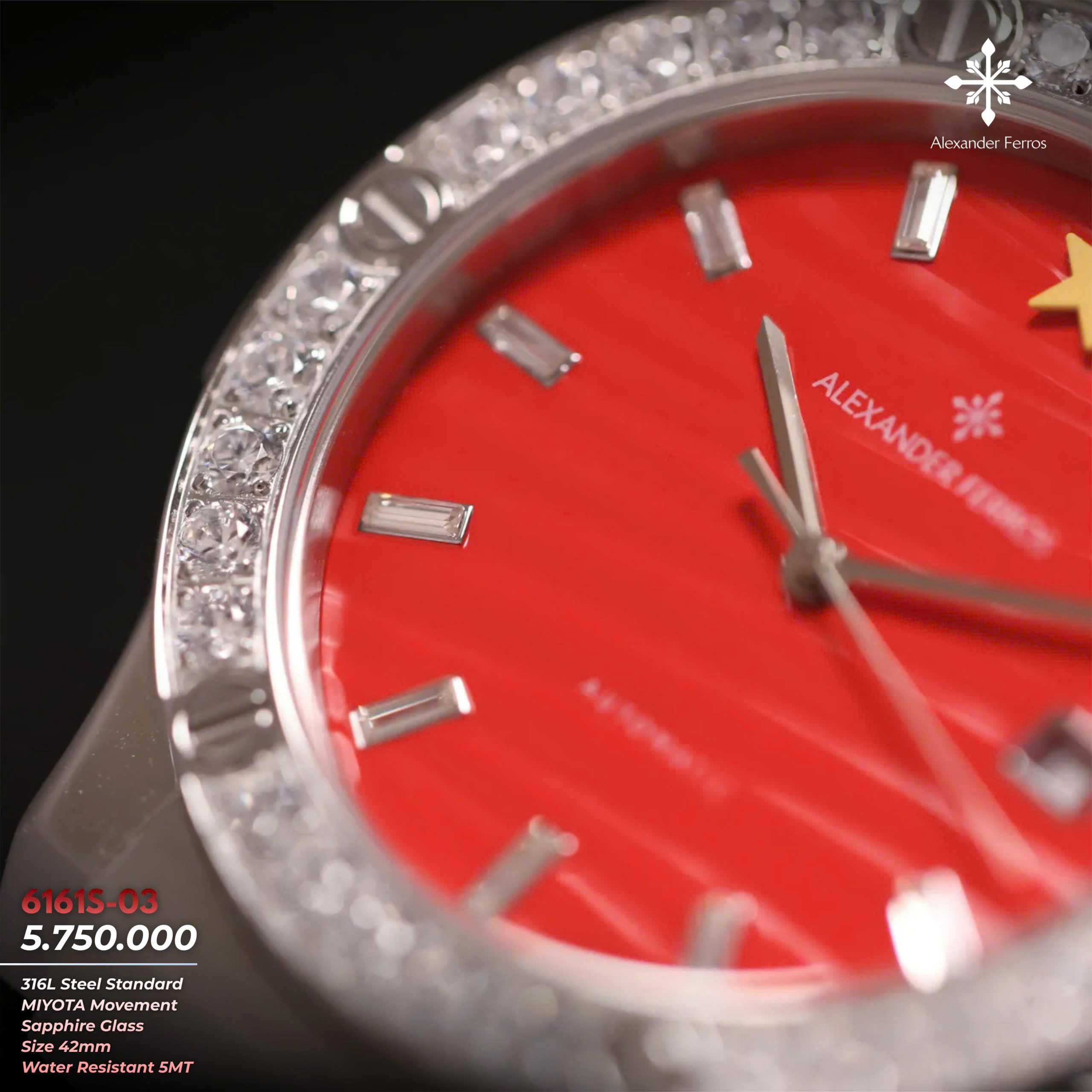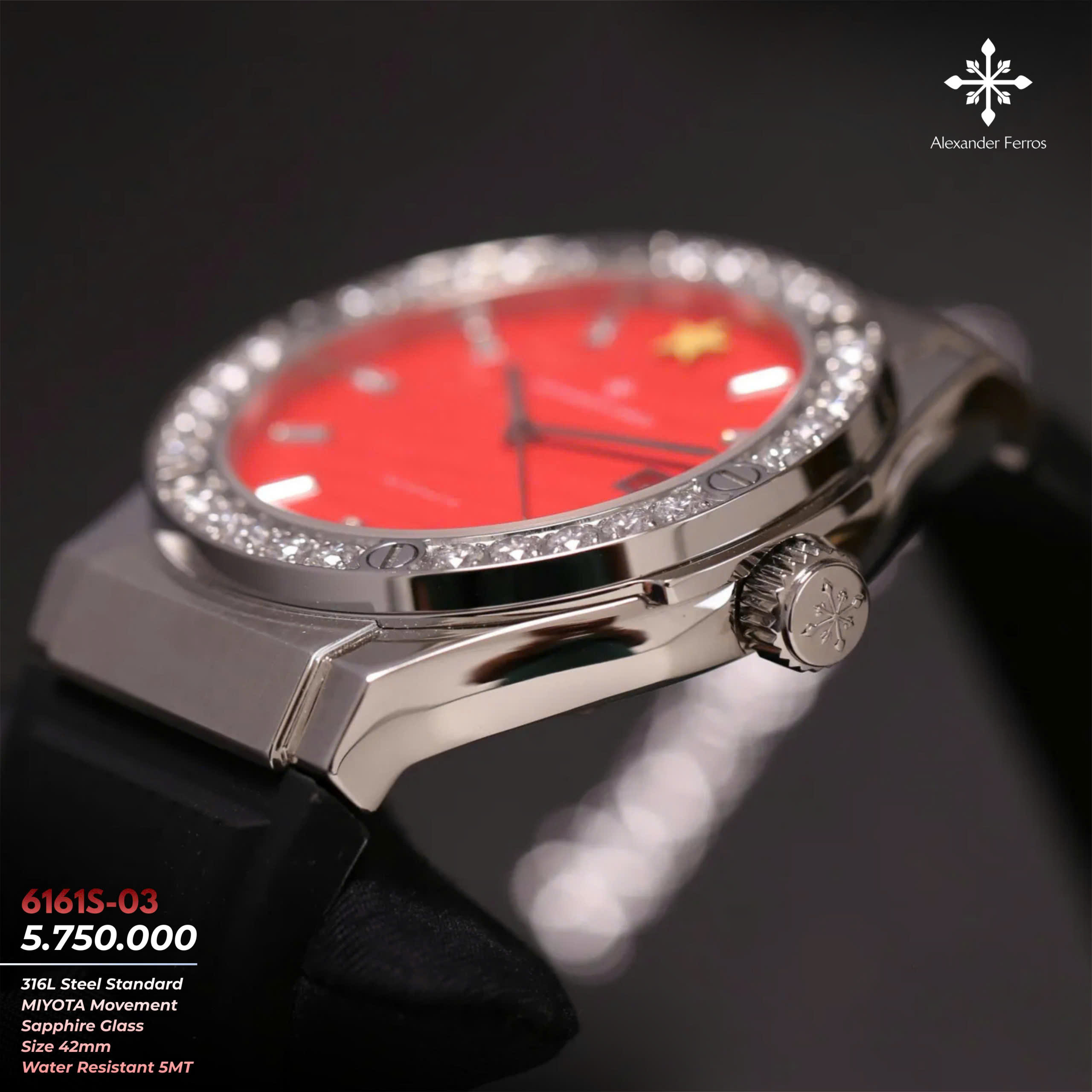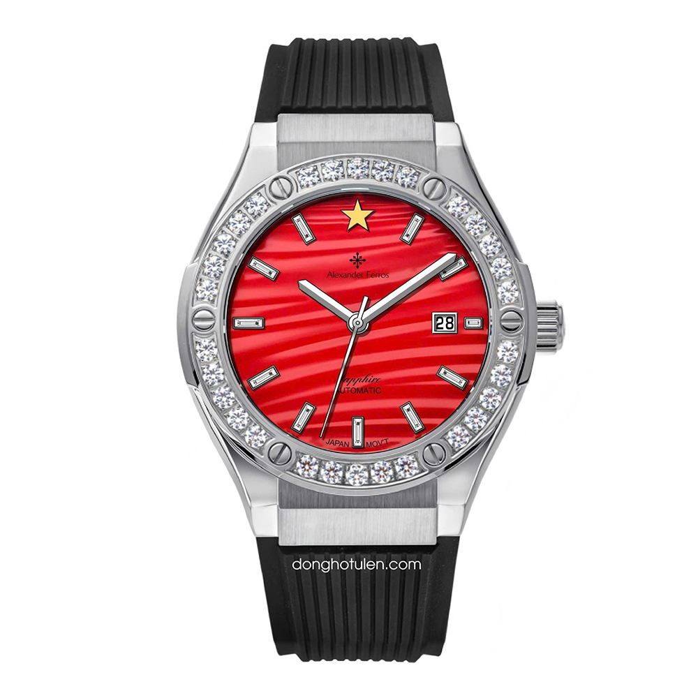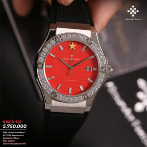 Alexander Ferros 6161S-03 gây ấn tượng mạnh với mặt số đỏ rực, lấy cảm hứng từ lá cờ Việt Nam – biểu tượng của tinh thần và bản lĩnh. Thiết kế mặt 42mm kết hợp viền thép không gỉ màu bạc tạo nên vẻ ngoài mạnh mẽ, nam tính. Dây silicone đen mang lại cảm giác thể thao, linh hoạt, phù hợp với nhịp sống hiện đại. Đây không chỉ là chiếc đồng hồ cơ tự động, mà còn là tuyên ngôn phong cách dành cho những người đàn ông mang trong mình niềm tự hào dân tộc.