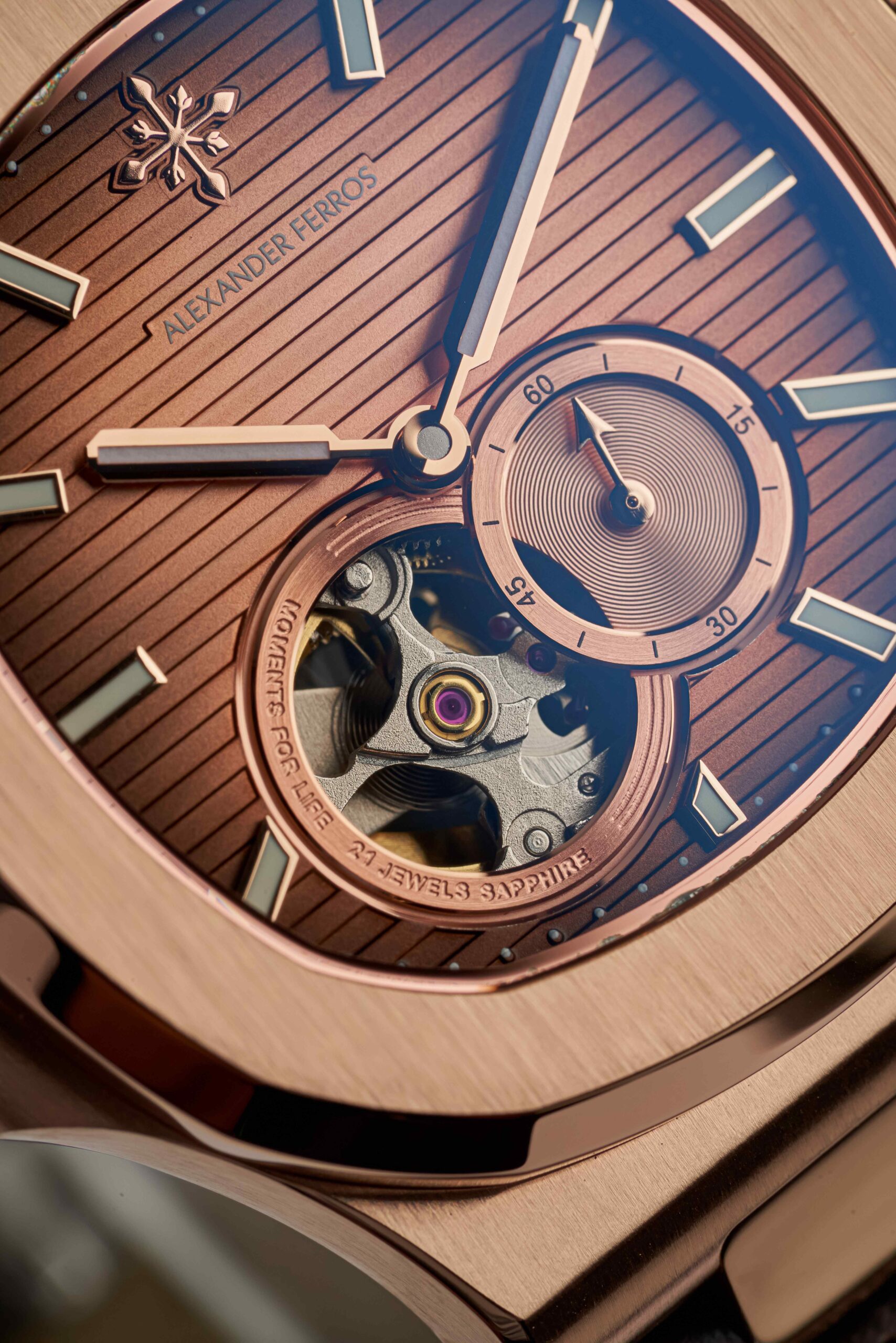 Bên cạnh thiết kế ấn tượng, Alexander Ferros 6312R-08 còn được trang bị kính sapphire cao cấp có khả năng chống trầy xước tốt, giúp mặt đồng hồ luôn trong suốt và bền đẹp theo thời gian. Khả năng chống nước 5 ATM cho phép người dùng yên tâm khi rửa tay hoặc gặp mưa nhẹ trong sinh hoạt thường ngày. Dây da màu nâu mang lại cảm giác đeo êm ái và tăng thêm vẻ ngoài lịch lãm. Sự kết hợp giữa bộ máy automatic Nhật Bản, chất liệu cao cấp và thiết kế sang trọng giúp mẫu đồng hồ này trở thành phụ kiện lý tưởng dành cho quý ông hiện đại.