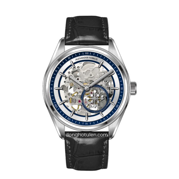 Alexander Ferros 9262S-05 là mẫu đồng hồ nam mang phong cách hiện đại và mạnh mẽ, nổi bật với thiết kế mặt số skeleton kết hợp sắc xanh dương ấn tượng. Kiểu mặt lộ cơ cho phép người đeo chiêm ngưỡng chuyển động tinh xảo của bộ máy bên trong, mang lại vẻ đẹp cơ khí đầy cuốn hút. Vỏ đồng hồ được chế tác từ thép không gỉ cao cấp màu bạc, giúp tăng độ bền và khả năng chống ăn mòn hiệu quả. Với đường kính mặt số 40mm, mẫu đồng hồ mang lại cảm giác đeo chắc chắn và phù hợp với nhiều kích thước cổ tay nam giới.
