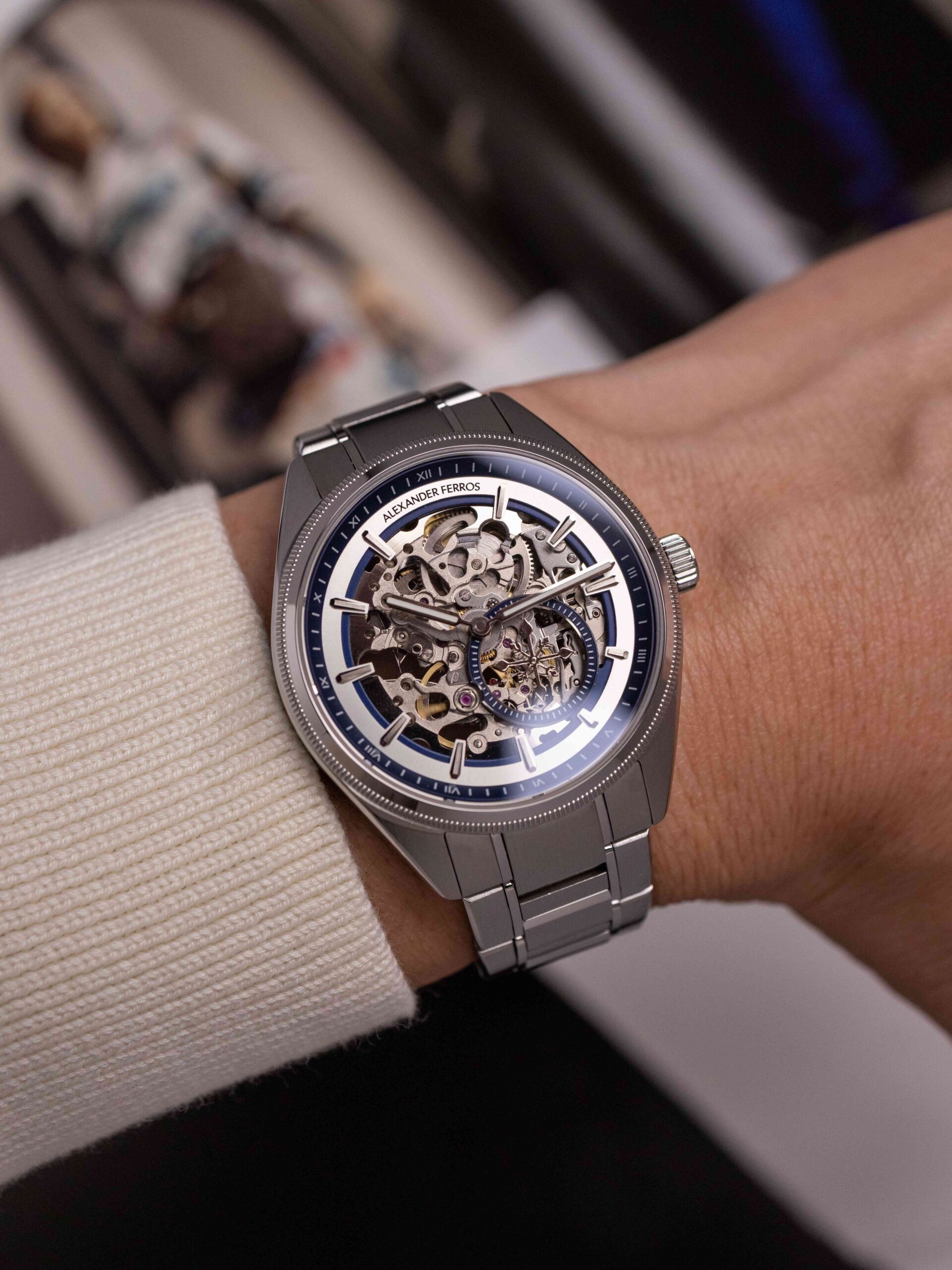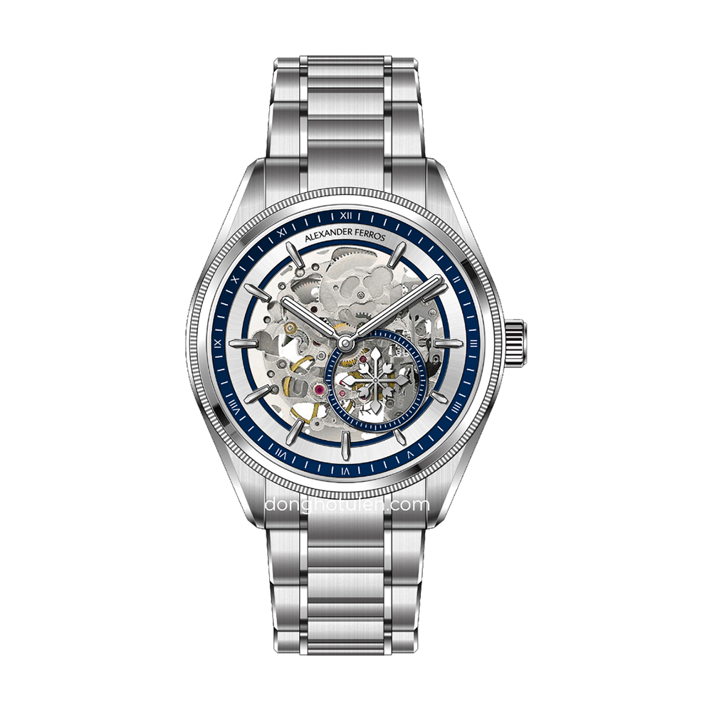 Alexander Ferros 9262S/05 là mẫu đồng hồ nam mang phong cách hiện đại và cá tính, nổi bật với thiết kế mặt số skeleton kết hợp sắc xanh dương ấn tượng. Kiểu mặt lộ cơ cho phép người đeo quan sát rõ chuyển động tinh xảo của bộ máy bên trong, tạo nên sức hút đặc biệt cho những người yêu thích đồng hồ cơ. Vỏ và dây đồng hồ được chế tác từ thép không gỉ cao cấp màu bạc, mang lại độ bền cao, khả năng chống ăn mòn tốt và giữ được vẻ sáng bóng theo thời gian. Với đường kính mặt số 40mm, mẫu đồng hồ mang lại cảm giác đeo chắc chắn và phù hợp với nhiều kích thước cổ tay nam giới.