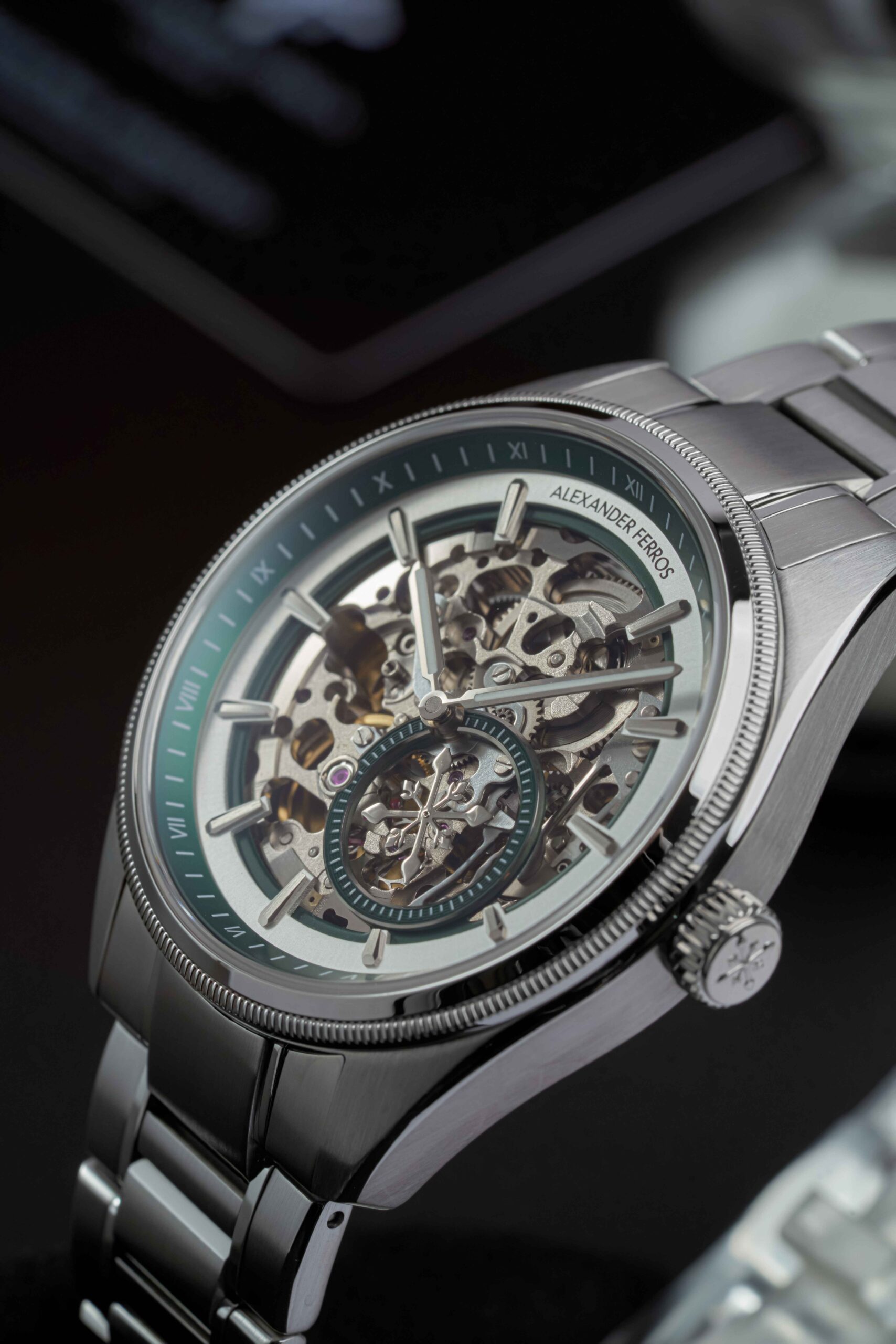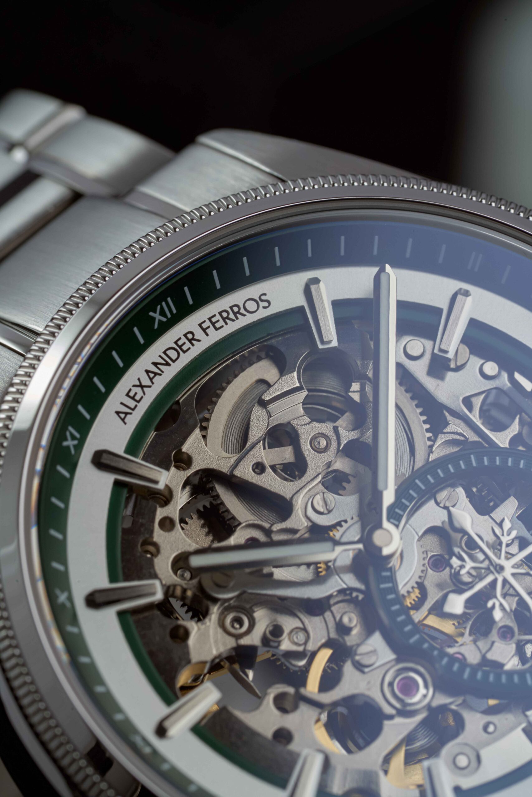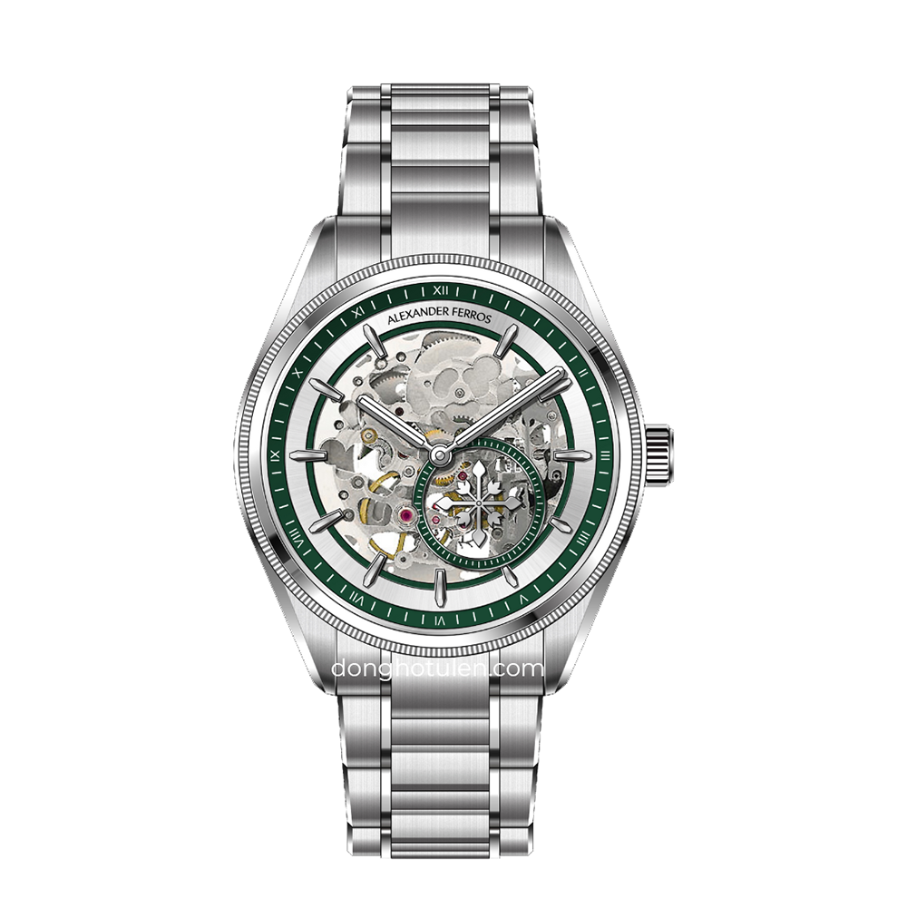 Alexander Ferros 9262S/06 là mẫu đồng hồ nam mang phong cách hiện đại và cá tính, nổi bật với thiết kế mặt số skeleton kết hợp sắc xanh lá độc đáo. Kiểu mặt lộ cơ giúp người đeo có thể quan sát chuyển động tinh xảo của bộ máy bên trong, tạo nên vẻ đẹp cơ khí đầy cuốn hút. Vỏ và dây đồng hồ được chế tác từ thép không gỉ cao cấp màu bạc, mang lại độ bền cao và khả năng chống ăn mòn hiệu quả. Với đường kính mặt số 40mm, mẫu đồng hồ mang đến cảm giác đeo chắc chắn và phù hợp với nhiều kích thước cổ tay nam giới.