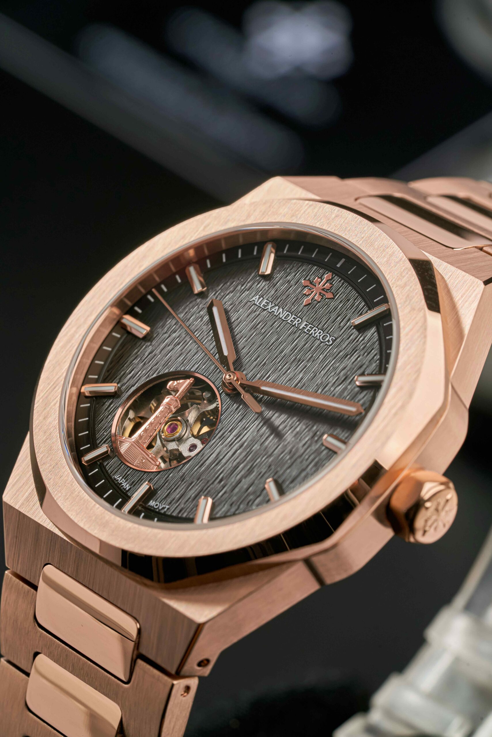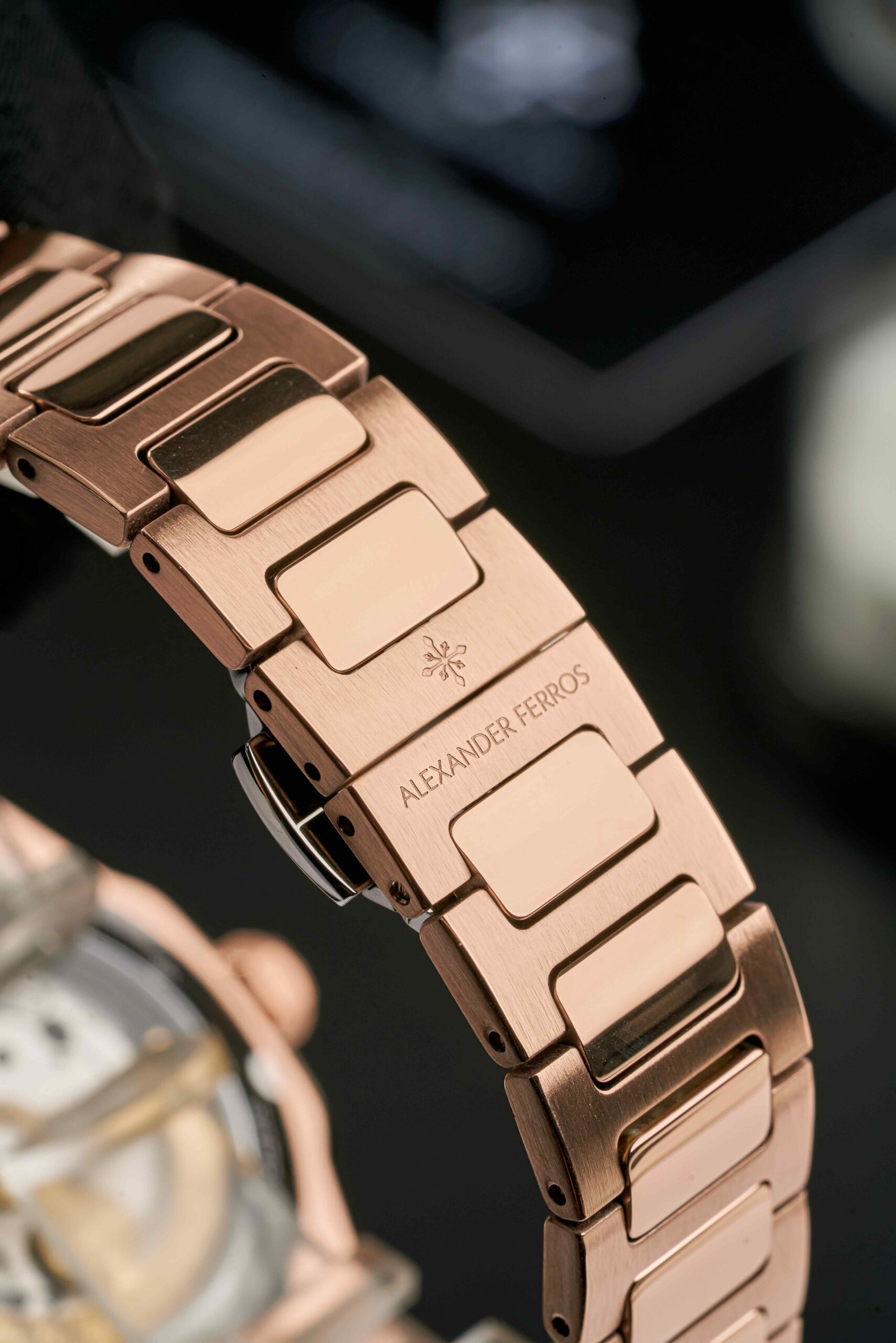 Alexander Ferros 9292R/01 là mẫu đồng hồ nam mang phong cách sang trọng và mạnh mẽ, phù hợp với những quý ông yêu thích sự nổi bật nhưng vẫn giữ được nét thanh lịch. Thiết kế ấn tượng với mặt số màu đen cổ điển kết hợp cùng viền và dây vàng hồng sang trọng, tạo nên tổng thể hài hòa và đẳng cấp. Vỏ và dây đồng hồ được chế tác từ thép không gỉ cao cấp, mang lại độ bền cao, khả năng chống ăn mòn tốt và giữ được độ sáng bóng theo thời gian. Với đường kính mặt số 39mm, chiếc đồng hồ mang lại cảm giác đeo vừa vặn và thoải mái cho nhiều kích thước cổ tay.