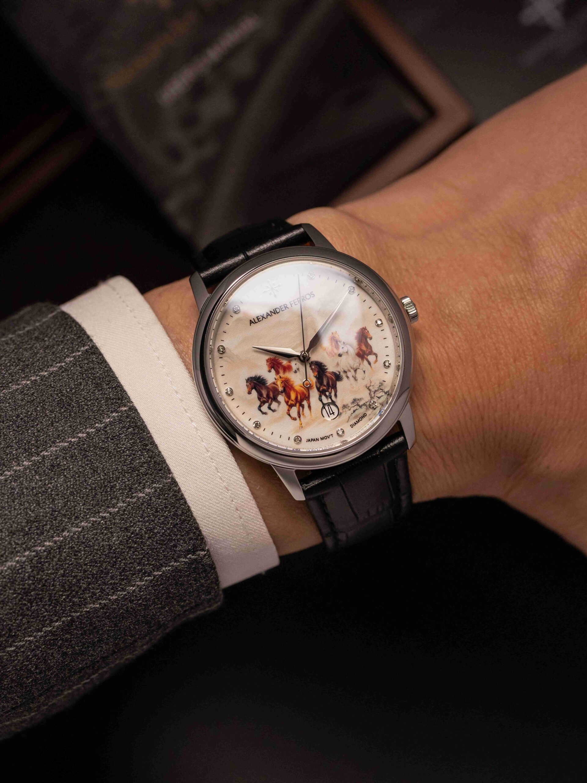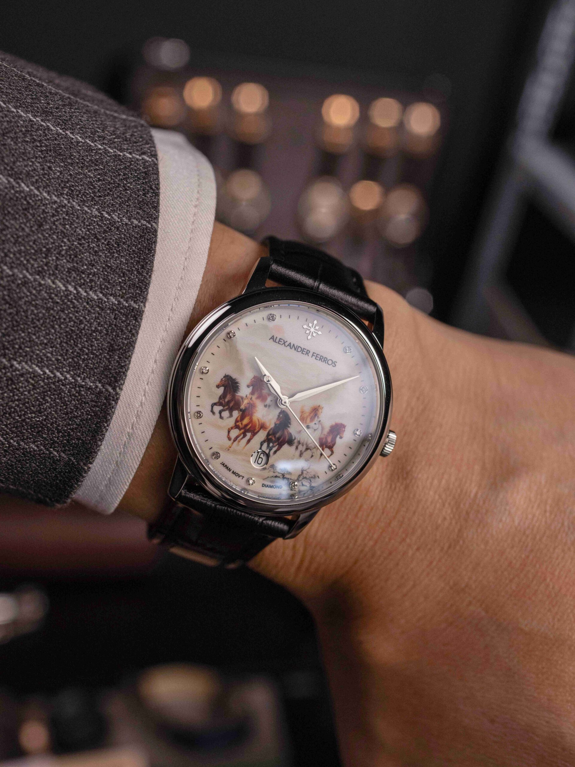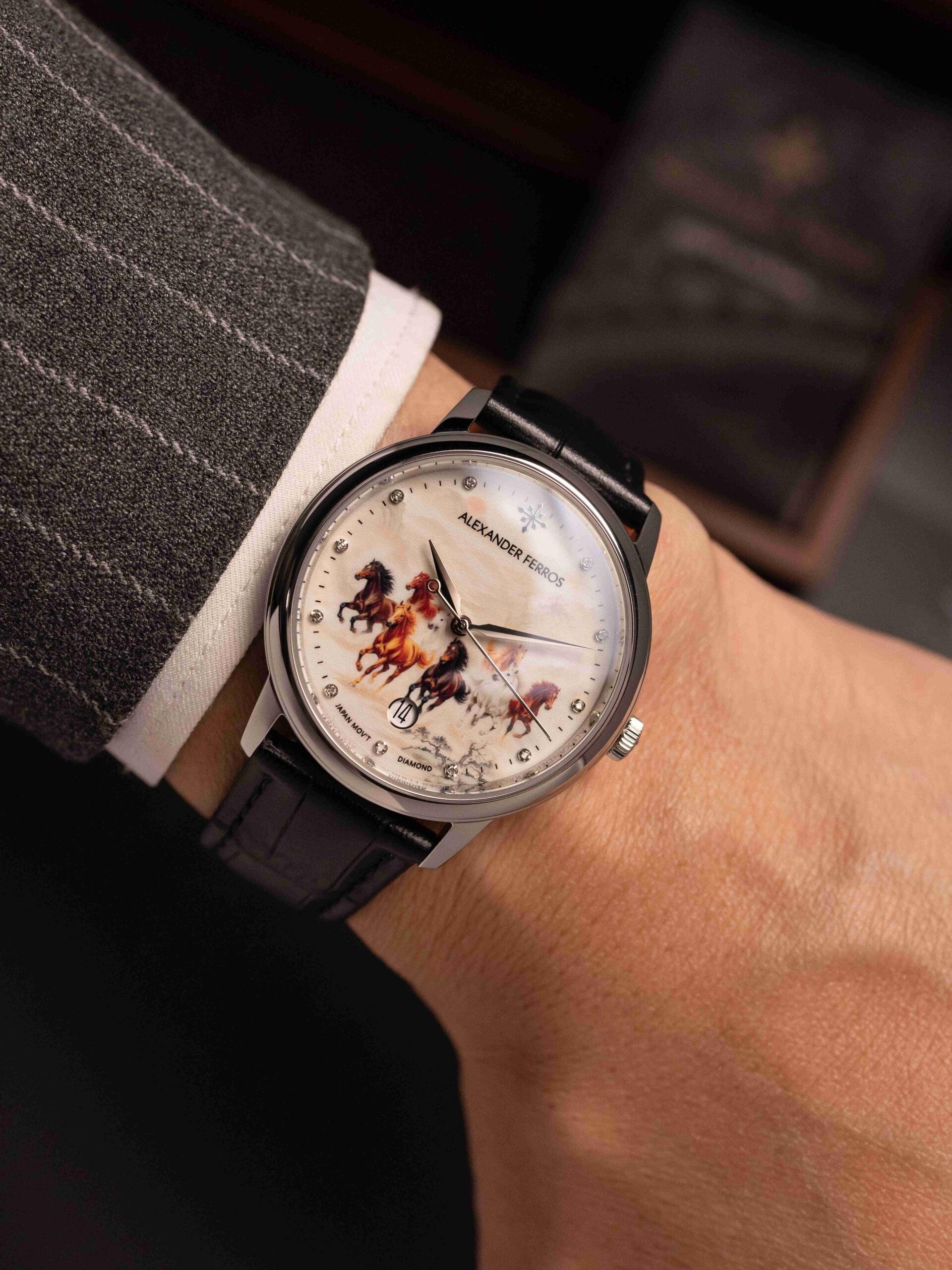Alexander Ferros 9302SD-26 là mẫu đồng hồ nam mang phong cách nghệ thuật và sang trọng, nổi bật với mặt số trắng được thiết kế họa tiết “Bát Mã Truy Phong” đầy ý nghĩa. Hình ảnh tám chú ngựa phi nước đại tượng trưng cho sự thành công, may mắn và thăng tiến trong công việc, vì vậy mẫu đồng hồ này rất được ưa chuộng bởi những người yêu thích phong thủy và giá trị biểu tượng. Vỏ đồng hồ được chế tác từ thép không gỉ cao cấp kết hợp cùng viền bạc inox thanh lịch, tạo nên tổng thể tinh tế và đẳng cấp. Với đường kính mặt số 38.5mm, chiếc đồng hồ mang lại cảm giác đeo vừa vặn và thoải mái trên cổ tay.
