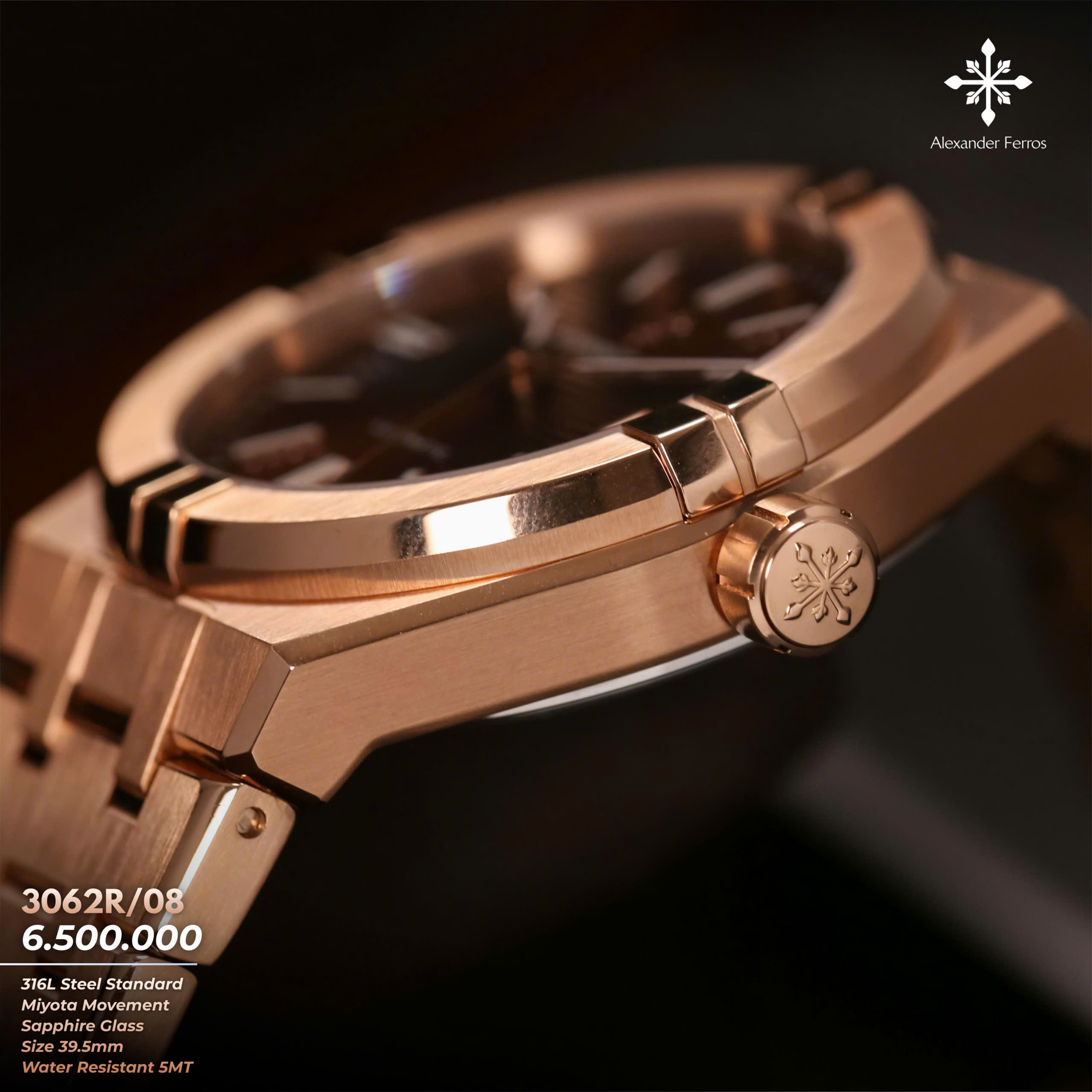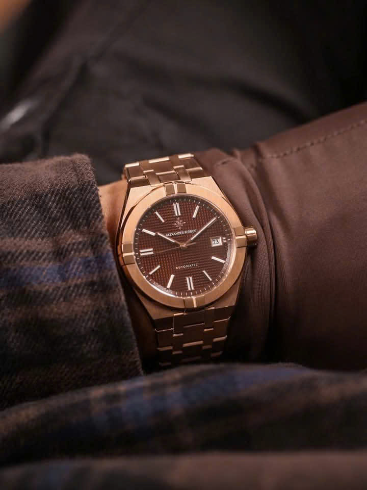 Alexander Ferros 3062R-08 là chiếc đồng hồ nam sang trọng với mặt số nâu kết hợp viền và dây thép mạ vàng hồng rosegold tinh tế. Kích thước 39mm cùng bộ vỏ thép không gỉ vừa vặn cổ tay, mang lại vẻ ngoài lịch lãm, đẳng cấp. Chất liệu kính sapphire bảo vệ mặt số khỏi trầy xước, đồng thời tôn lên độ bóng sáng của màu vàng hồng. Đây là lựa chọn hoàn hảo cho quý ông muốn khẳng định phong thái trưởng thành và tinh tế trong mọi dịp.