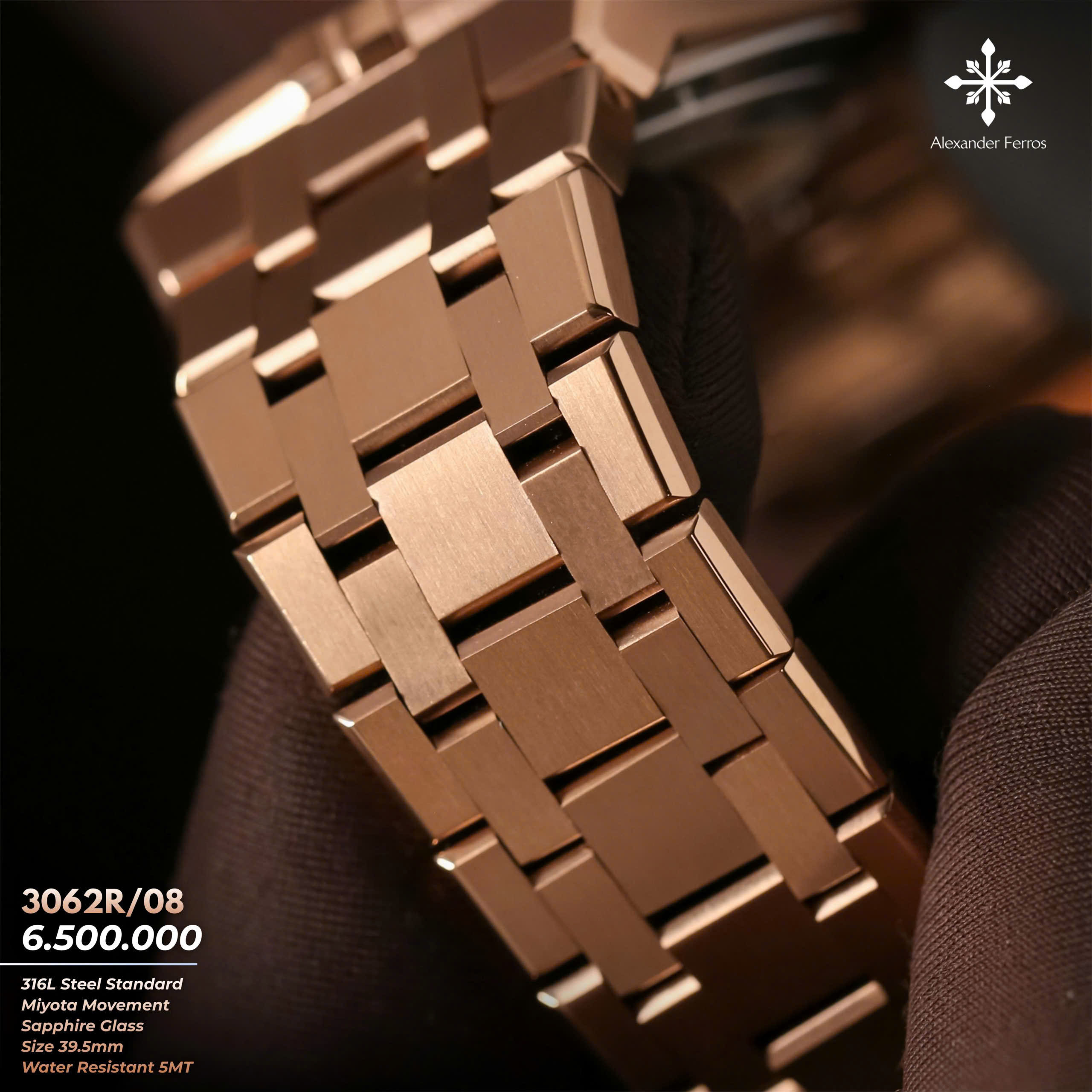 Mẫu Alexander Ferros 3062R-08 trang bị bộ máy cơ tự động xuất xứ Nhật Bản, vận hành bền bỉ và chính xác, không cần pin. Chức năng giờ, phút, giây cùng lịch ngày được bố trí trực quan, dễ theo dõi. Khả năng chịu nước 5ATM giúp đồng hồ an toàn khi rửa tay hoặc đi mưa nhẹ. Dây và vỏ thép không gỉ chắc chắn, cùng mặt kính sapphire bền bỉ, đảm bảo sử dụng lâu dài mà vẫn giữ được hình thức ban đầu.