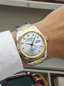 Về thiết kế và ngoại diện: Carnival 8131G-CV-T là sự giao thoa ấn tượng giữa nét cổ điển lịch lãm và hơi thở hiện đại. Đồng hồ sở hữu mặt số tròn kích thước 40mm tiêu chuẩn, rất vừa vặn với cổ tay nam giới Á Đông. Điểm nhấn nổi bật nhất nằm ở mặt dial màu trắng sang trọng, được tô điểm bởi các cọc số đính đá lấp lánh tựa kim cương, kết hợp cùng bộ kim sắc nét giúp việc xem giờ trở nên dễ dàng và thu hút. Sự phối màu Demi giữa sắc bạc sáng bóng và vàng hồng (Rose Gold) thời thượng trên dây đeo và niềng bezel tạo nên vẻ ngoài quyền lực nhưng không quá phô trương, phù hợp để tạo điểm nhấn cho mọi bộ trang phục.