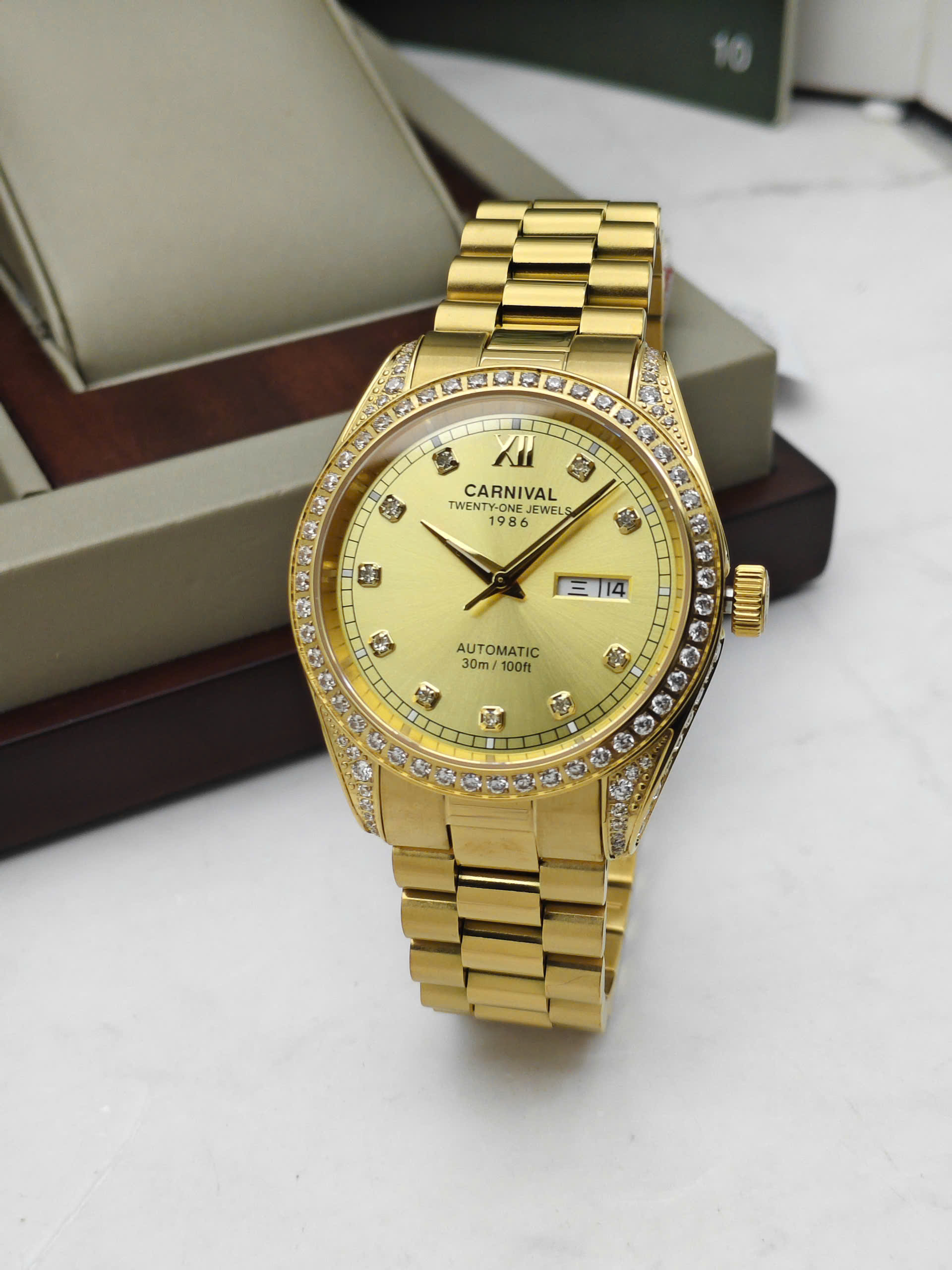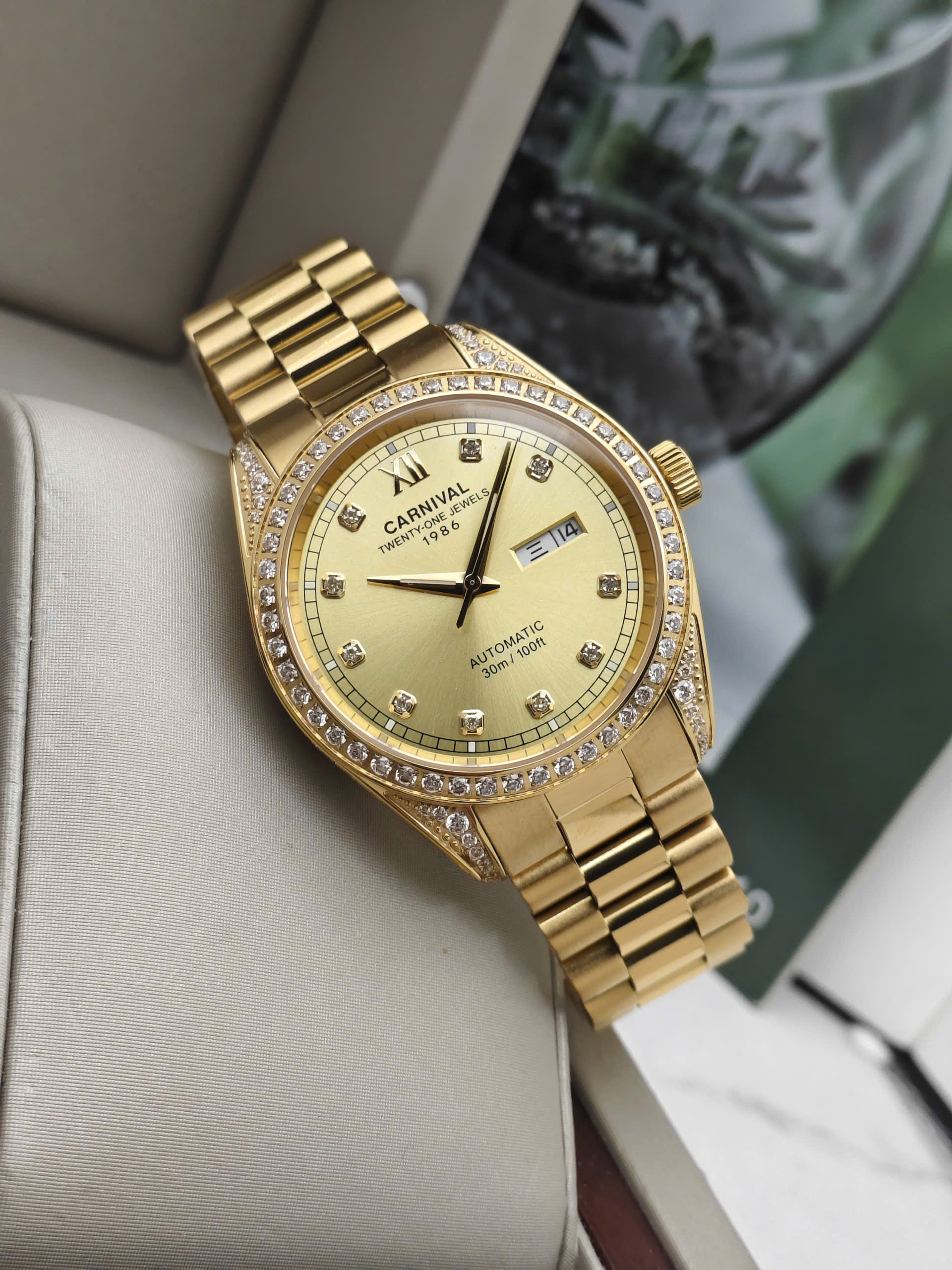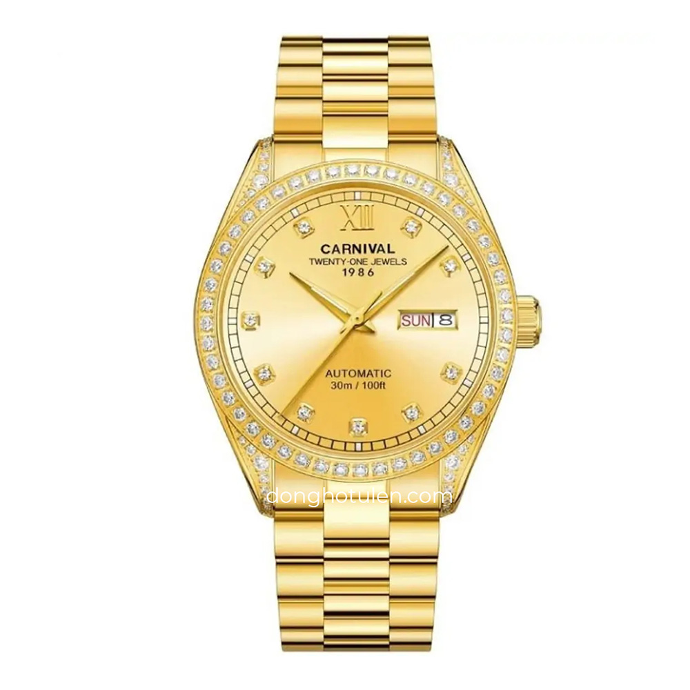 Đồng hồ Carnival 8907G-VV-V được trang bị cỗ máy Automatic. Mặt số màu Trắng với các cọc số kim cương đính nổi trên mặt đồng hồ mang đến sự sang trọng cho người đeo. Đồng hồ được thiết kế 3 kim có tông màu vàng với chức năng giờ, phút, giây. Lịch ngày được bài trí ở góc 3 giờ rất tiện dụng. Xung quanh viền mặt đồng hồ đính kim cương lấp lánh.