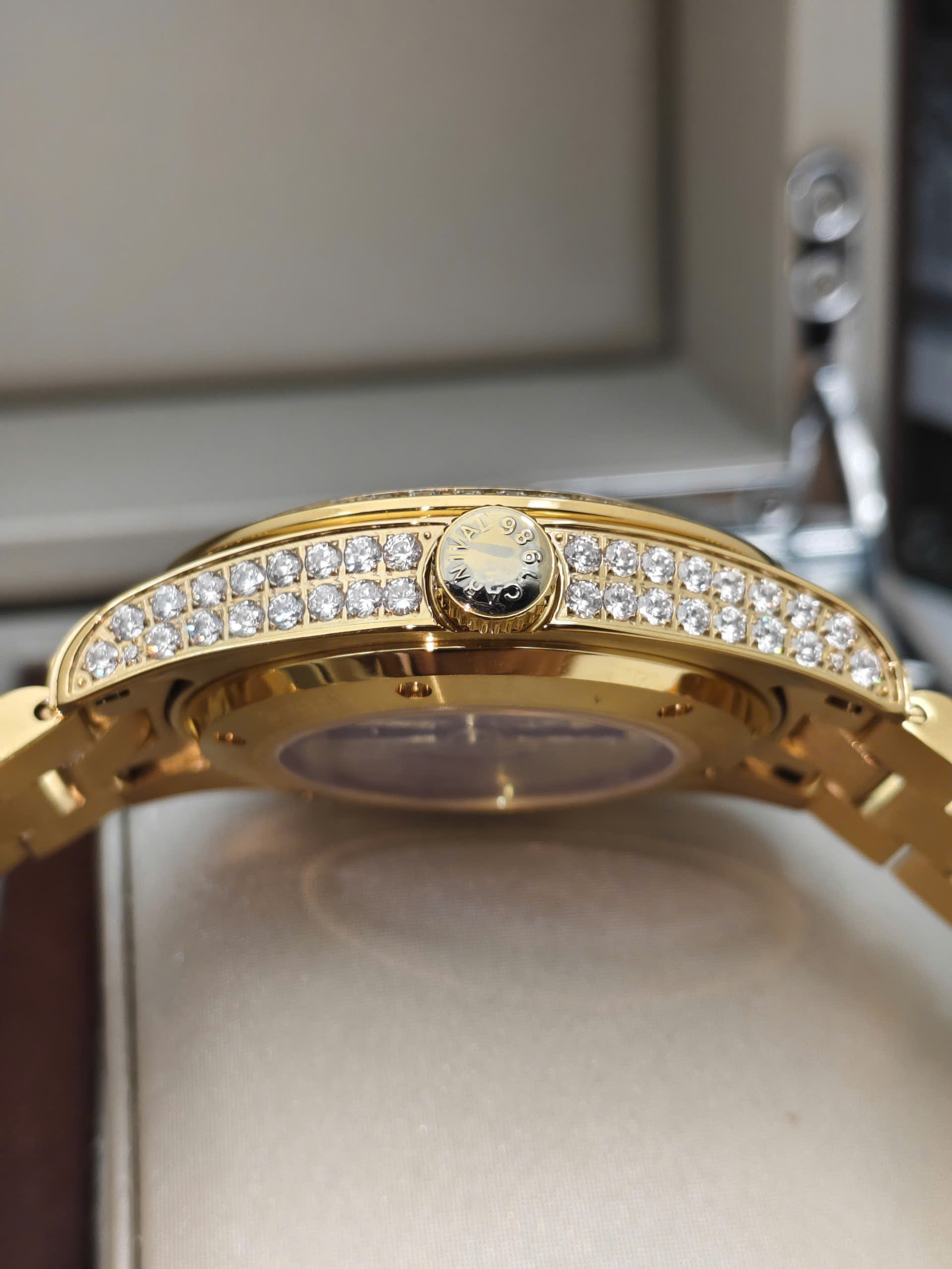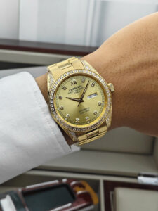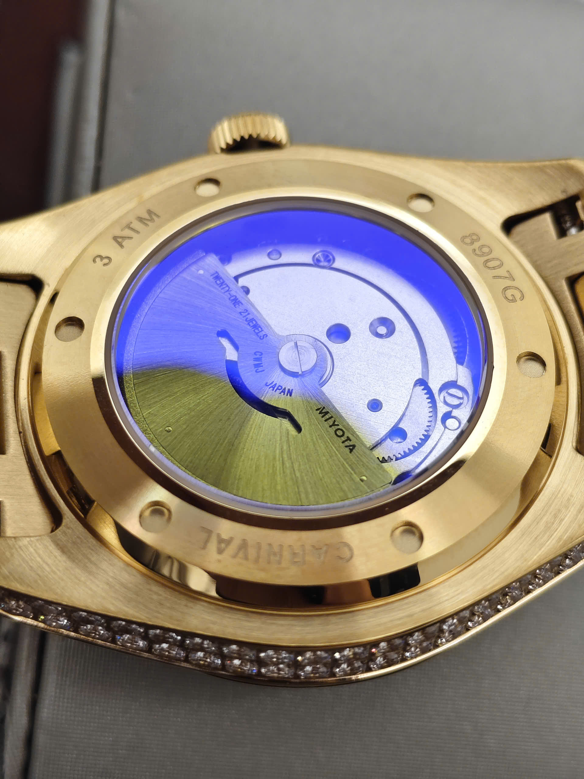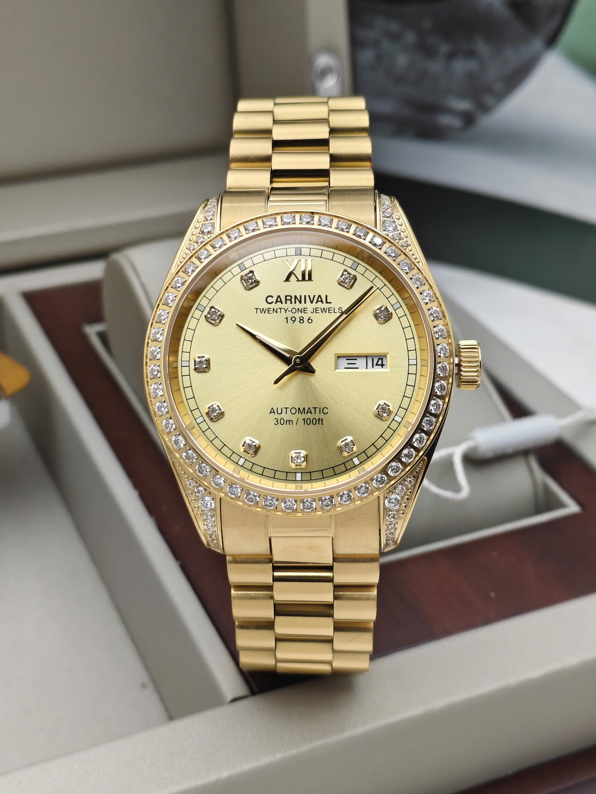 Đồng hồ Carnival 8907G-VV-V được trang bị cỗ máy Automatic. Mặt số màu Trắng với các cọc số kim cương đính nổi trên mặt đồng hồ mang đến sự sang trọng cho người đeo. Đồng hồ được thiết kế 3 kim có tông màu vàng với chức năng giờ, phút, giây. Lịch ngày được bài trí ở góc 3 giờ rất tiện dụng. Xung quanh viền mặt đồng hồ đính kim cương lấp lánh.